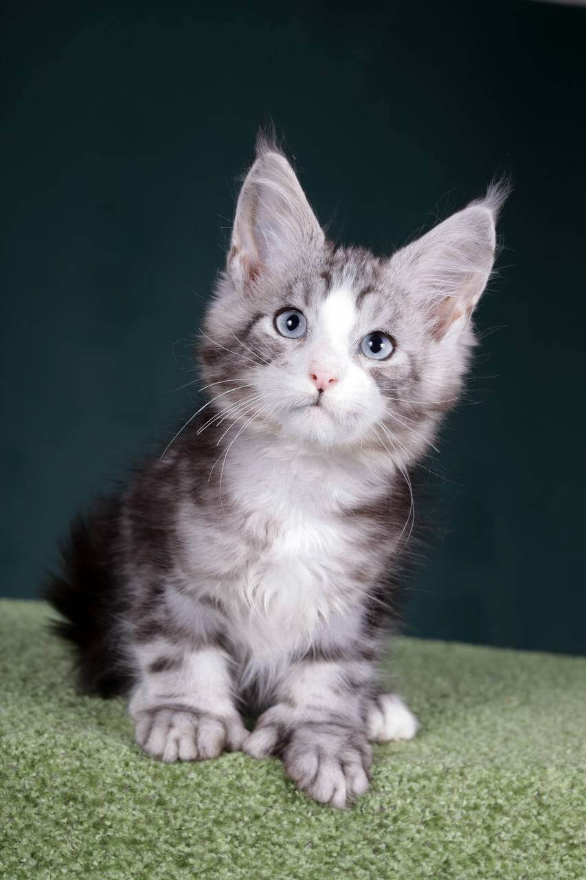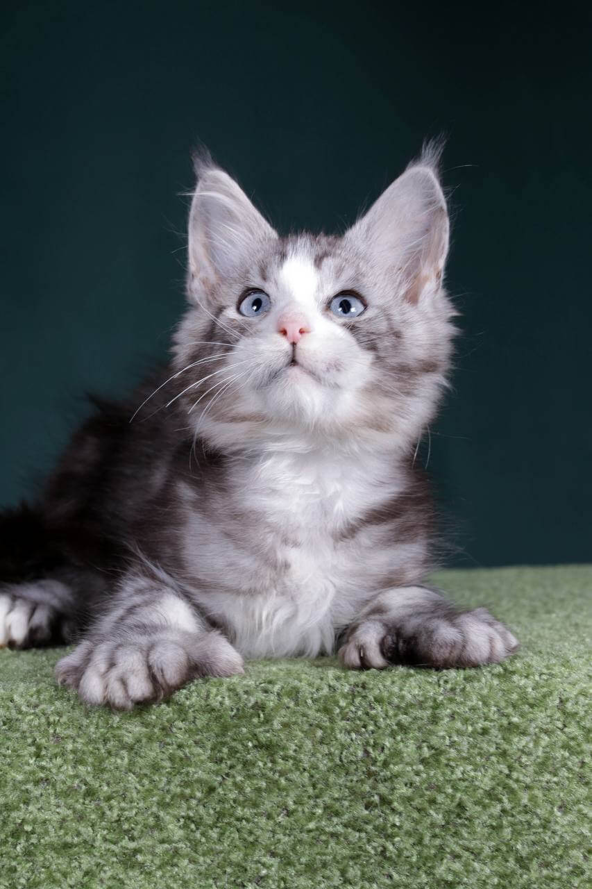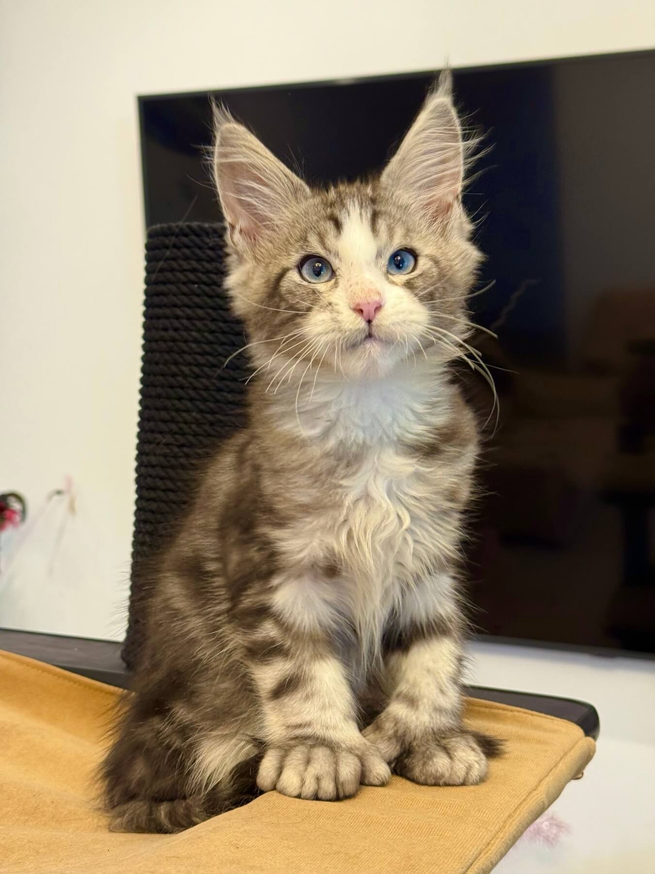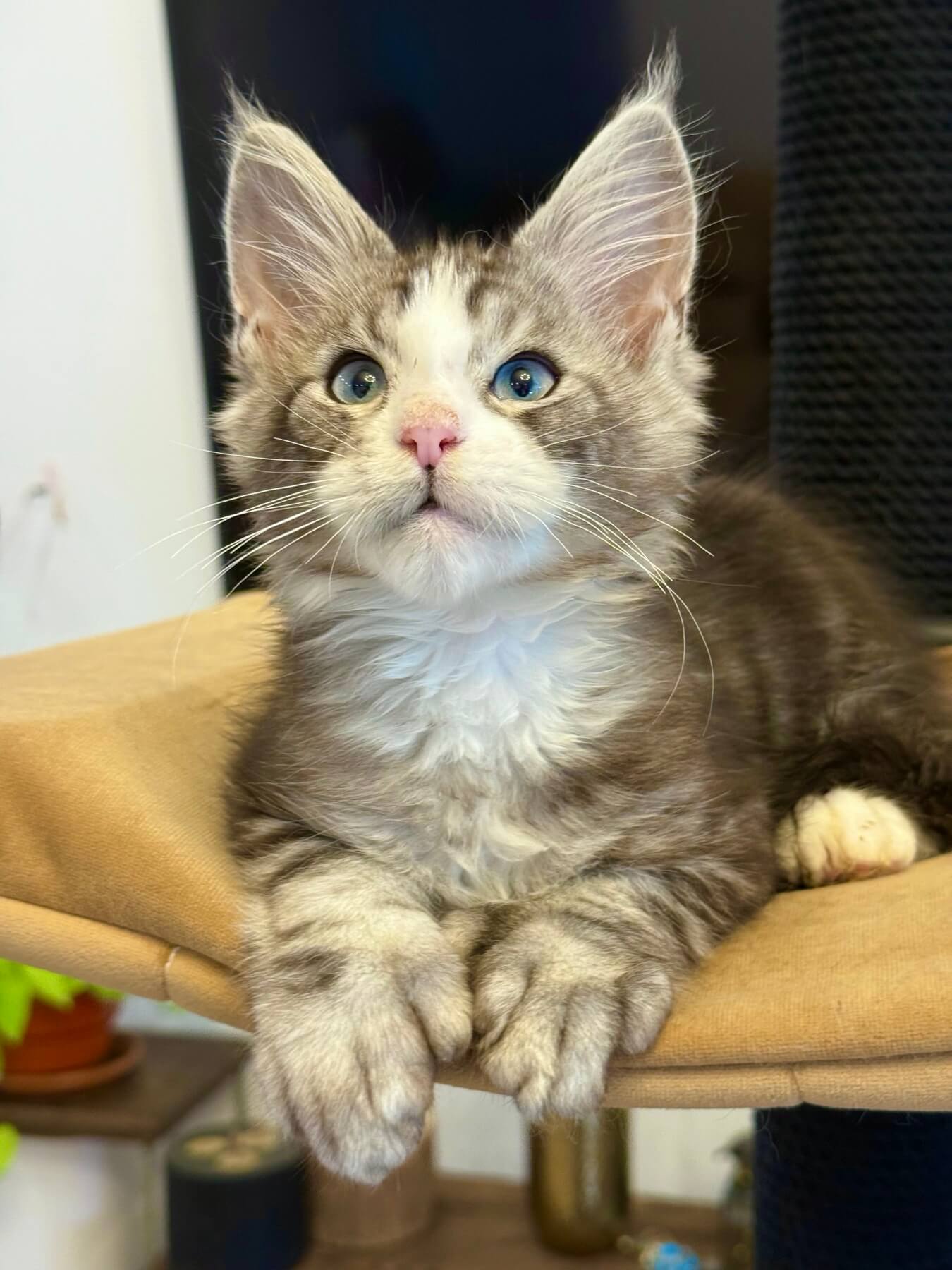 Meet Osman, a stunning male Maine Coon kitten with show-quality potential. This handsome little guy boasts a striking black silver tabby blotched coat and mesmerizing blue eyes. Born on July 27, 2025, Osman comes from champion bloodlines and is registered, ready to charm his way into your heart. He’ll be ready to leave the breeder’s home on November 27, 2025, just in time to become your holiday companion.