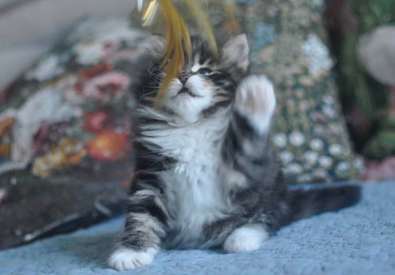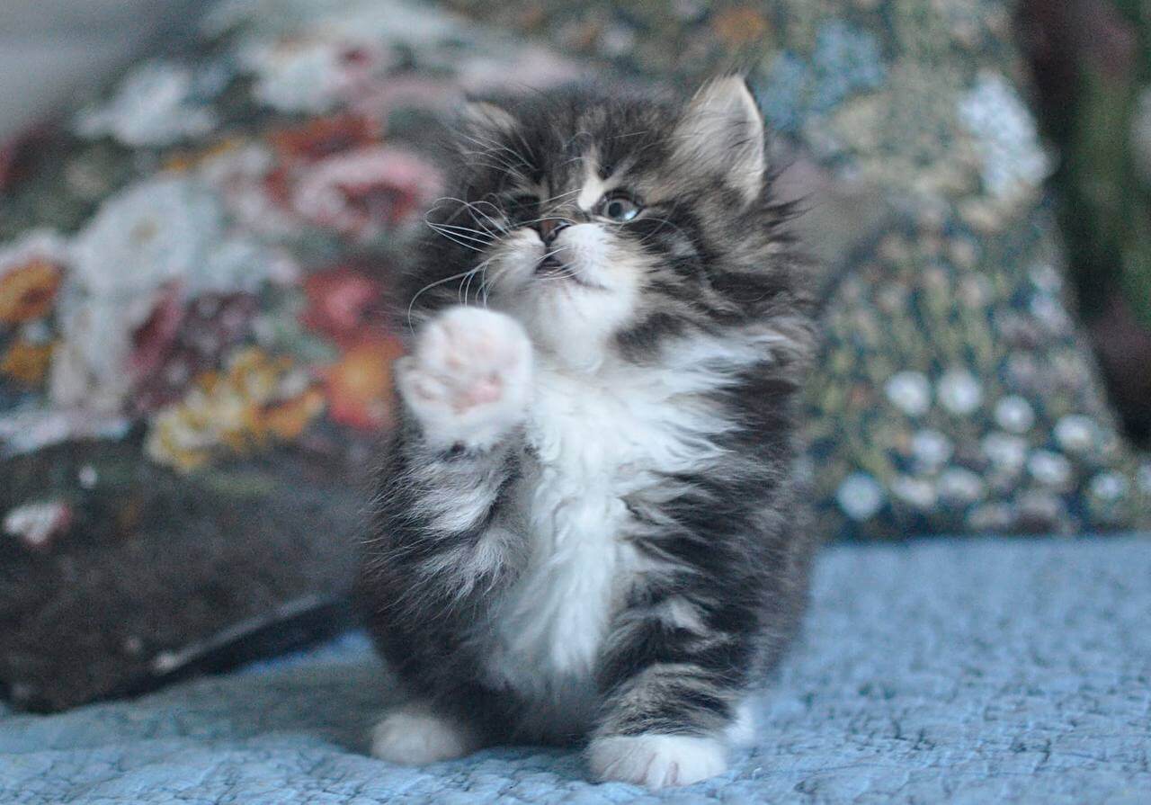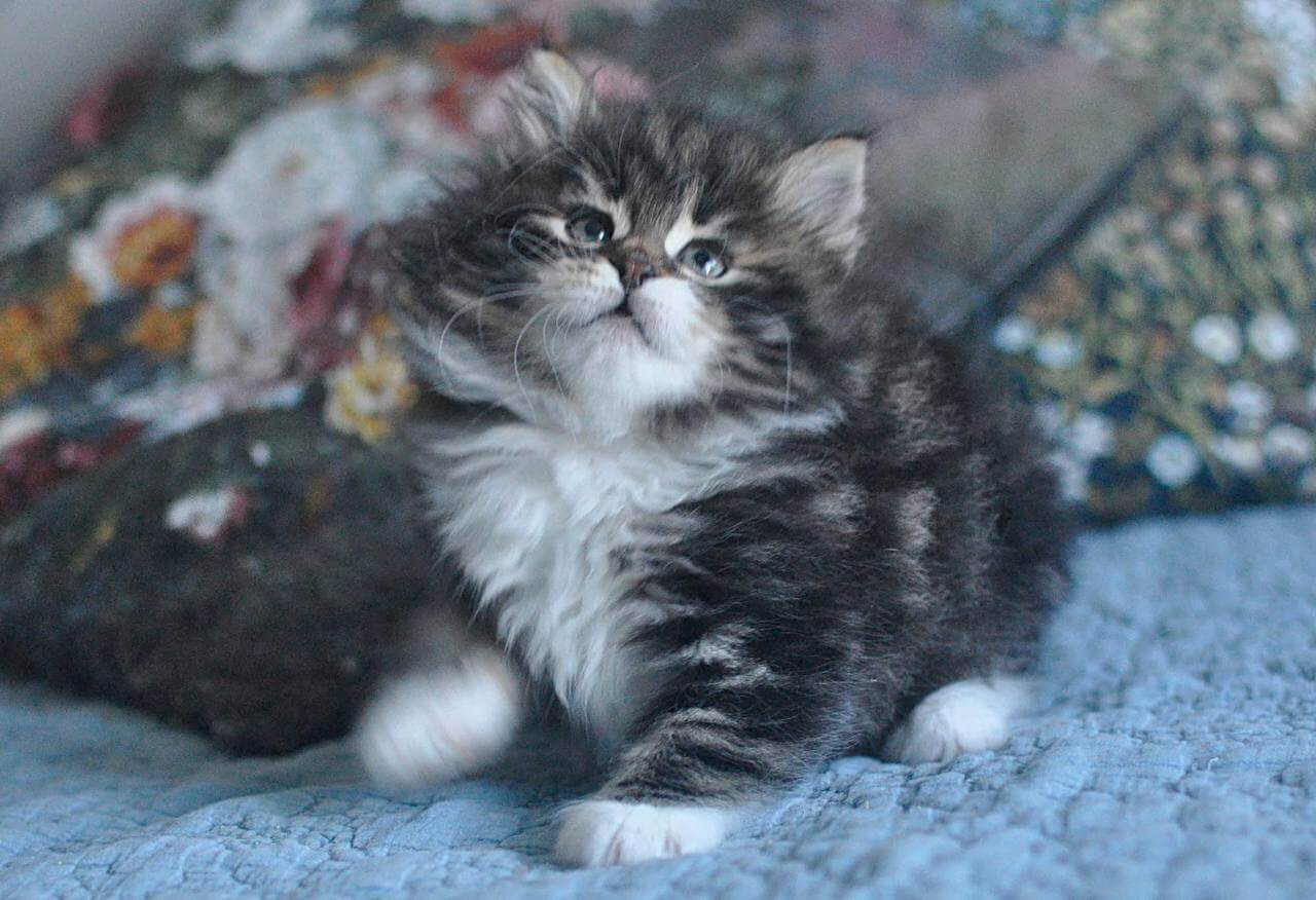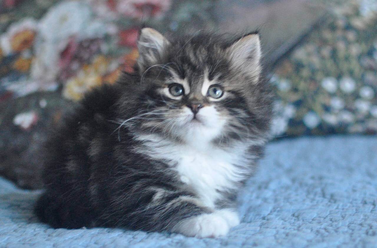 Ostara, our Black Tabby Blotched With White Siberian kitten, is unforgettable from the moment you meet her. Her lush, dense coat ripples with subtle contrast, the black swirls softened by white patches that invite your hand. When she looks up at you, Ostara’s yellow eyes glow with a rare golden warmth, deep with curiosity and gentle promise.