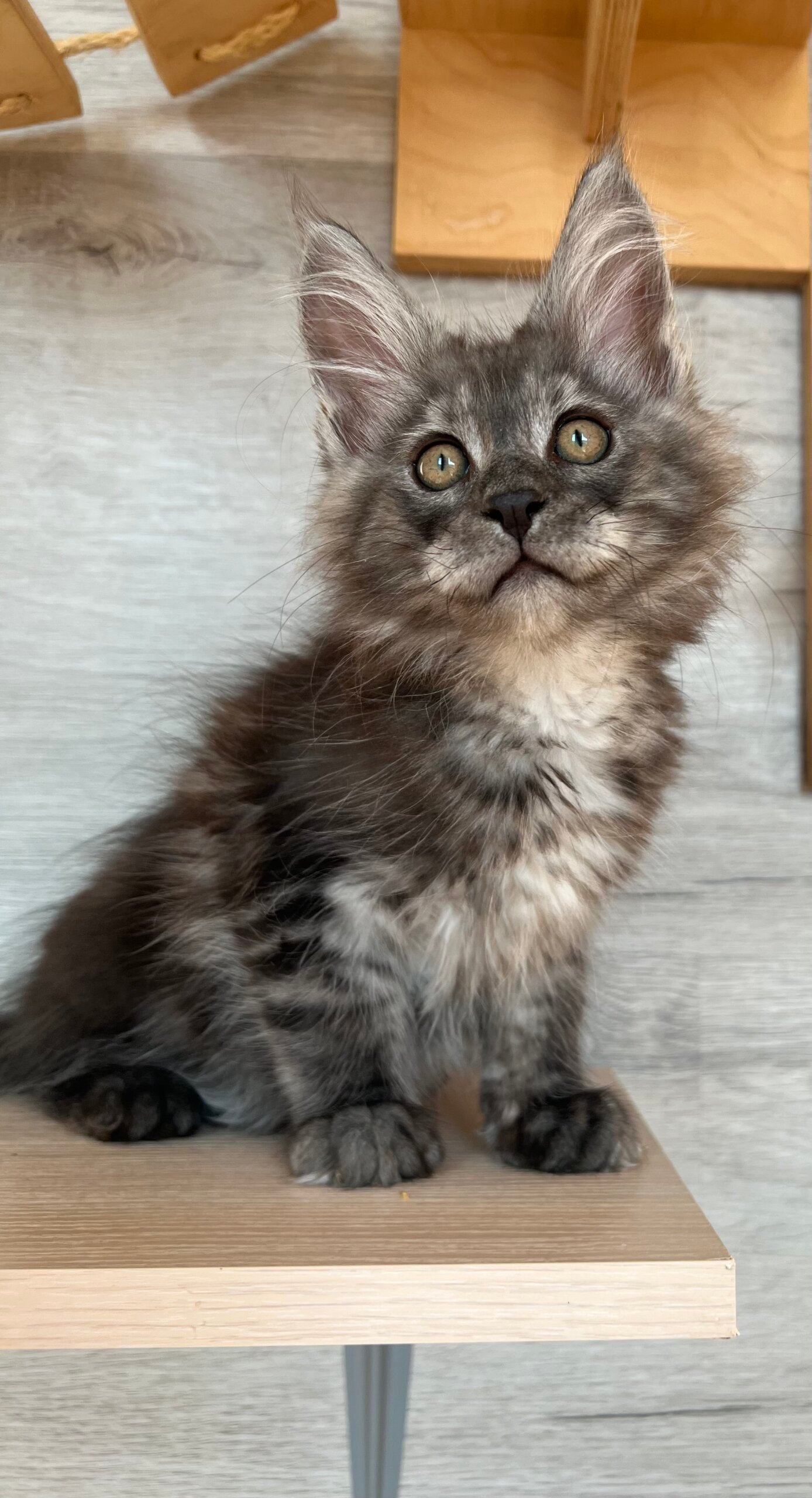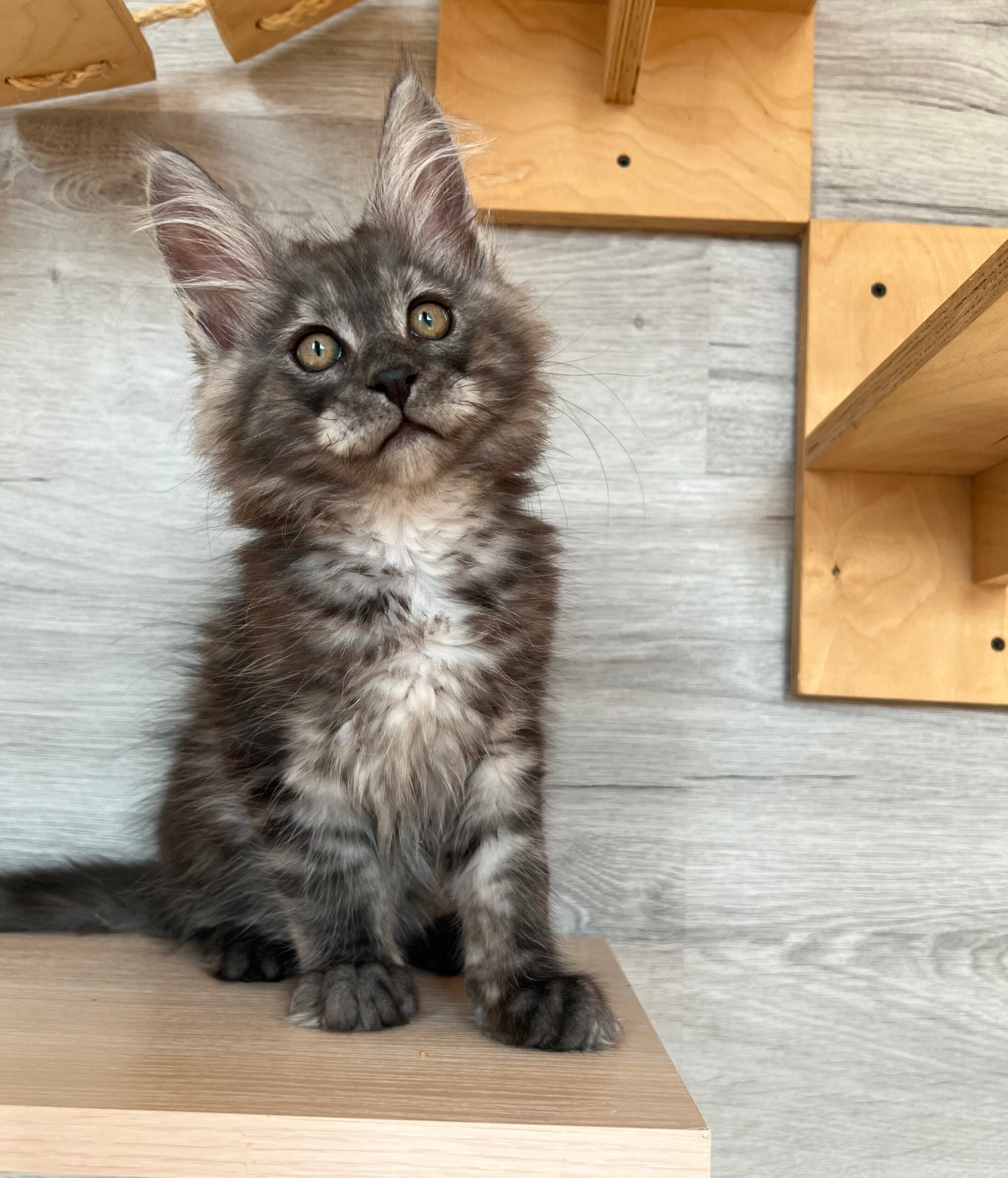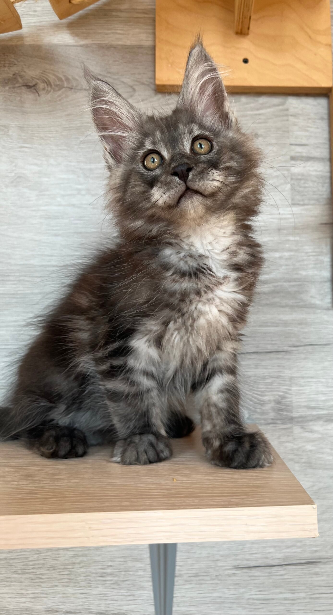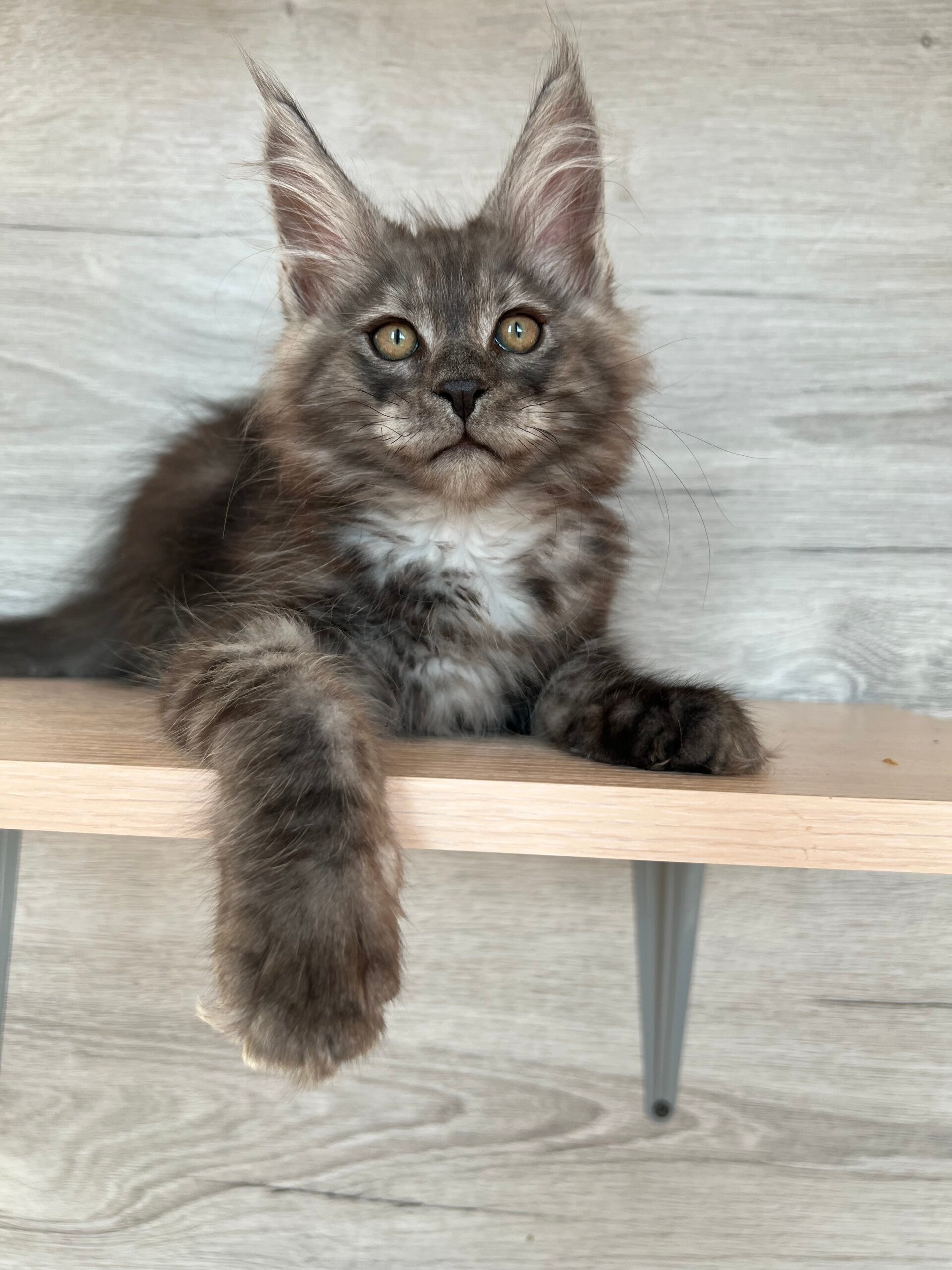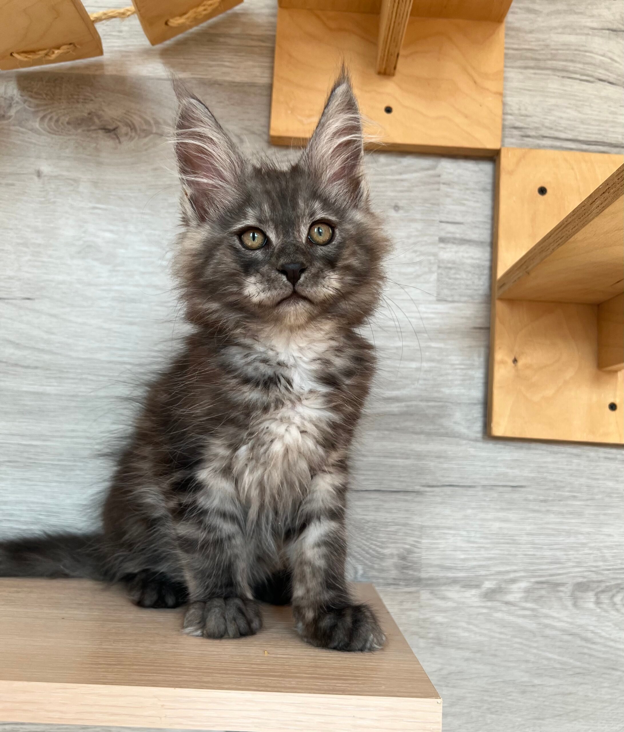 Meet Patrick, an enchanting Maine Coon prince ready to weave himself into the heart of your family. With his mesmerizing black silver coat and soulful yellow eyes, Patrick promises warmth and wonder in every cuddle—he’s the kind of kitten whose gentle purrs and plush fur turn ordinary days into pure joy.