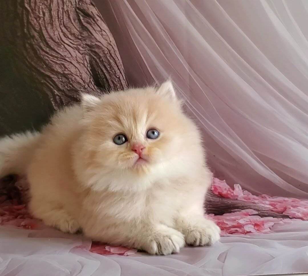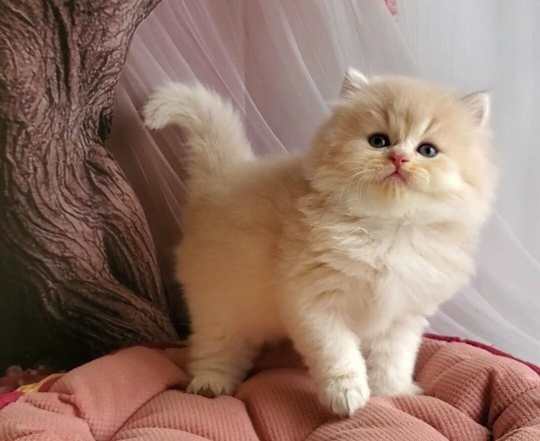 Meet Peach, a Blue Golden Shell British Longhair kitten whose luminous green eyes greet you like fresh spring leaves glinting in morning sun. As his luxurious, cloud-soft coat shimmers with gold dusted blue, you’ll feel an instant connection each time you run your fingers through his gentle fur. He sits calmly beside you, purring, his presence both regal and comforting.