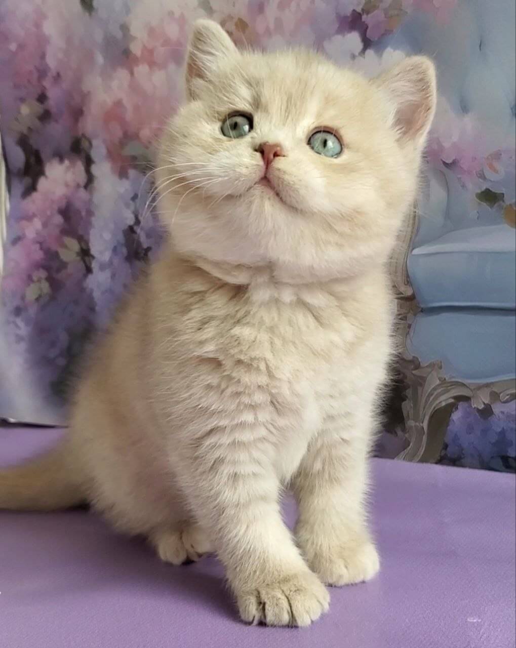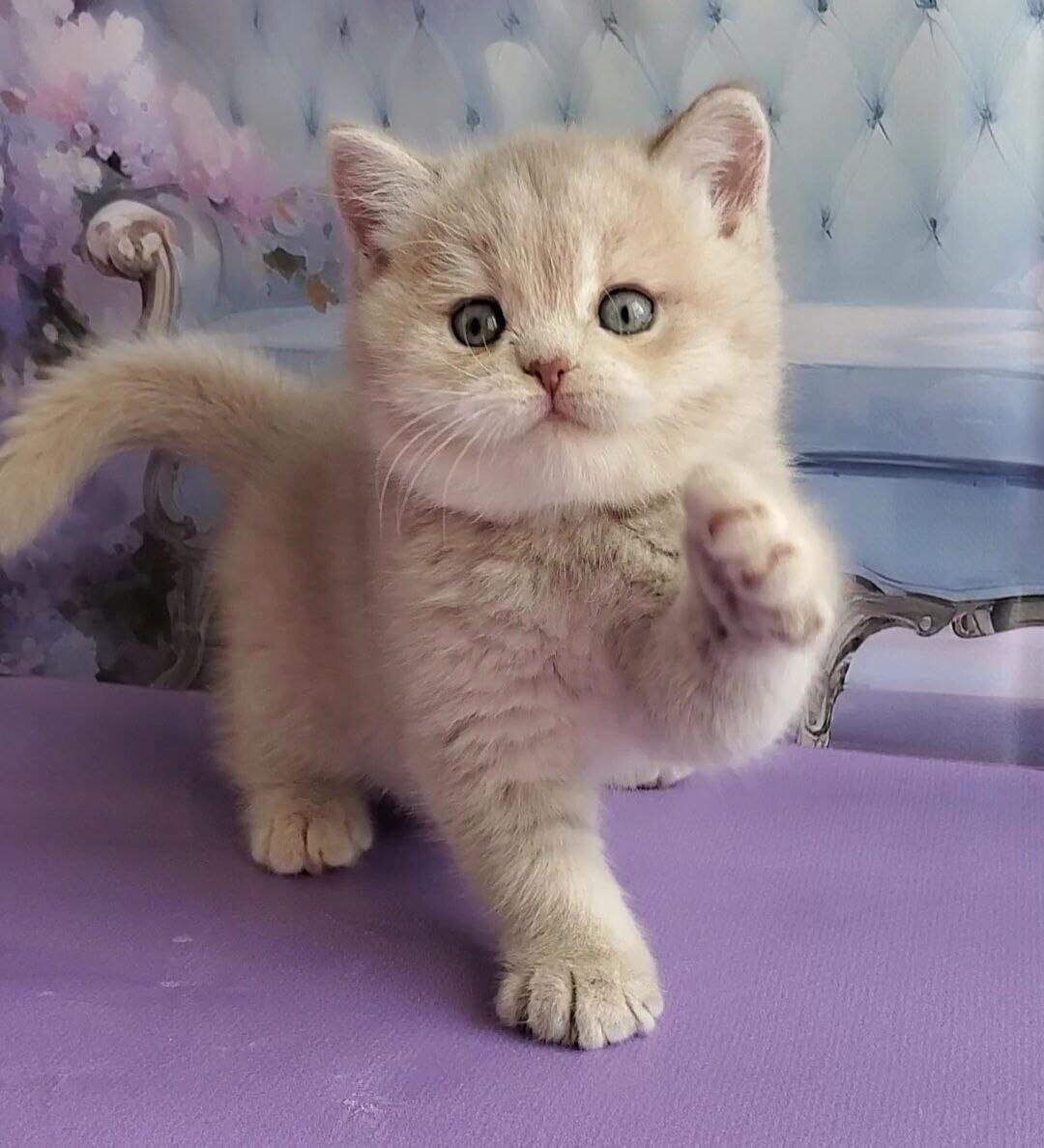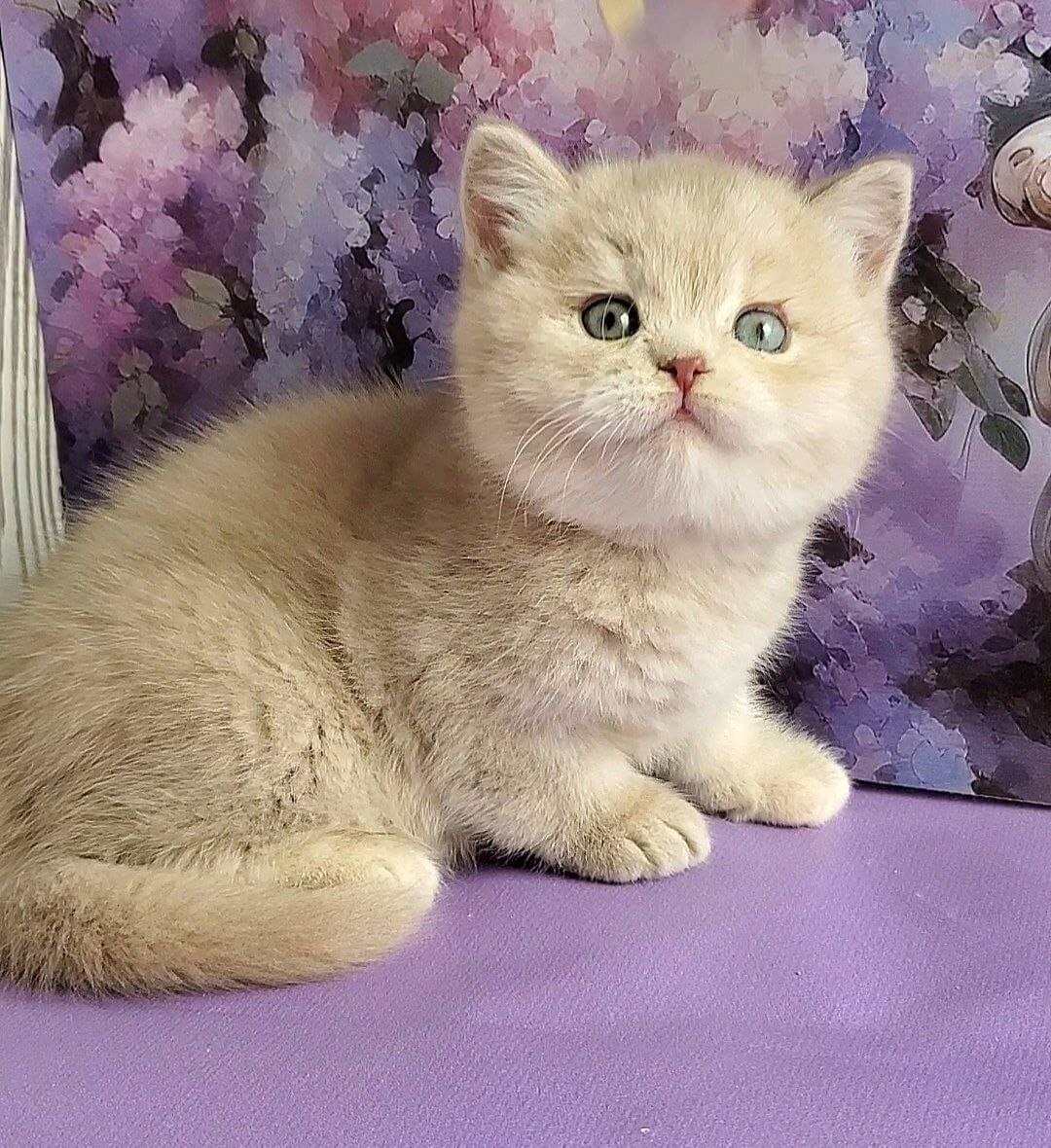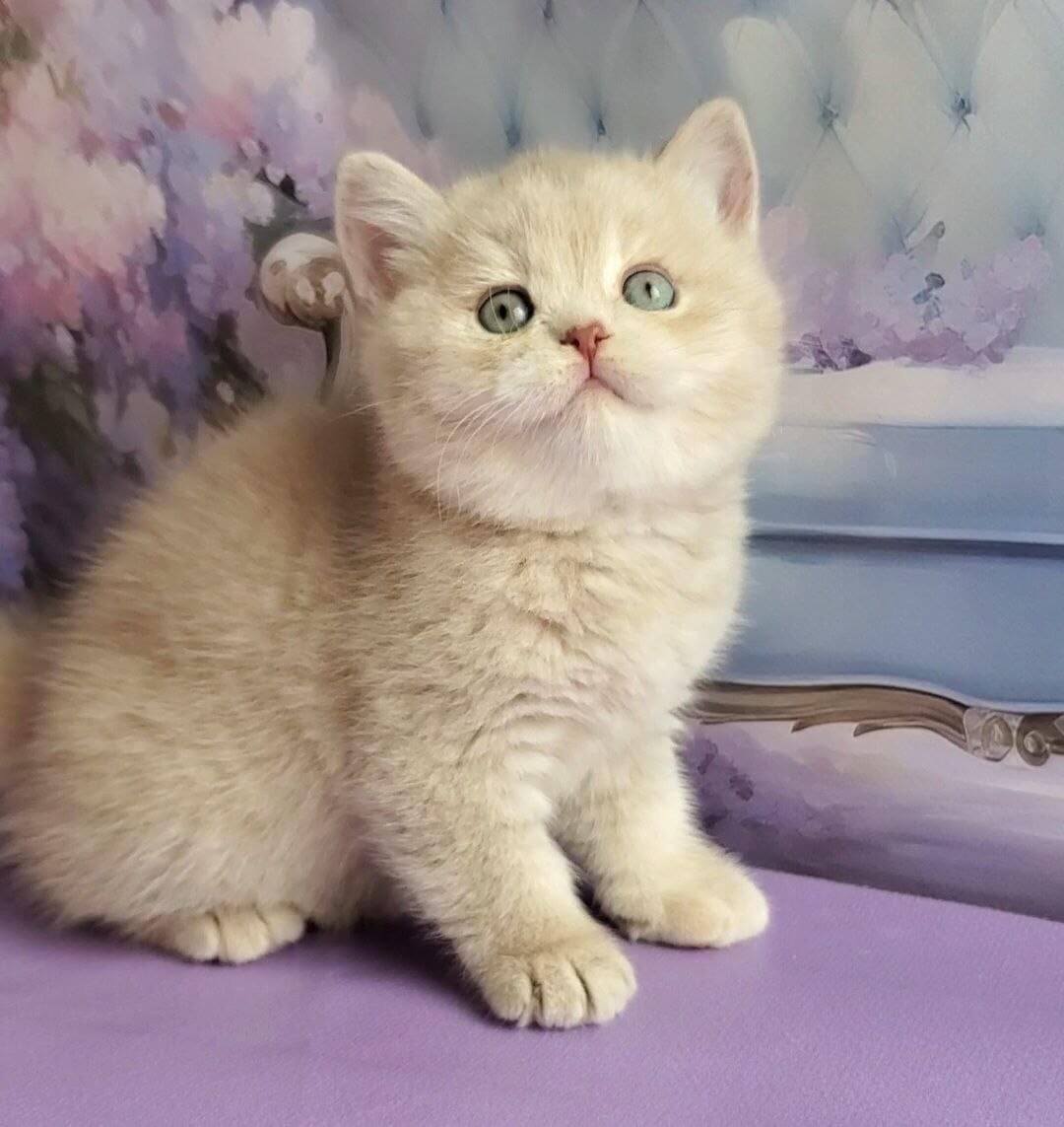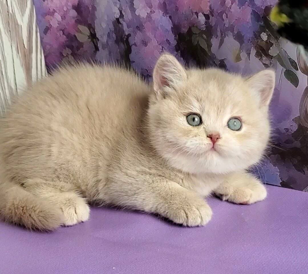 Like a living work of art, Queenie is a Lilac Golden Shaded British Shorthair kitten whose remarkable odd-eyed gaze—one amber, one celadon green—captures you with a single look. Her plush, powder-soft coat ripples under your fingers, thicker and warmer than velvet, and she nestles close with dignified confidence only a true British Shorthair can display.