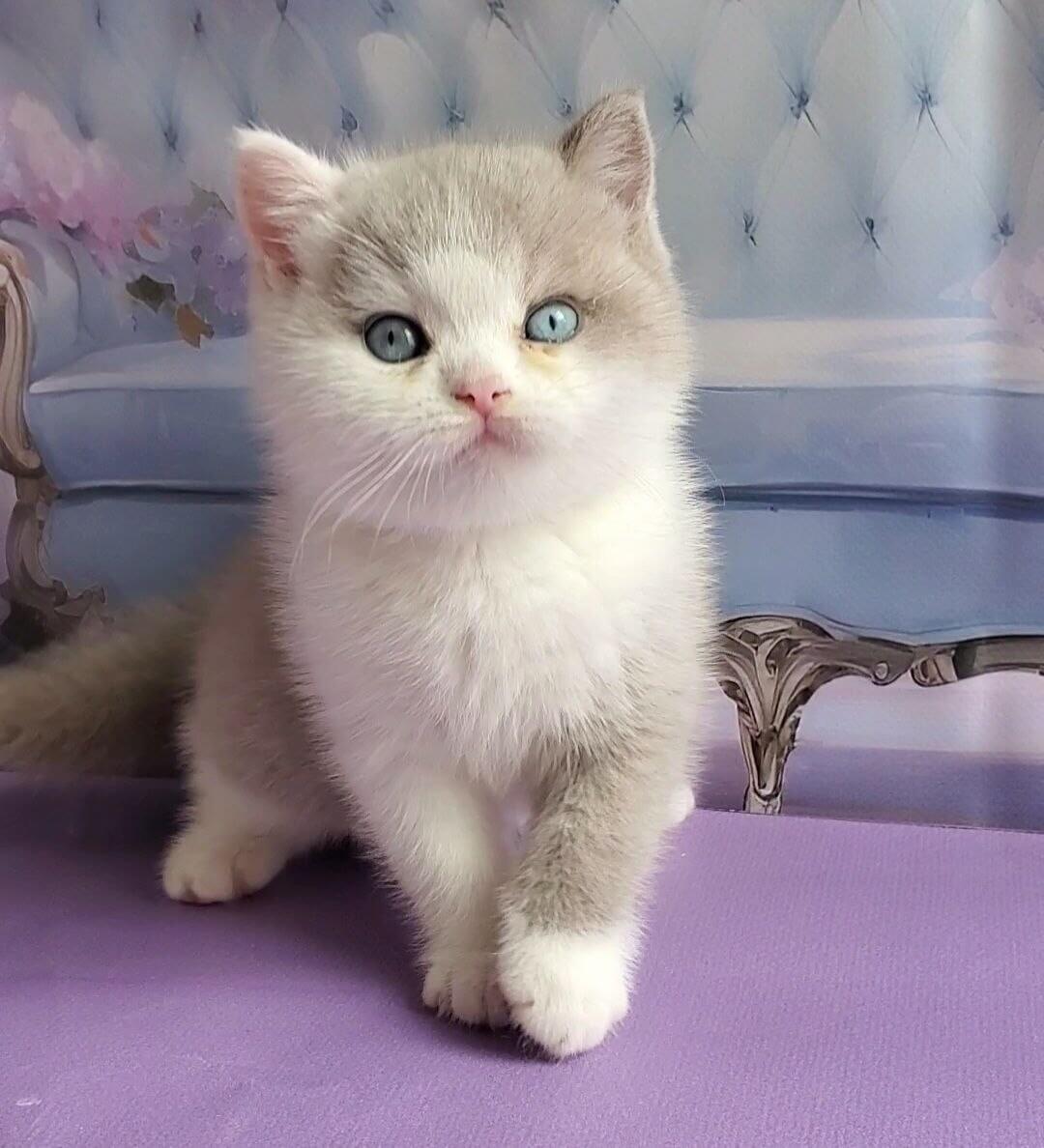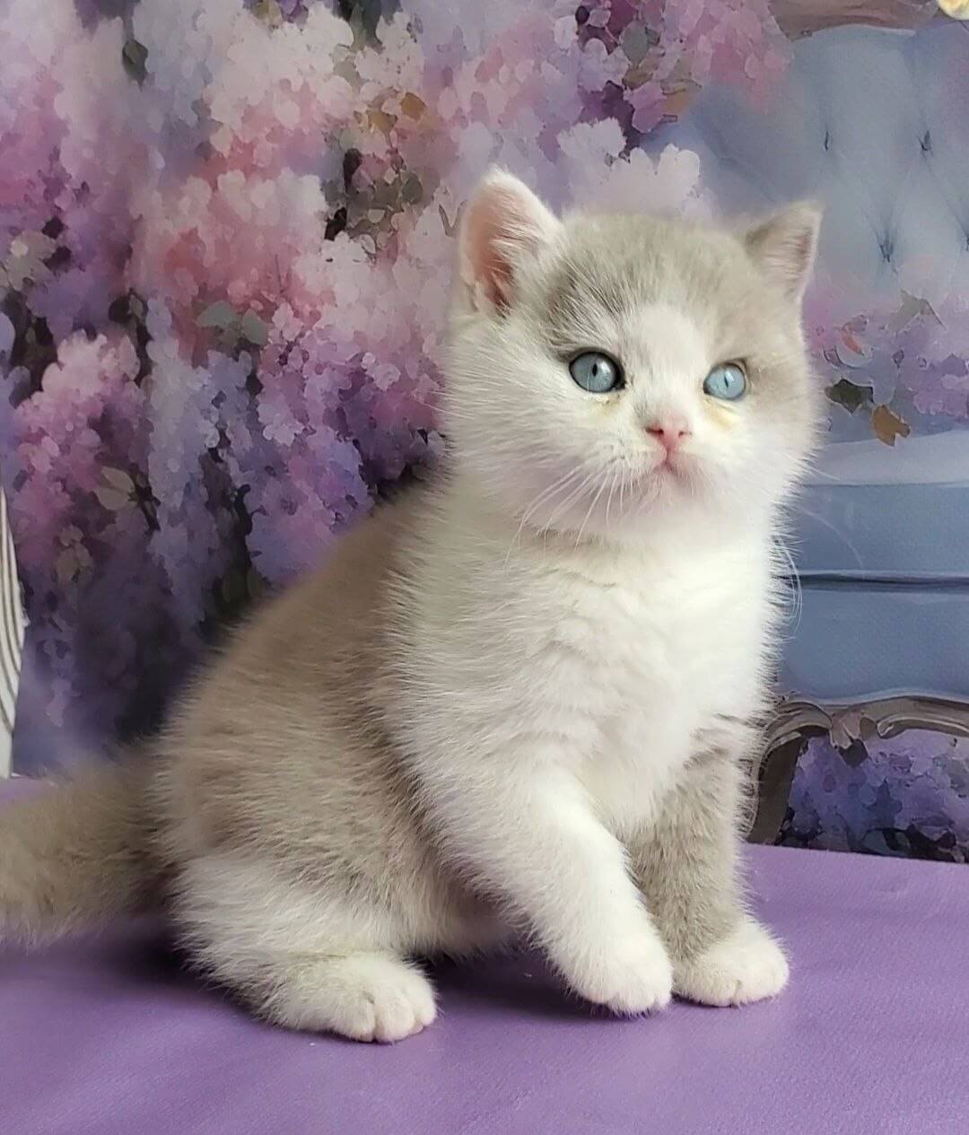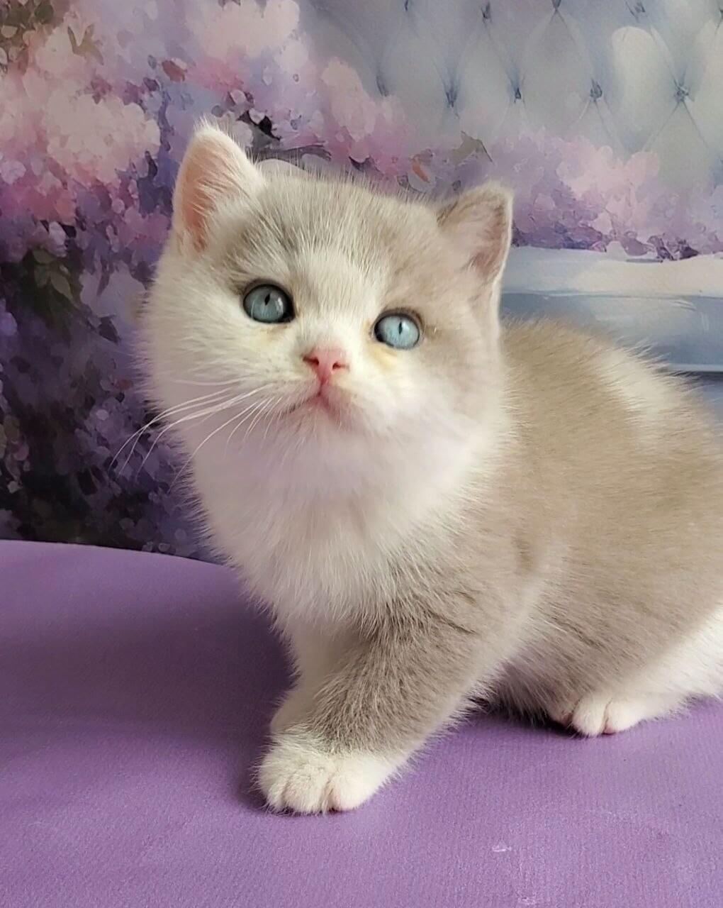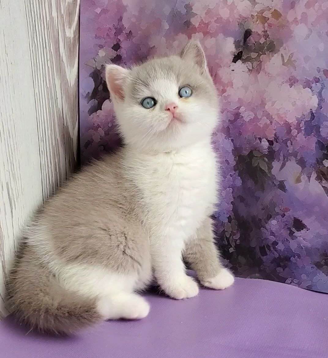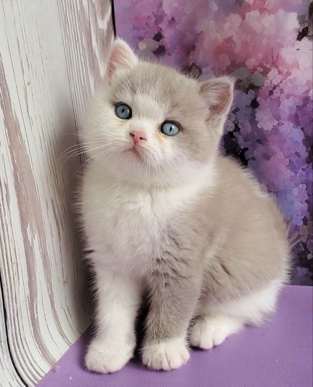 Quentin is a Lilac Bicolor British Shorthair kitten who feels like spring velvet in your arms, his plush, cloud-soft coat topped by delicate washes of lavender and ivory. When you look into his round, ocean-blue eyes, you’ll sense a gentle intelligence radiating back—like he’s memorizing your features with each steady blink.