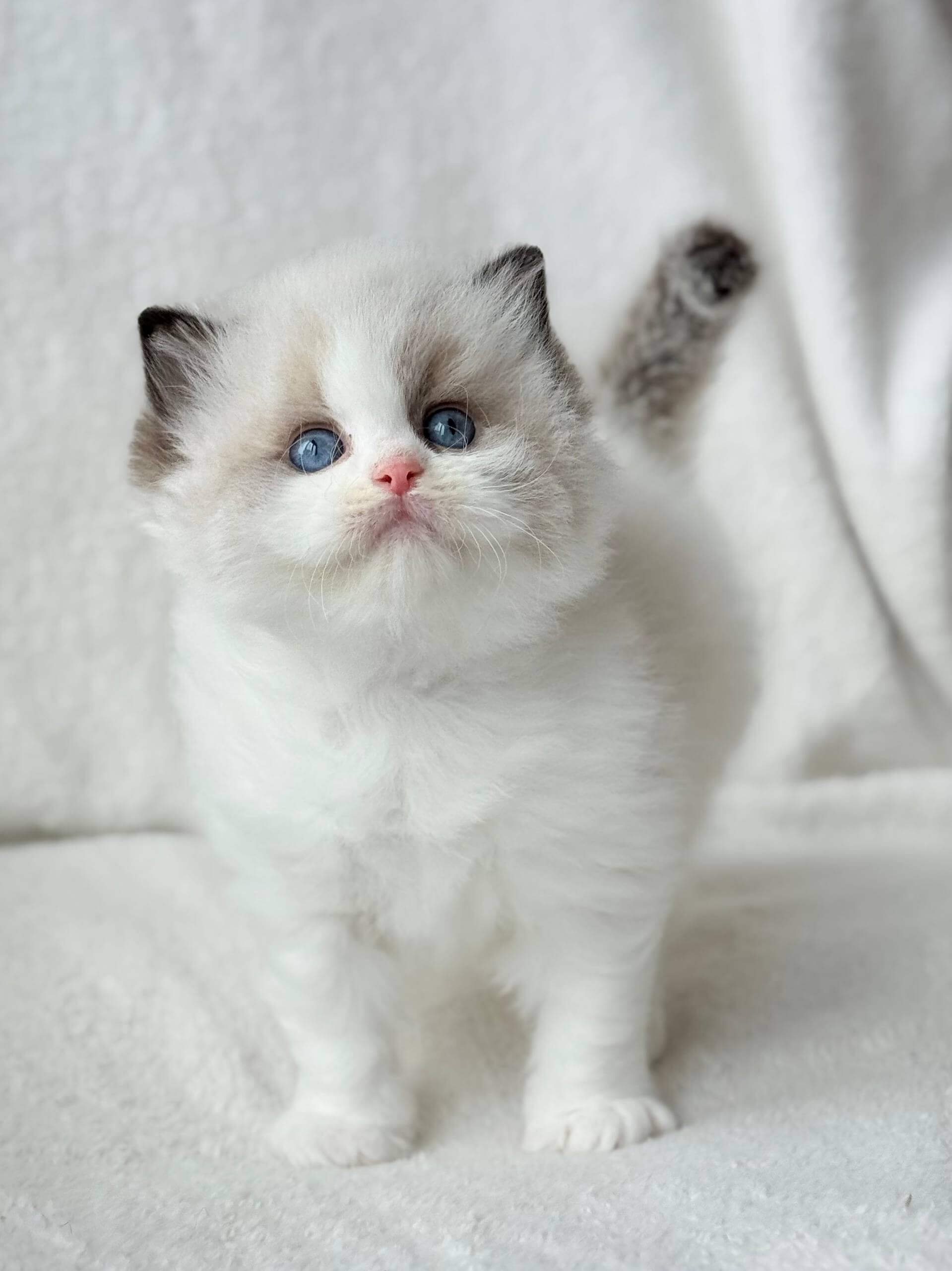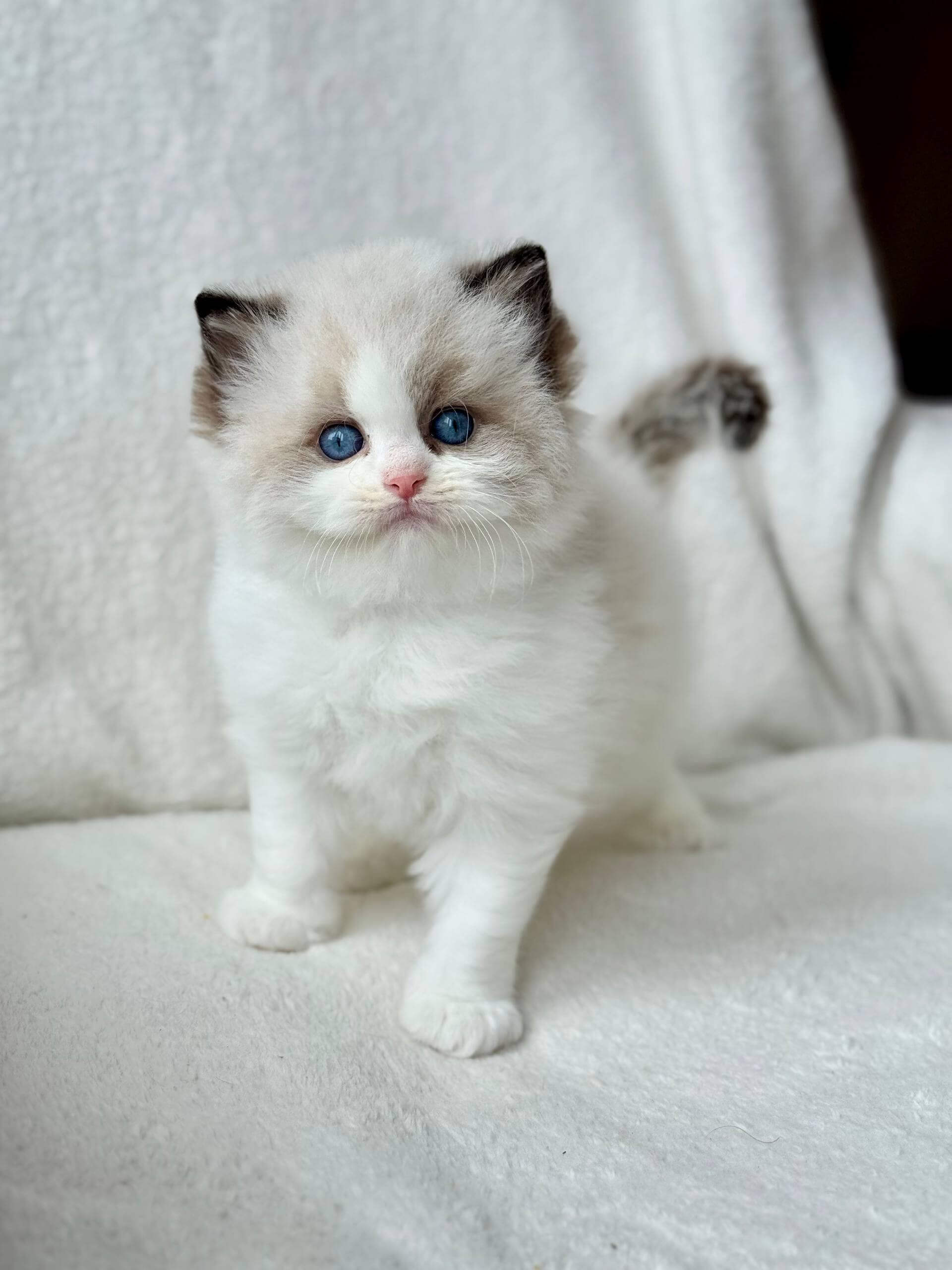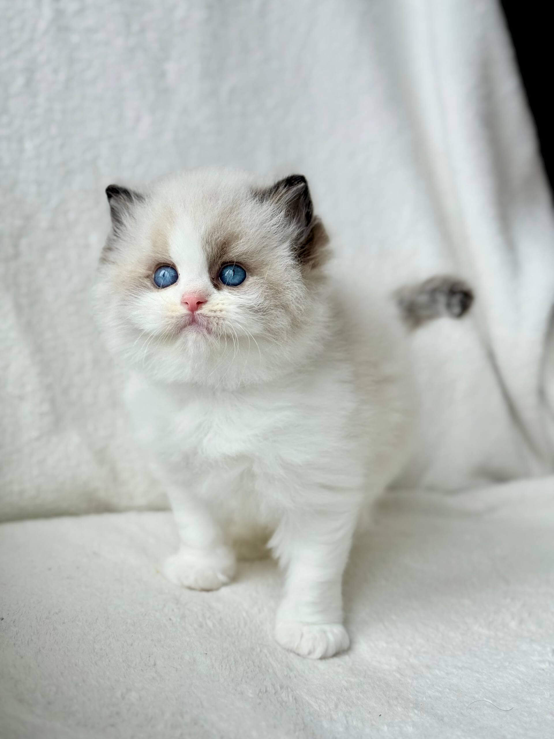Even as a kitten, Raichka embodies the calm, social nature Ragdolls are cherished for. She prefers to follow you quietly from room to room, stretching out close by instead of on your lap, but always making her presence felt with a slow blink or a gentle nudge. She’ll pounce on toys with feather-light grace, and at night, she tucks herself nearby as if standing silent guard.