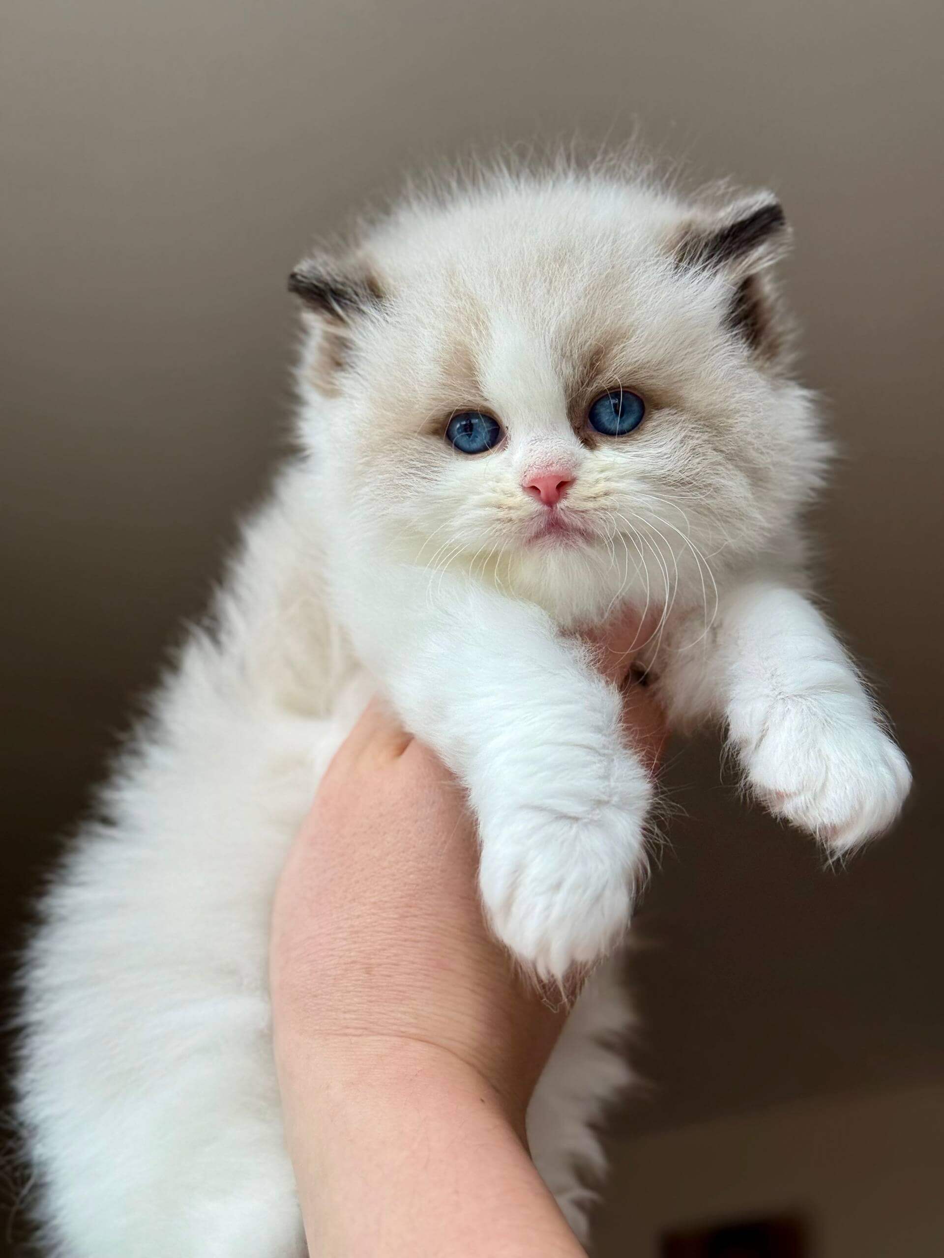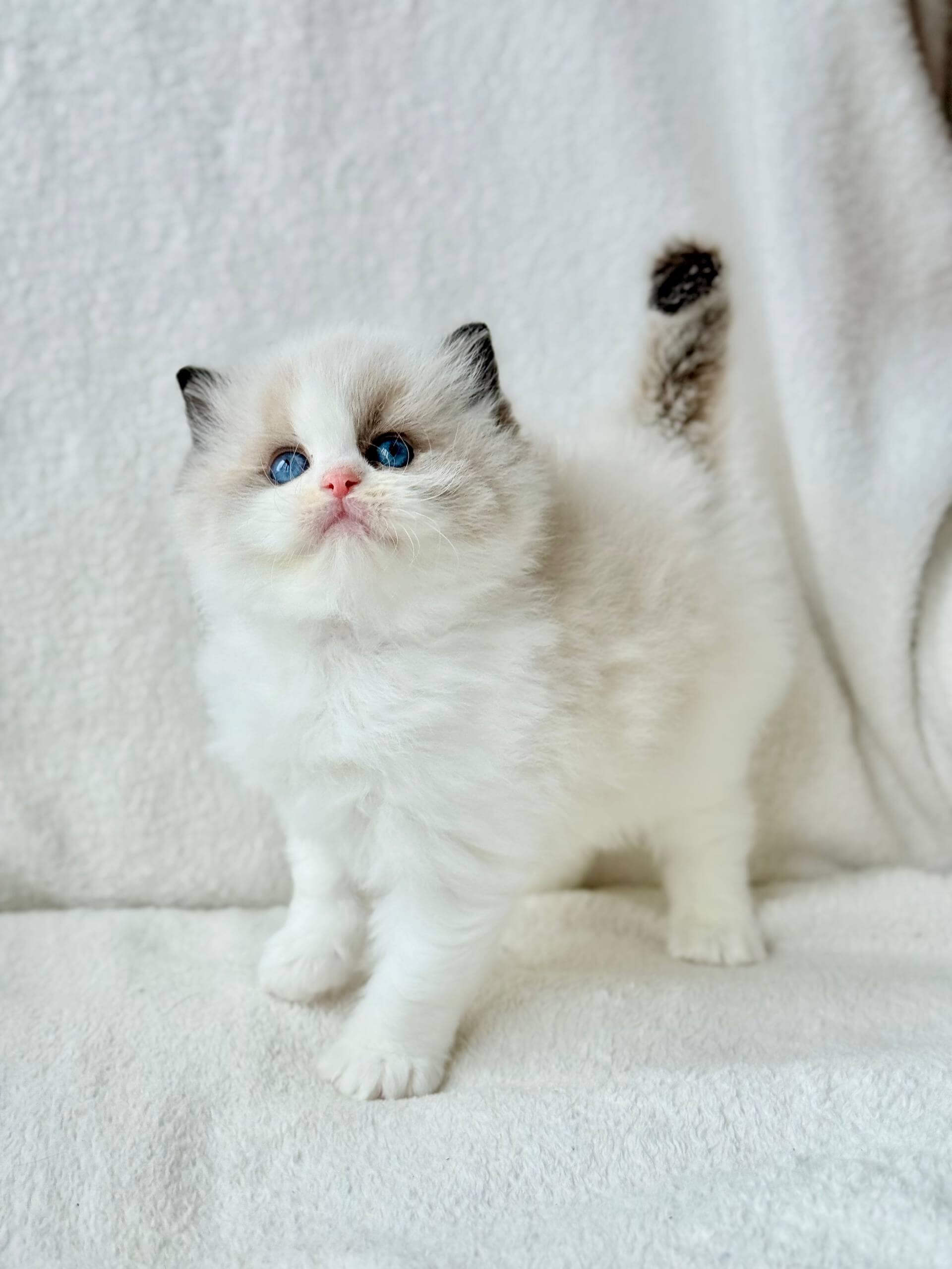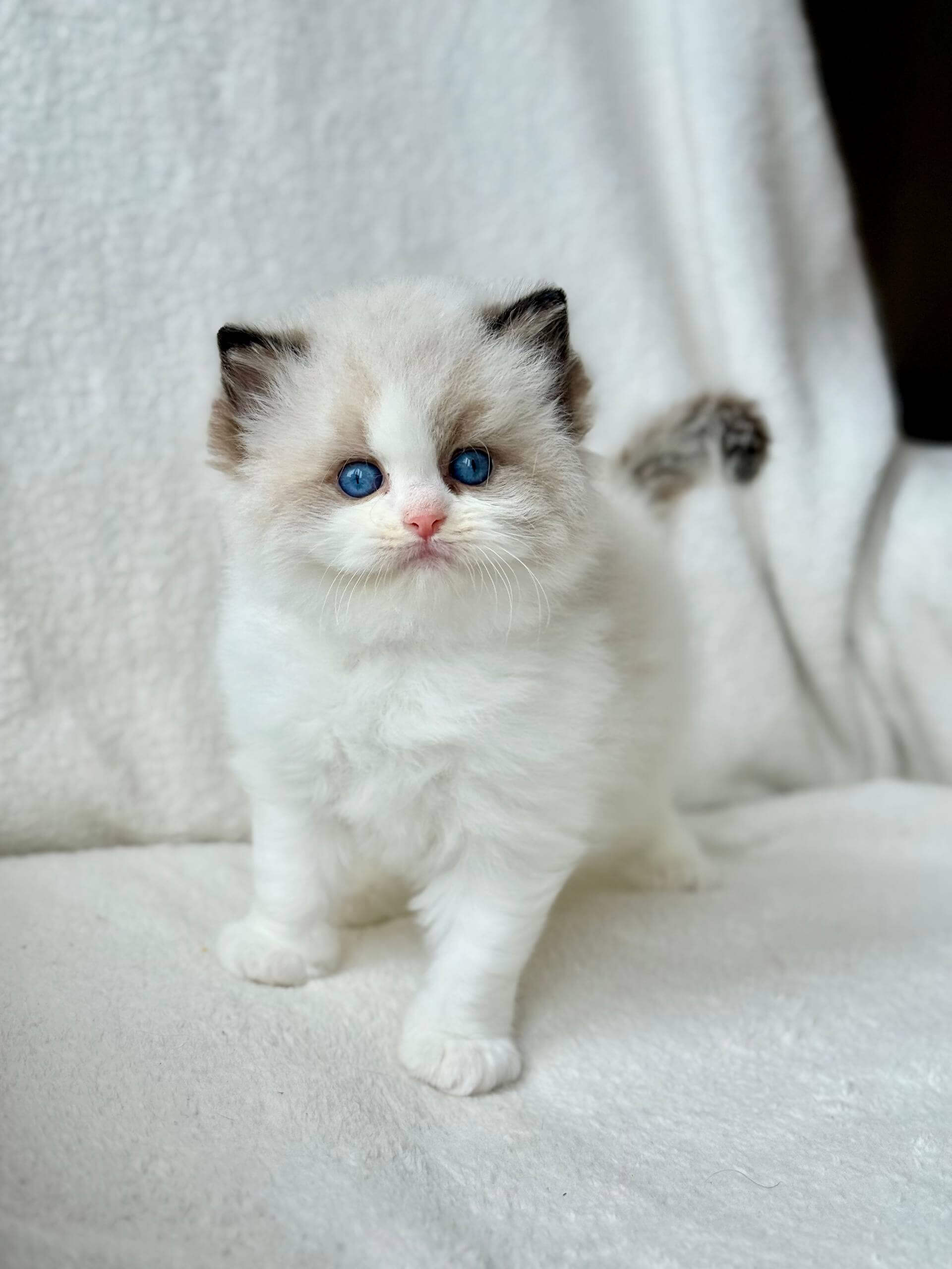 Even as a kitten, Raichka embodies the calm, social nature Ragdolls are cherished for. She prefers to follow you quietly from room to room, stretching out close by instead of on your lap, but always making her presence felt with a slow blink or a gentle nudge. She’ll pounce on toys with feather-light grace, and at night, she tucks herself nearby as if standing silent guard.