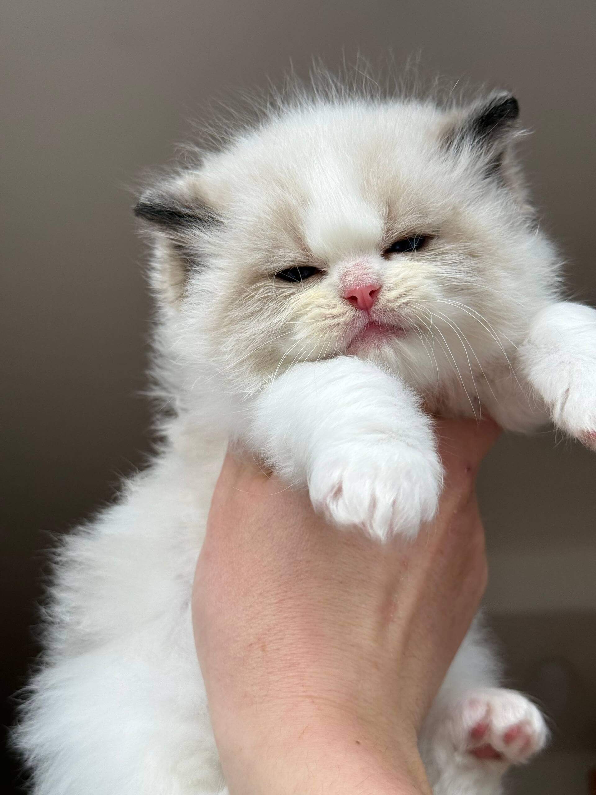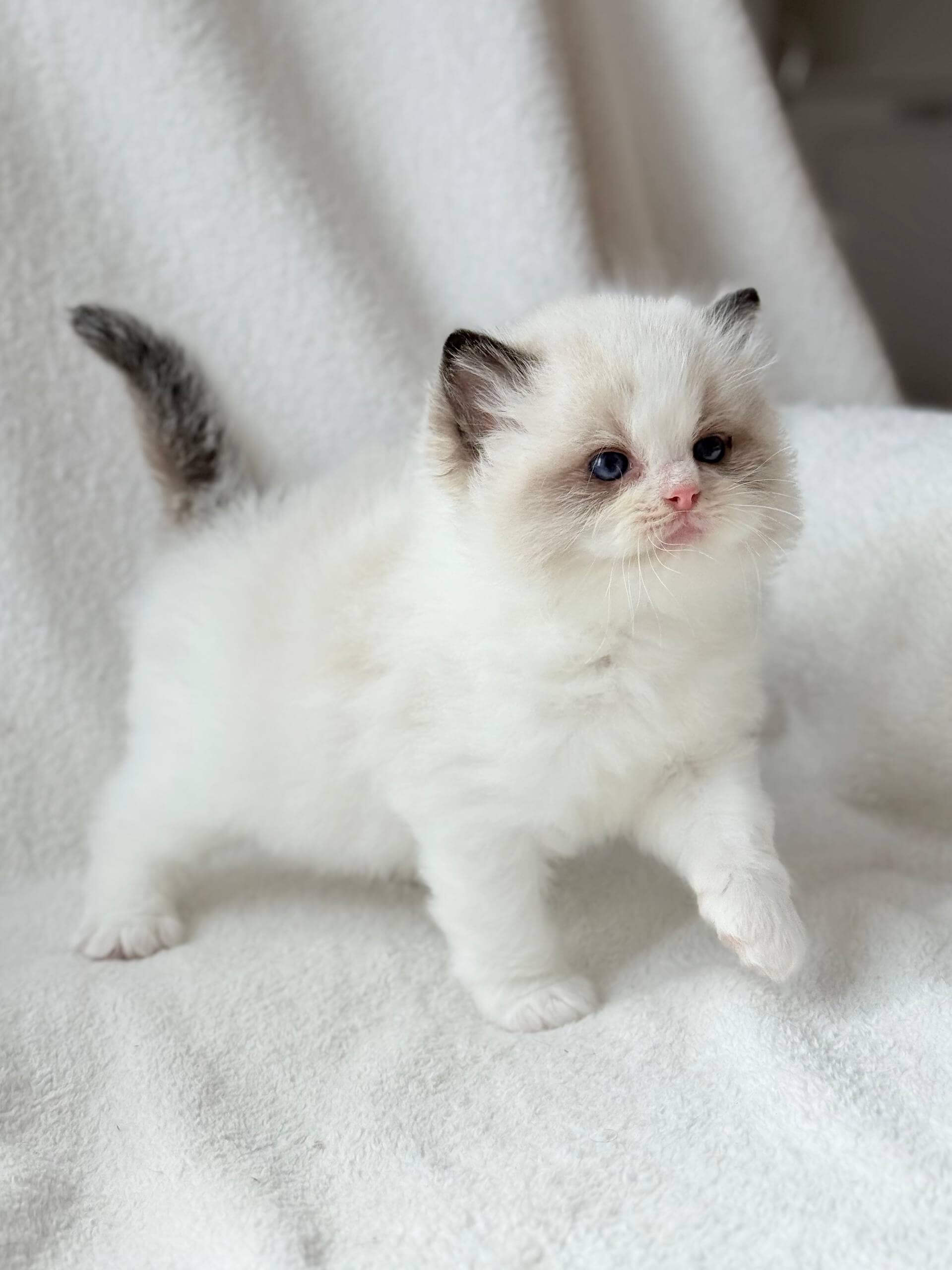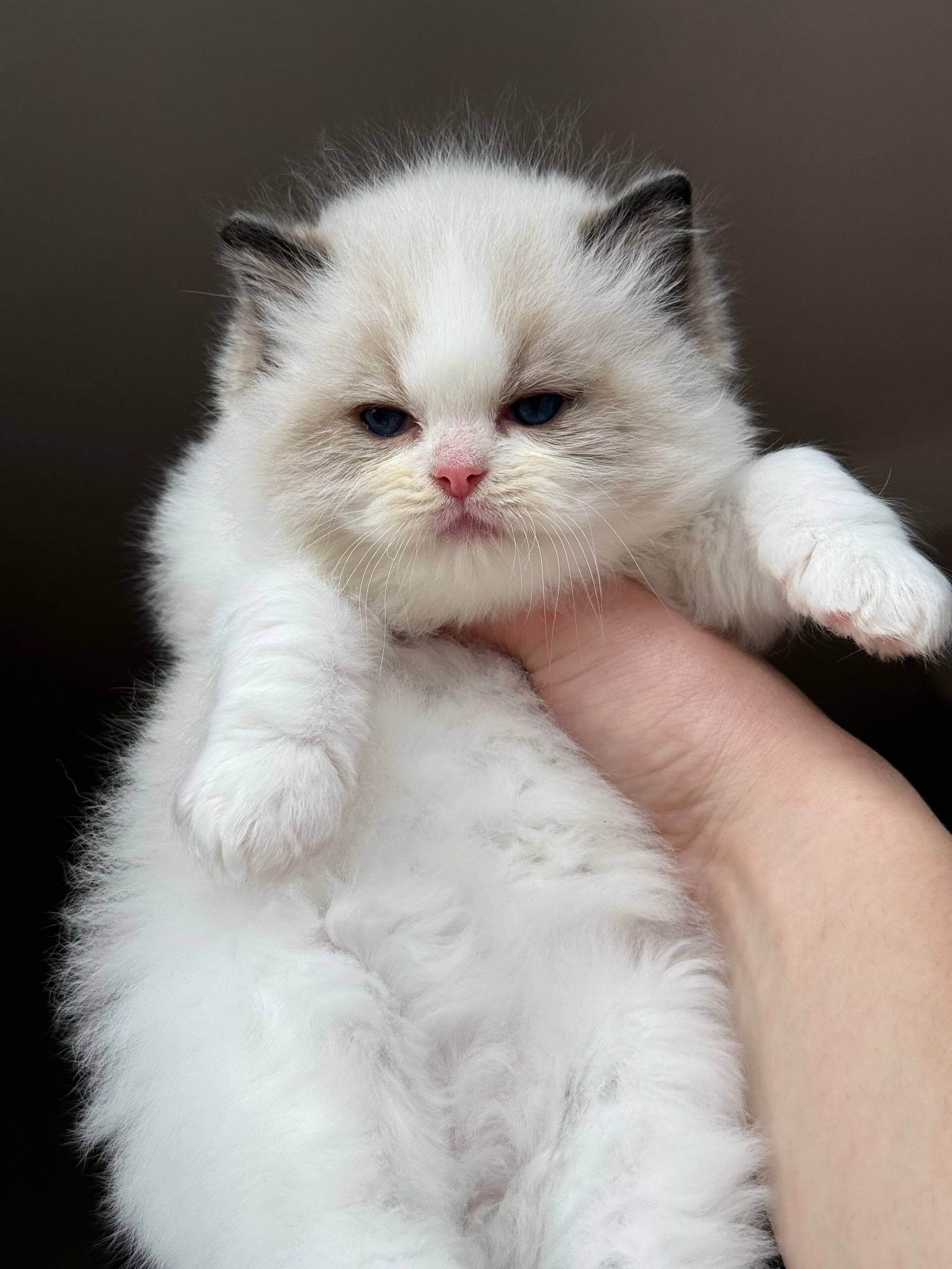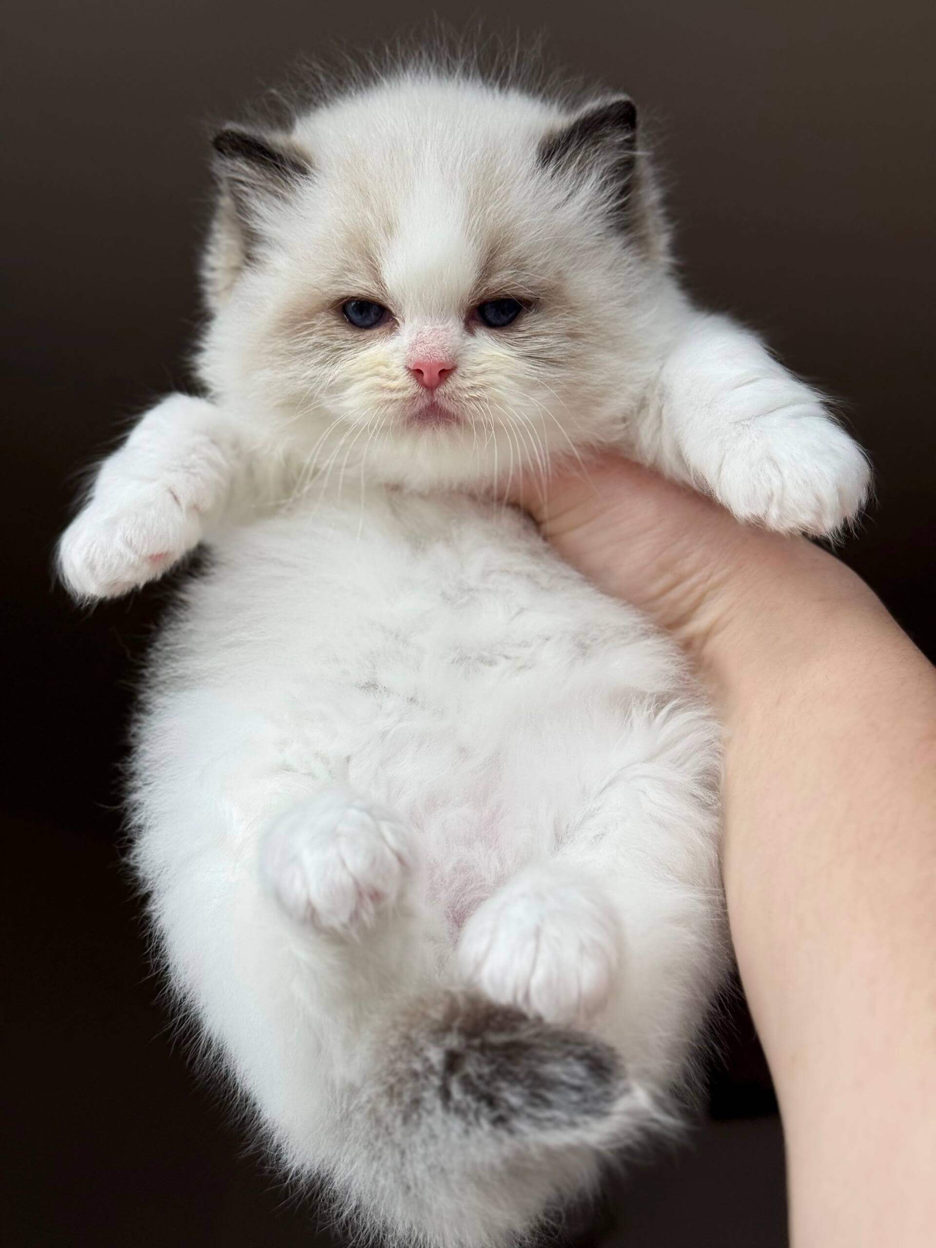 Ramen is a Seal Bicolor Ragdoll kitten whose coat is both cloud-soft and soothing to the touch, with an artful swirl of creamy white and deep chocolate that’s uniquely his own. Cradled in your arms, his gentle warmth and comforting weight make every cuddle feel like a quiet afternoon. His blue eyes glow with intelligent curiosity, drawing you into his world.
