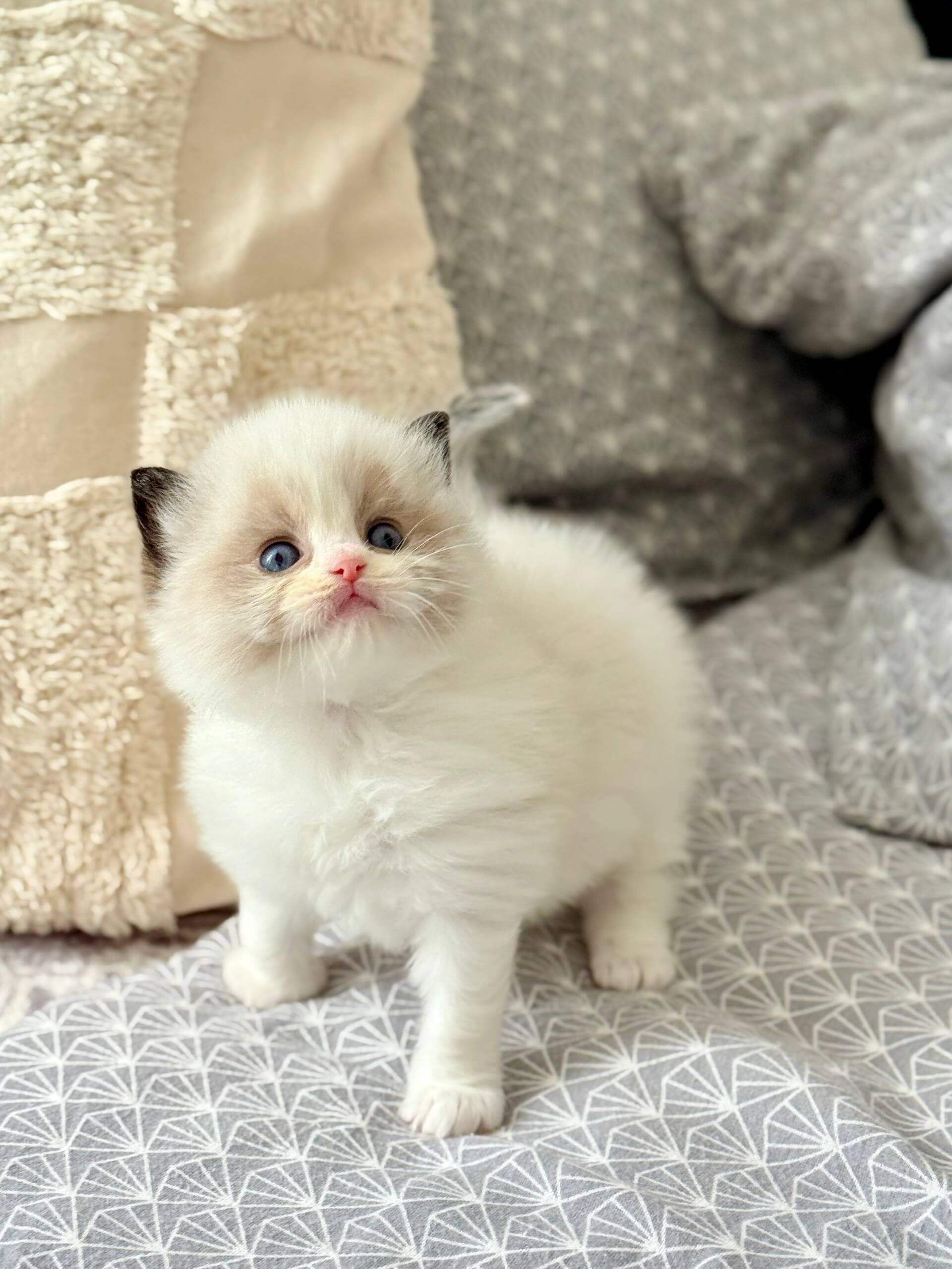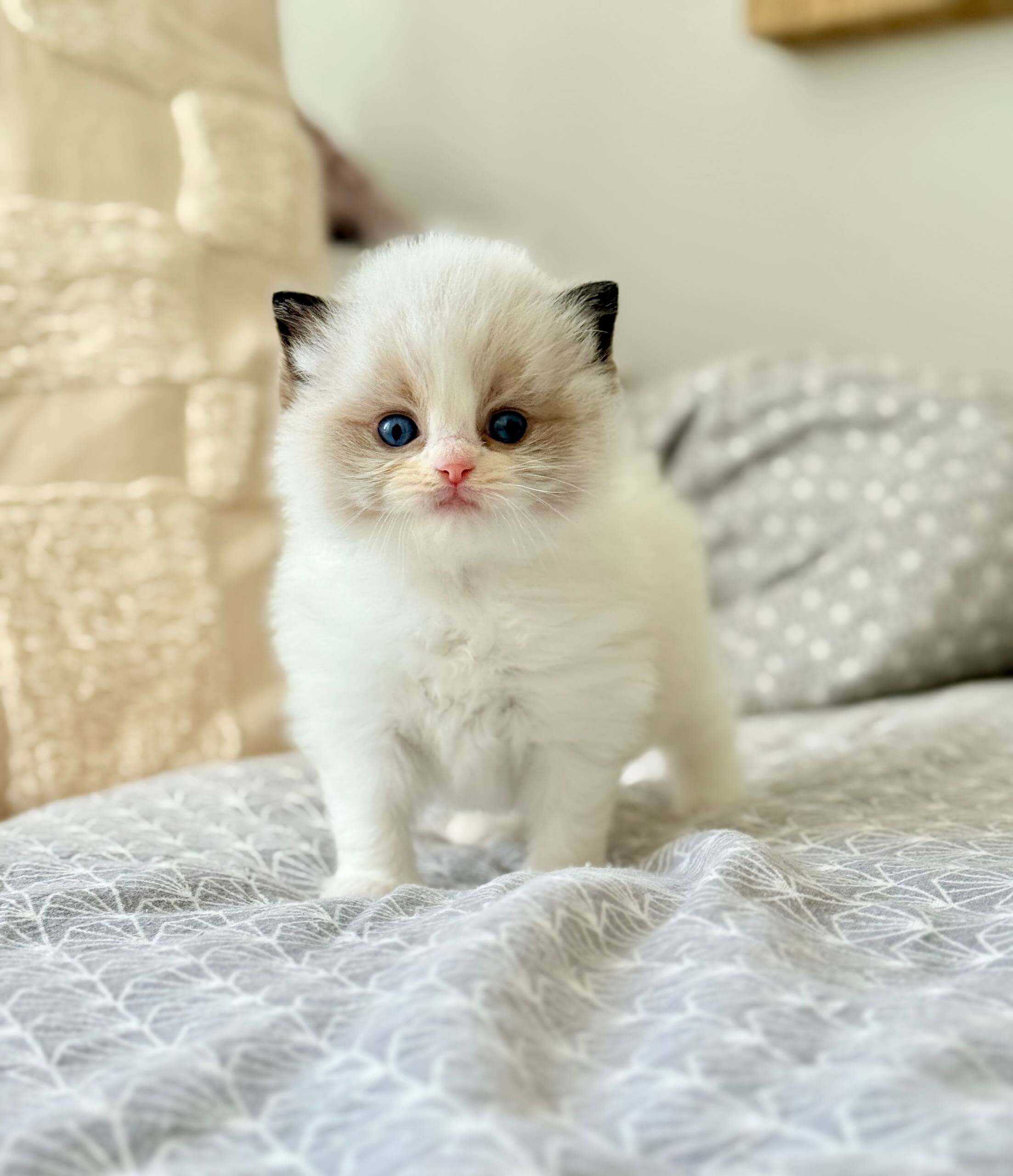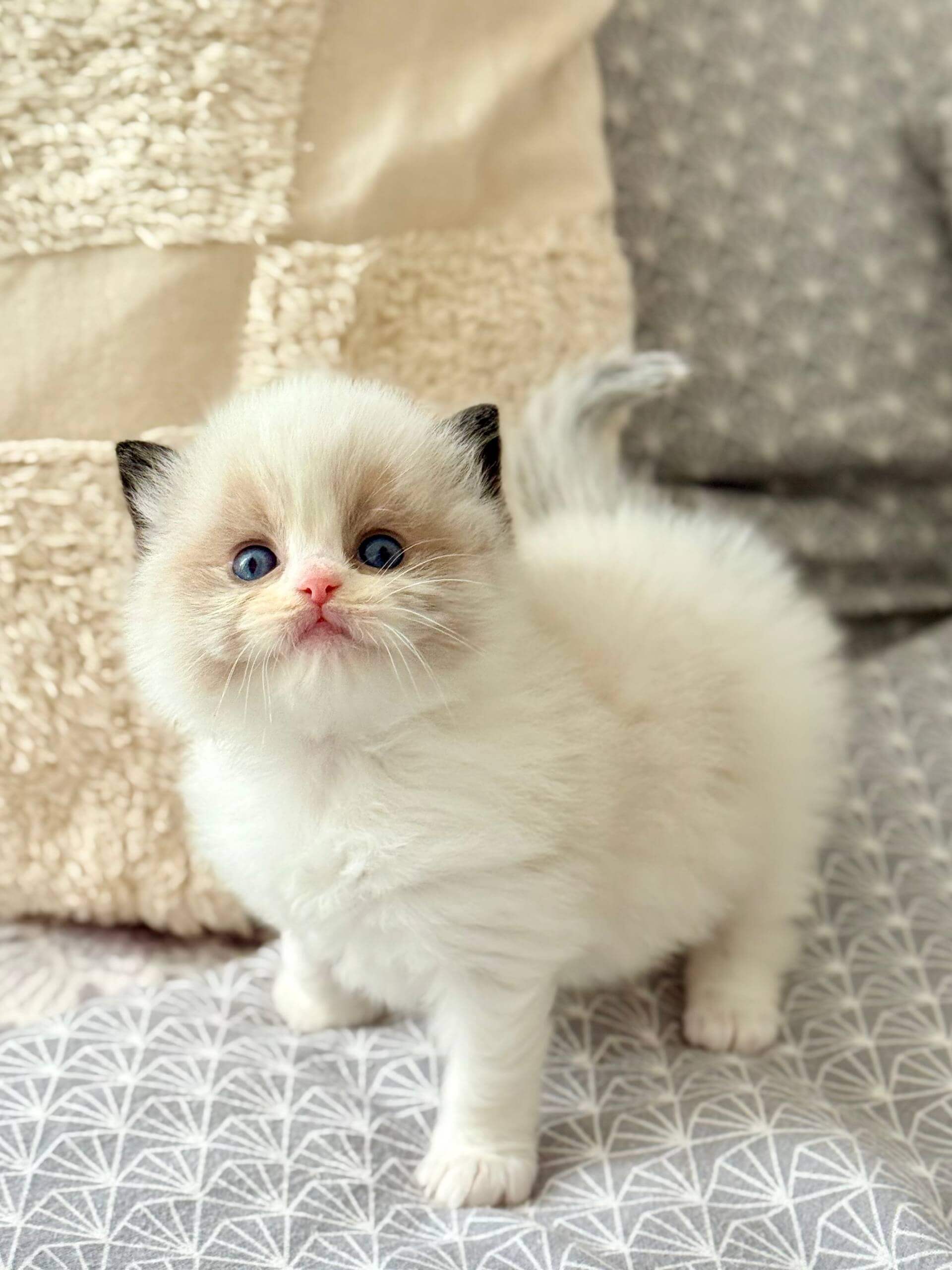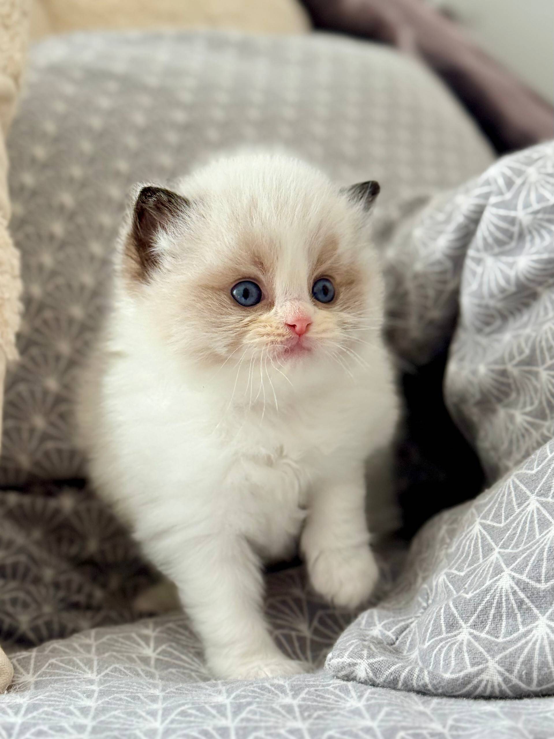 Let your hands sink into Ramy’s silky Seal Bicolor Ragdoll kitten fur—soft as a whisper, with a plush undercoat that invites gentle strokes. When you gaze into his ocean-blue eyes, you’ll feel a tranquil warmth radiating right back at you. Holding Ramy is a comfort: he melts, heavy and trusting, in your arms.