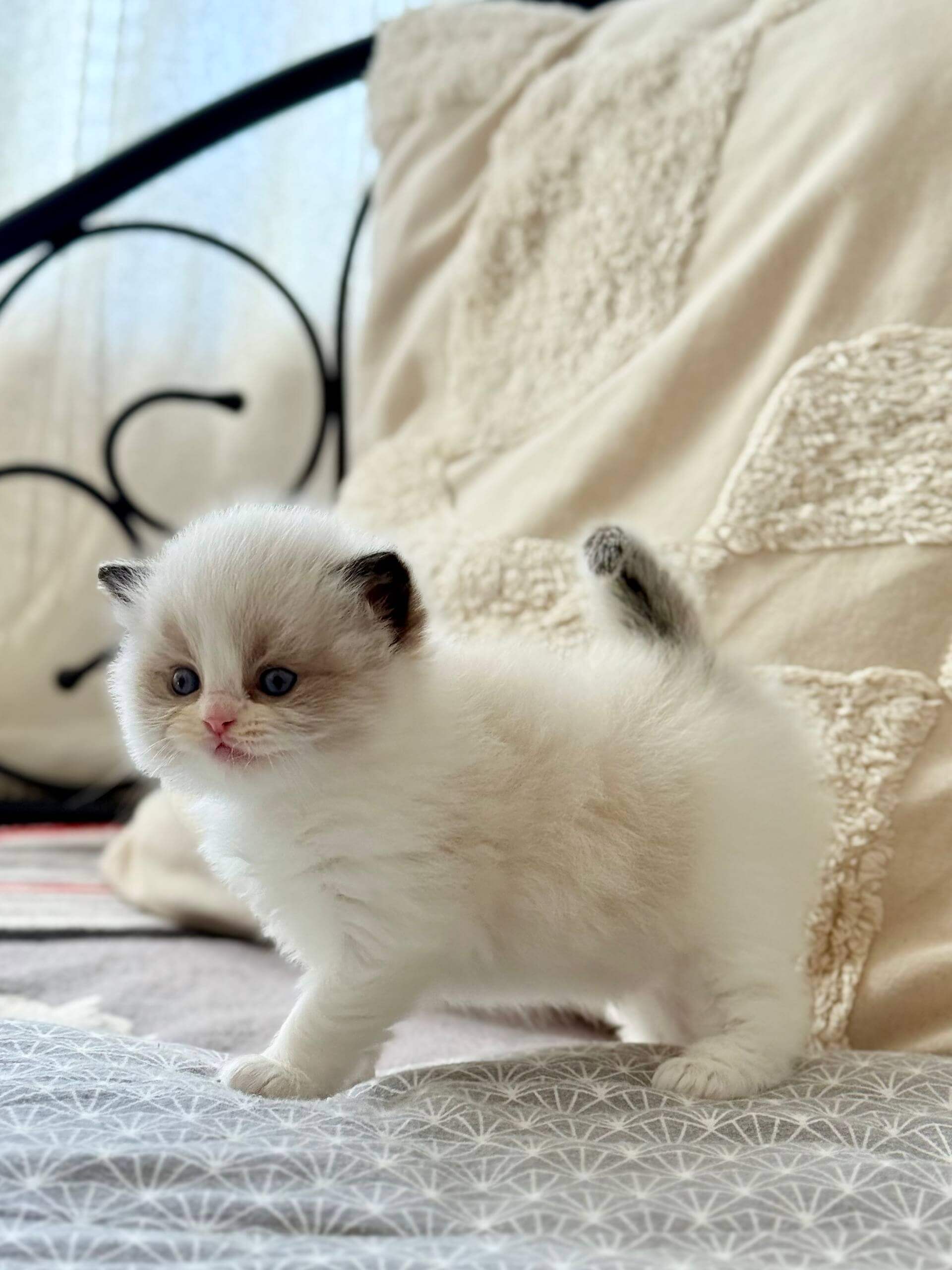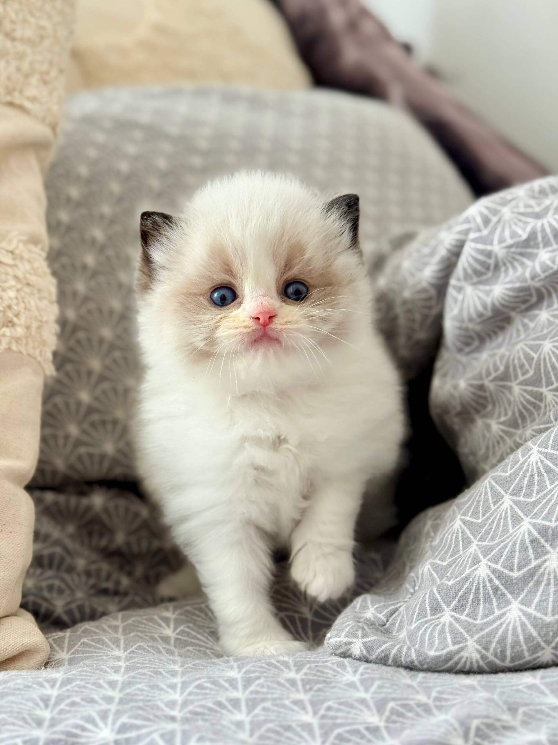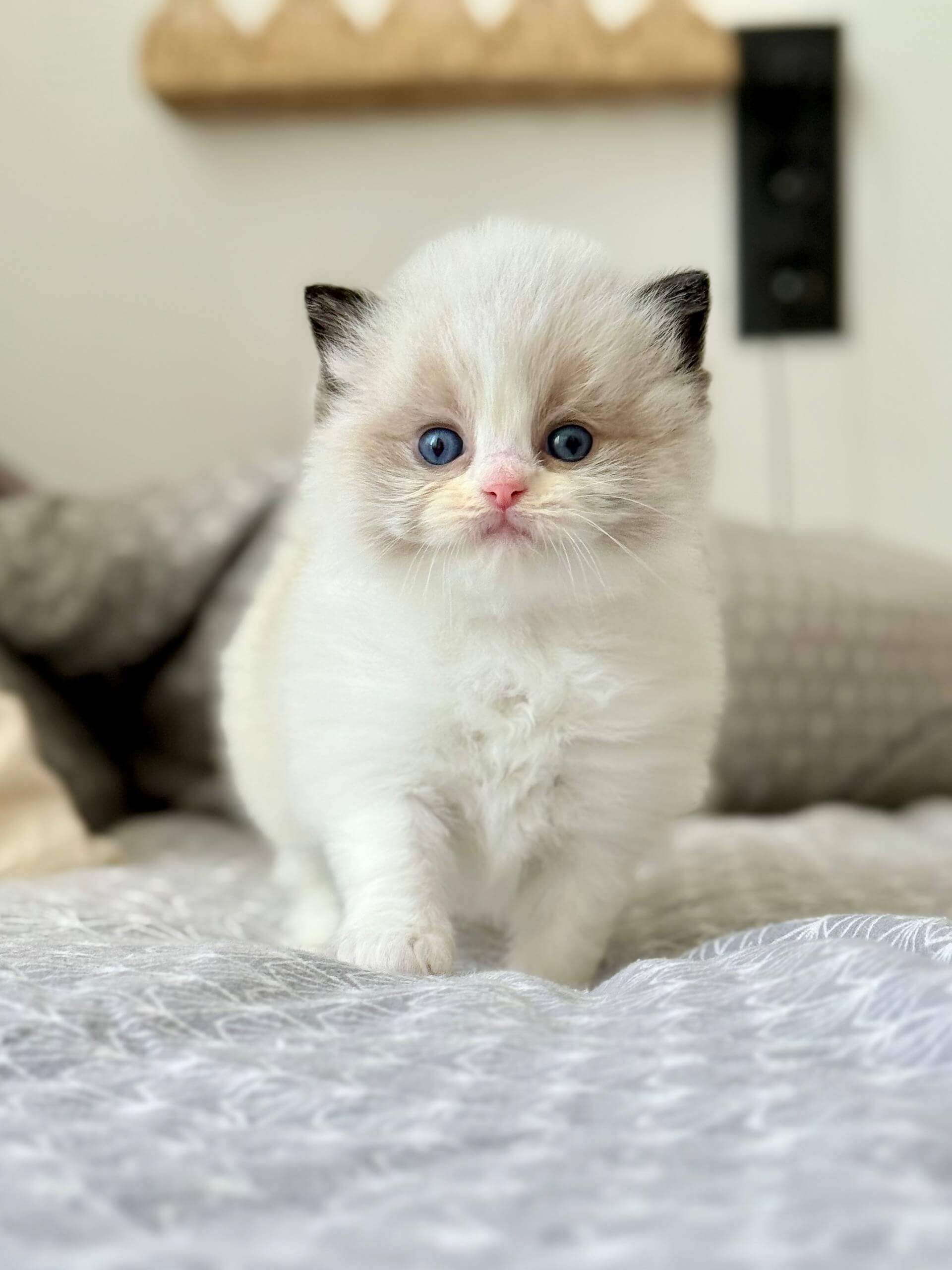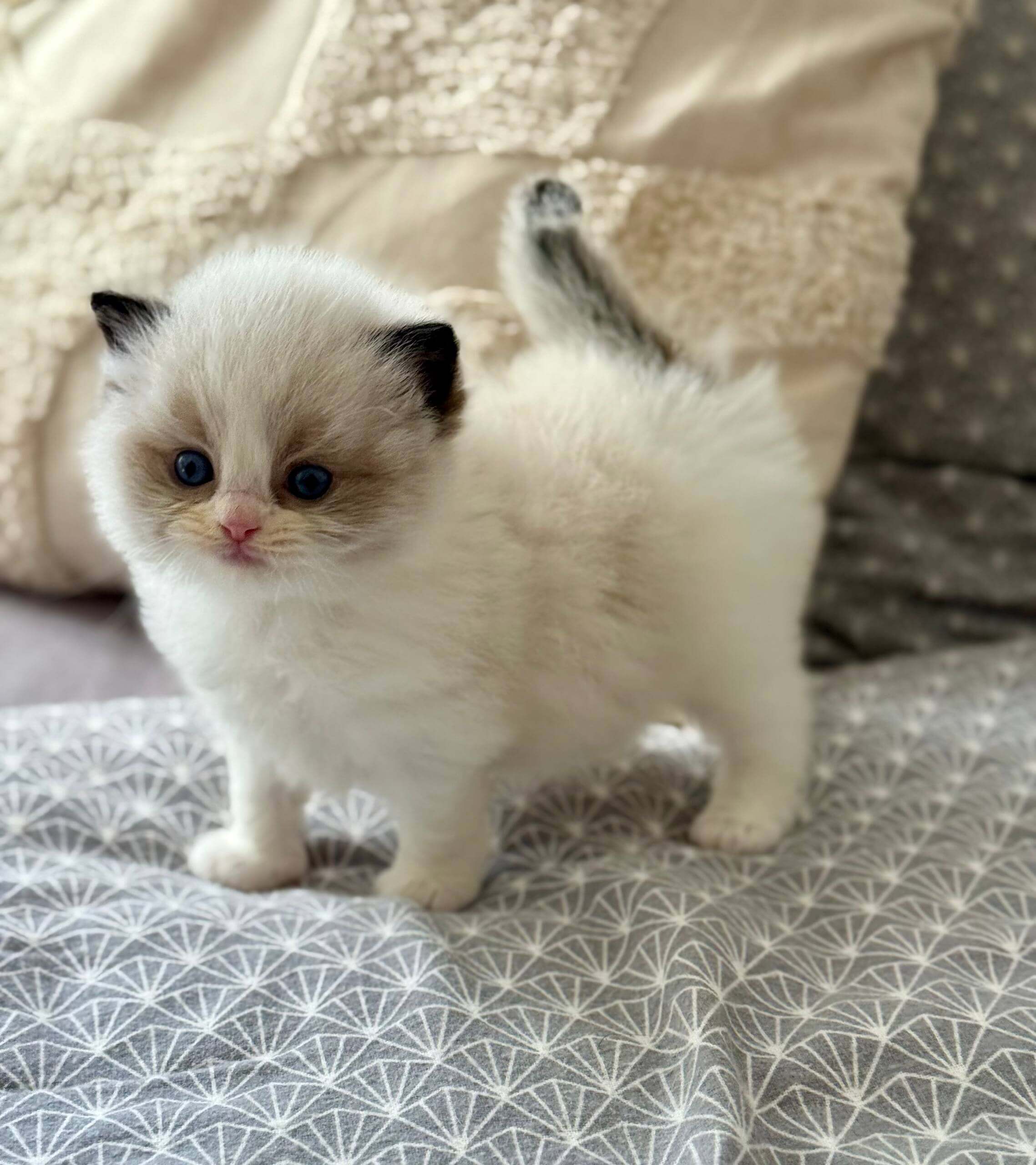 Let your hands sink into Ramy’s silky Seal Bicolor Ragdoll kitten fur—soft as a whisper, with a plush undercoat that invites gentle strokes. When you gaze into his ocean-blue eyes, you’ll feel a tranquil warmth radiating right back at you. Holding Ramy is a comfort: he melts, heavy and trusting, in your arms.