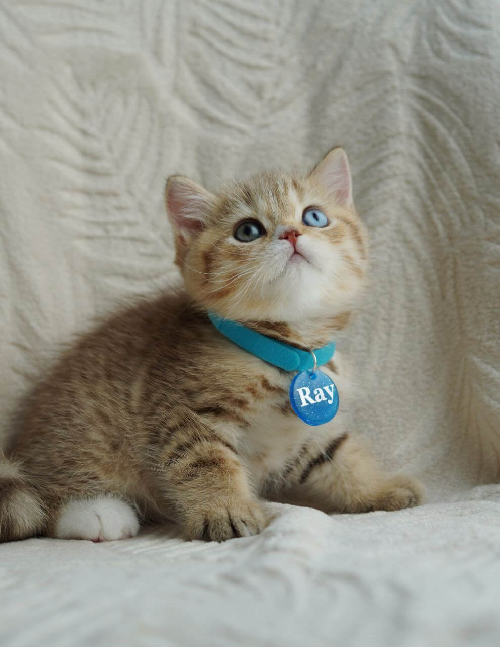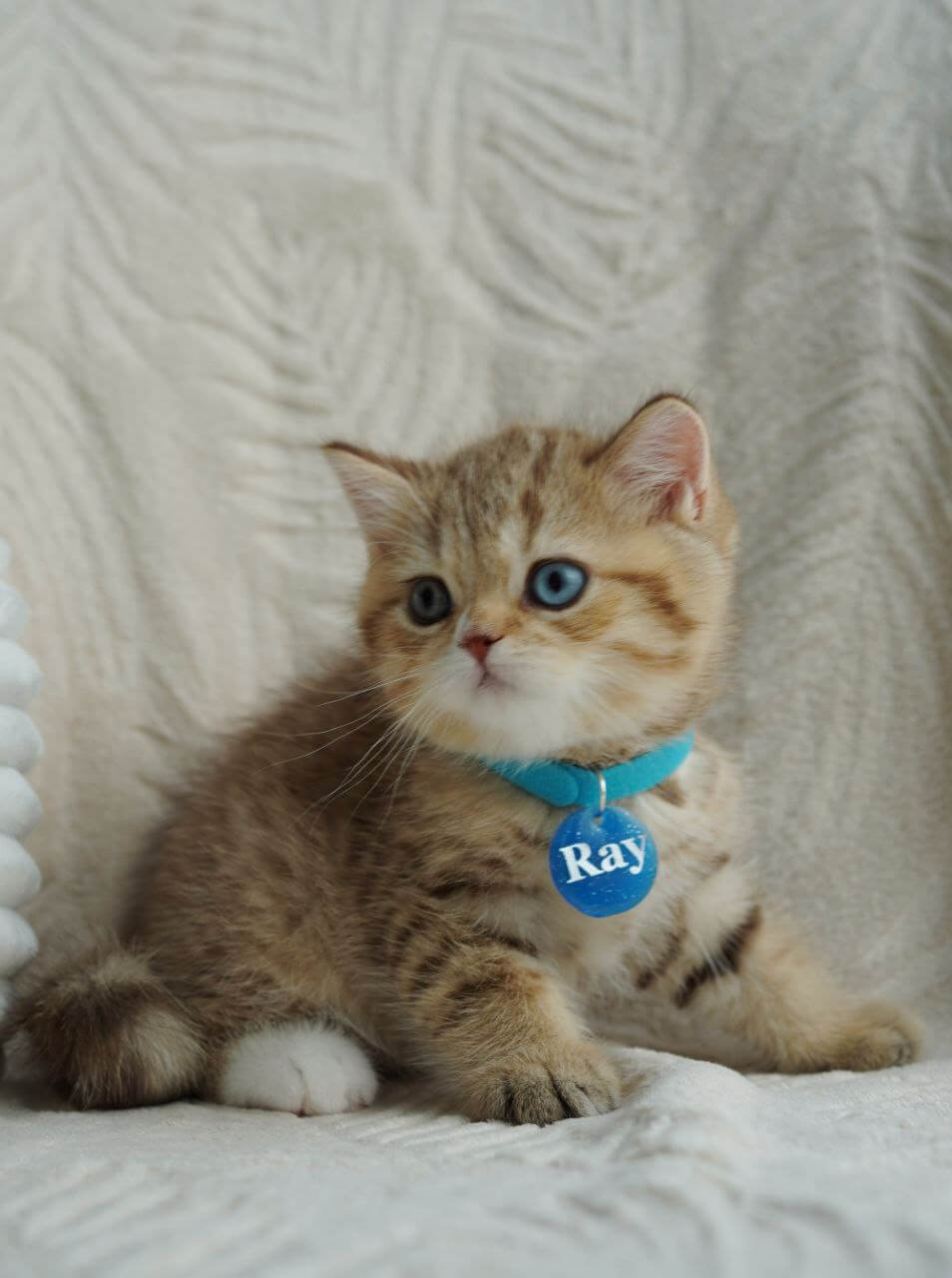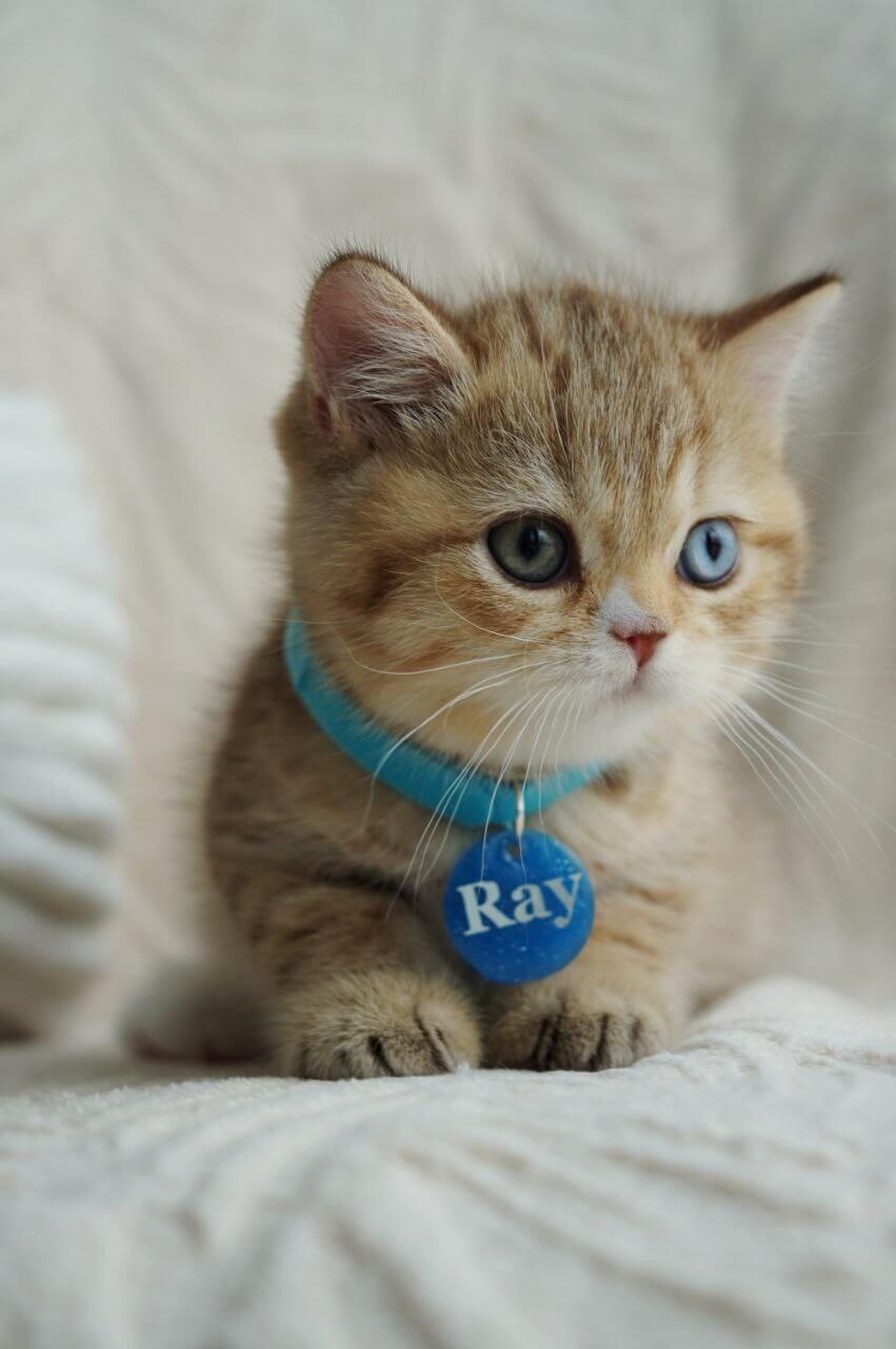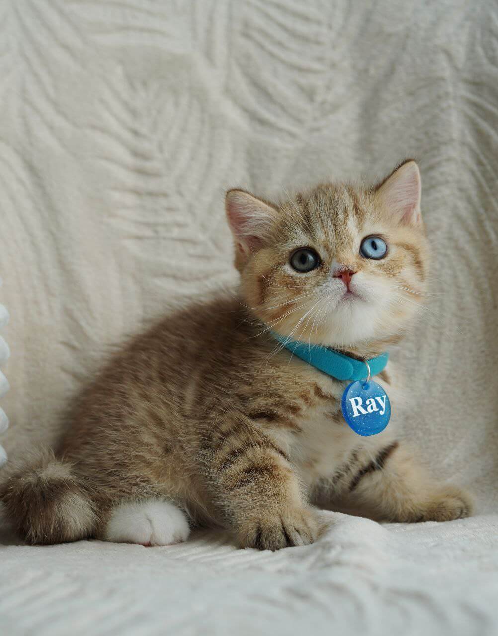 One glance at Ray, our enchanting British Shorthair boy, and you’ll feel pure wonder—a treasure with a chocolate-tabby mackerel coat brushed with snowy white, and mesmerizing odd eyes that glimmer with curiosity and gentle affection.