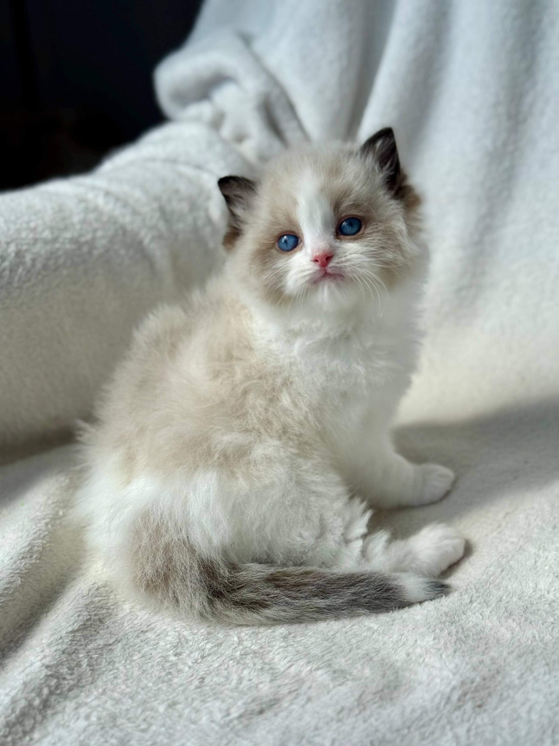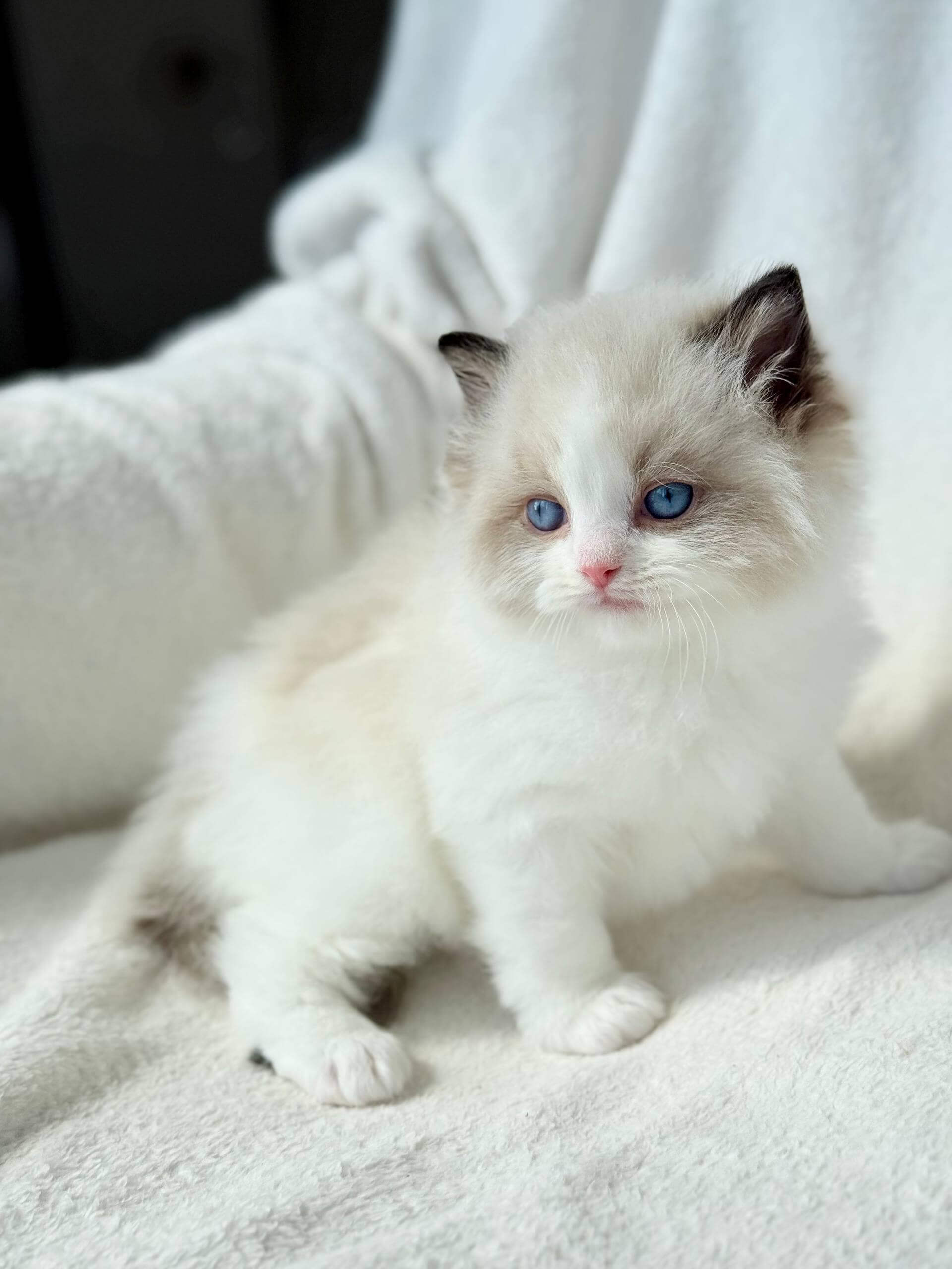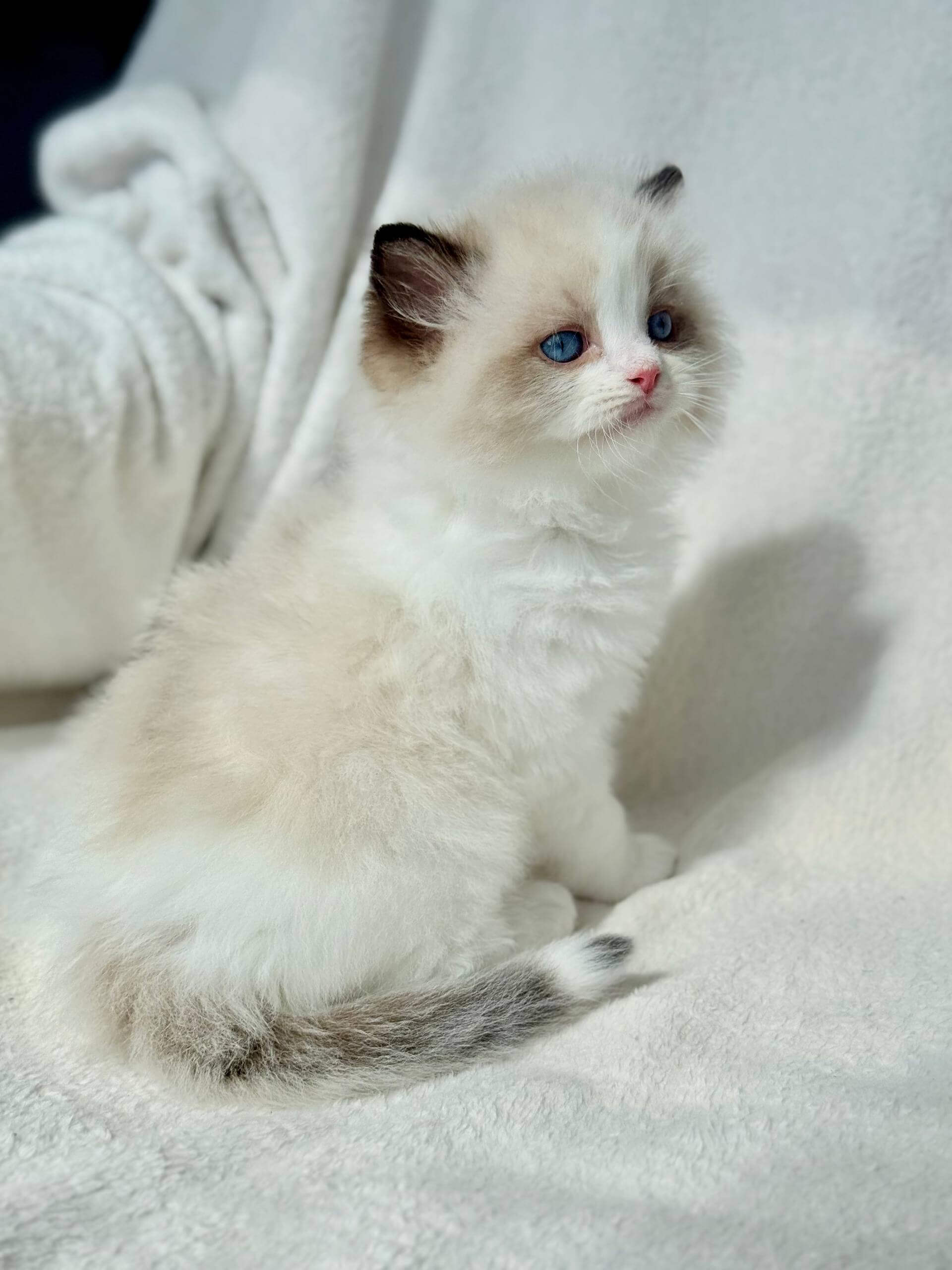 From the moment you scoop Rhine into your arms, his downy Seal Bicolor coat envelopes your hands—soft and plush like fine velvet. His clear blue eyes meet yours with a gaze so gentle and warm, you feel an instant comfort. Every line of his small, elegant frame promises elegance and serenity.