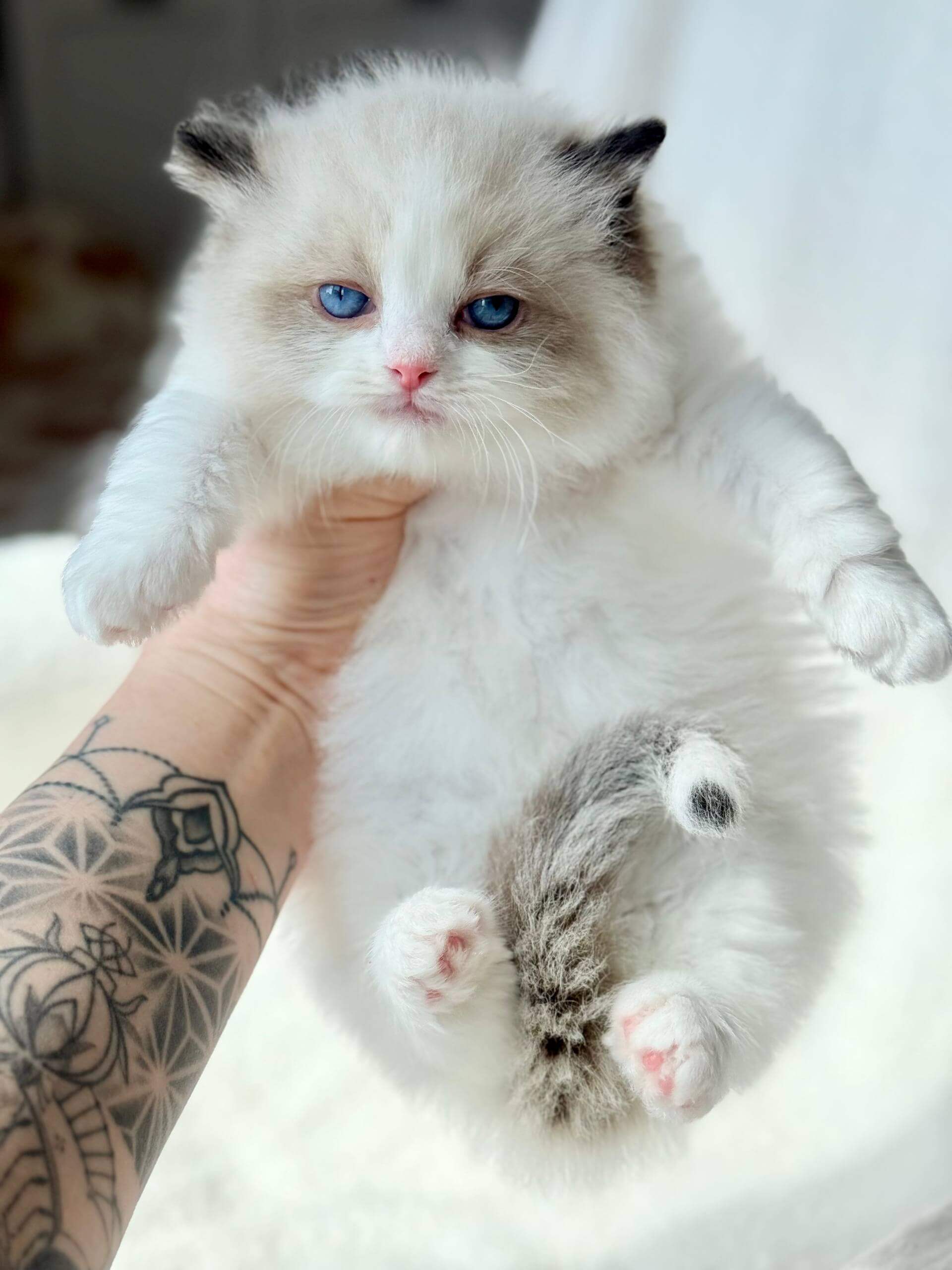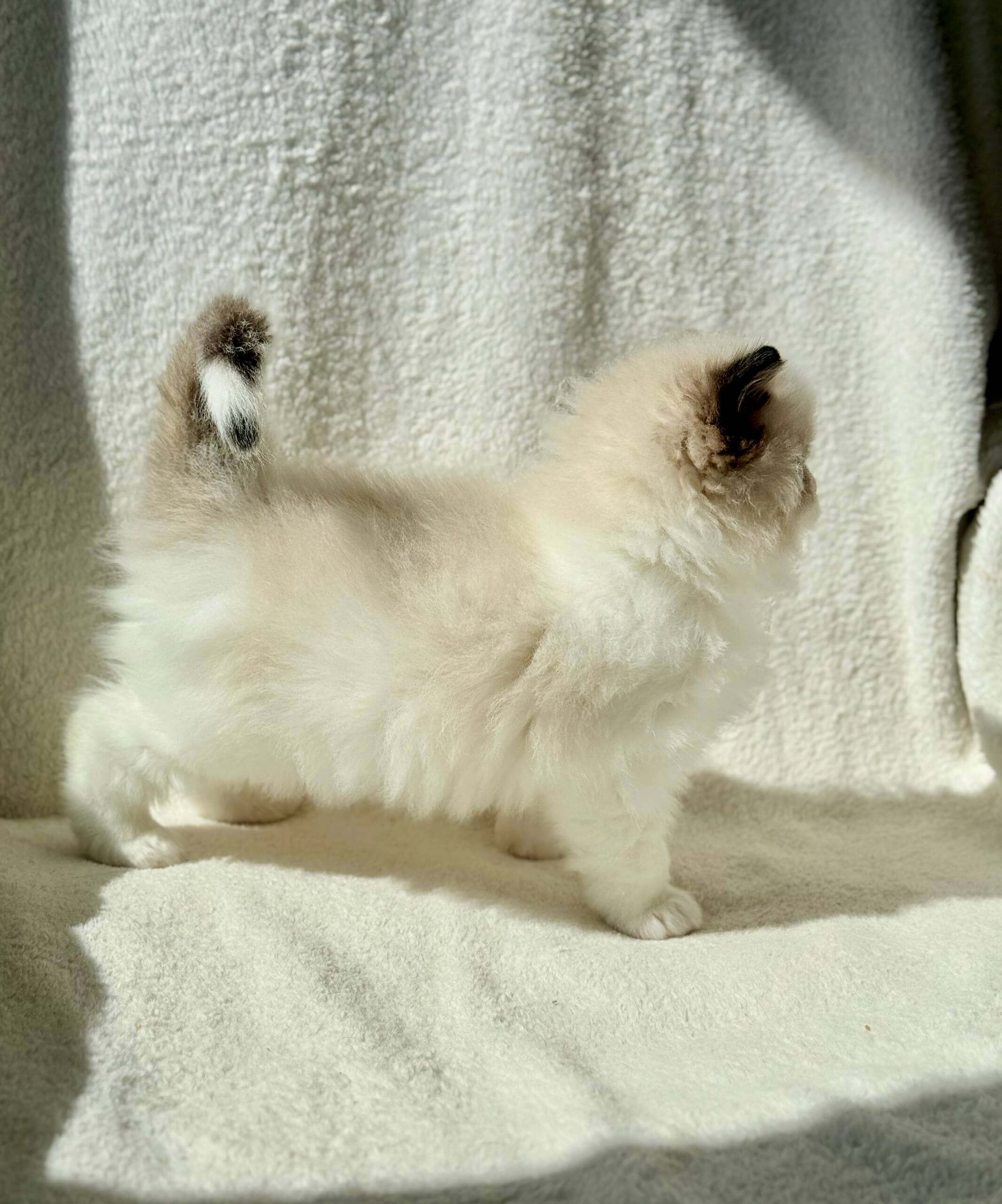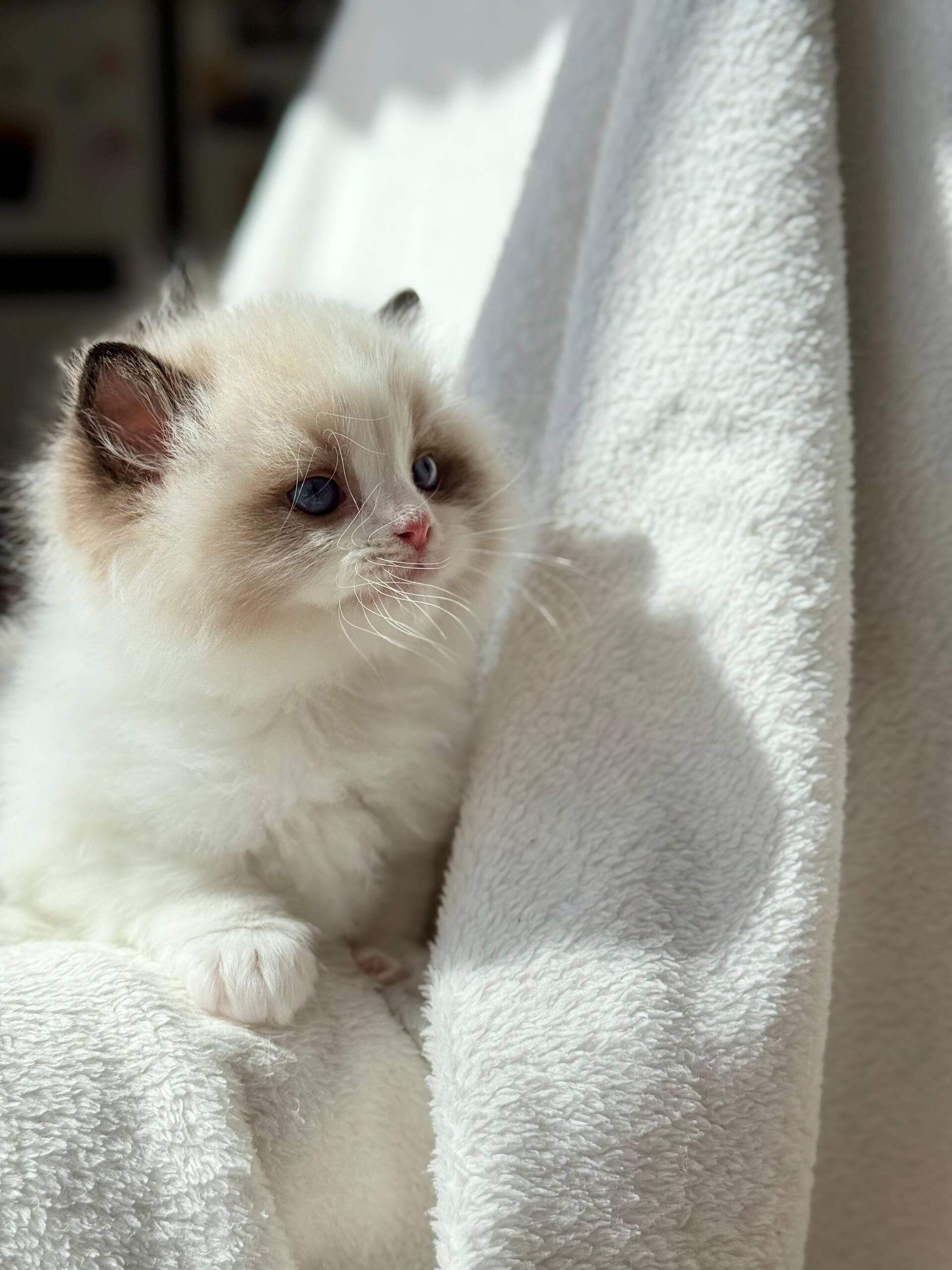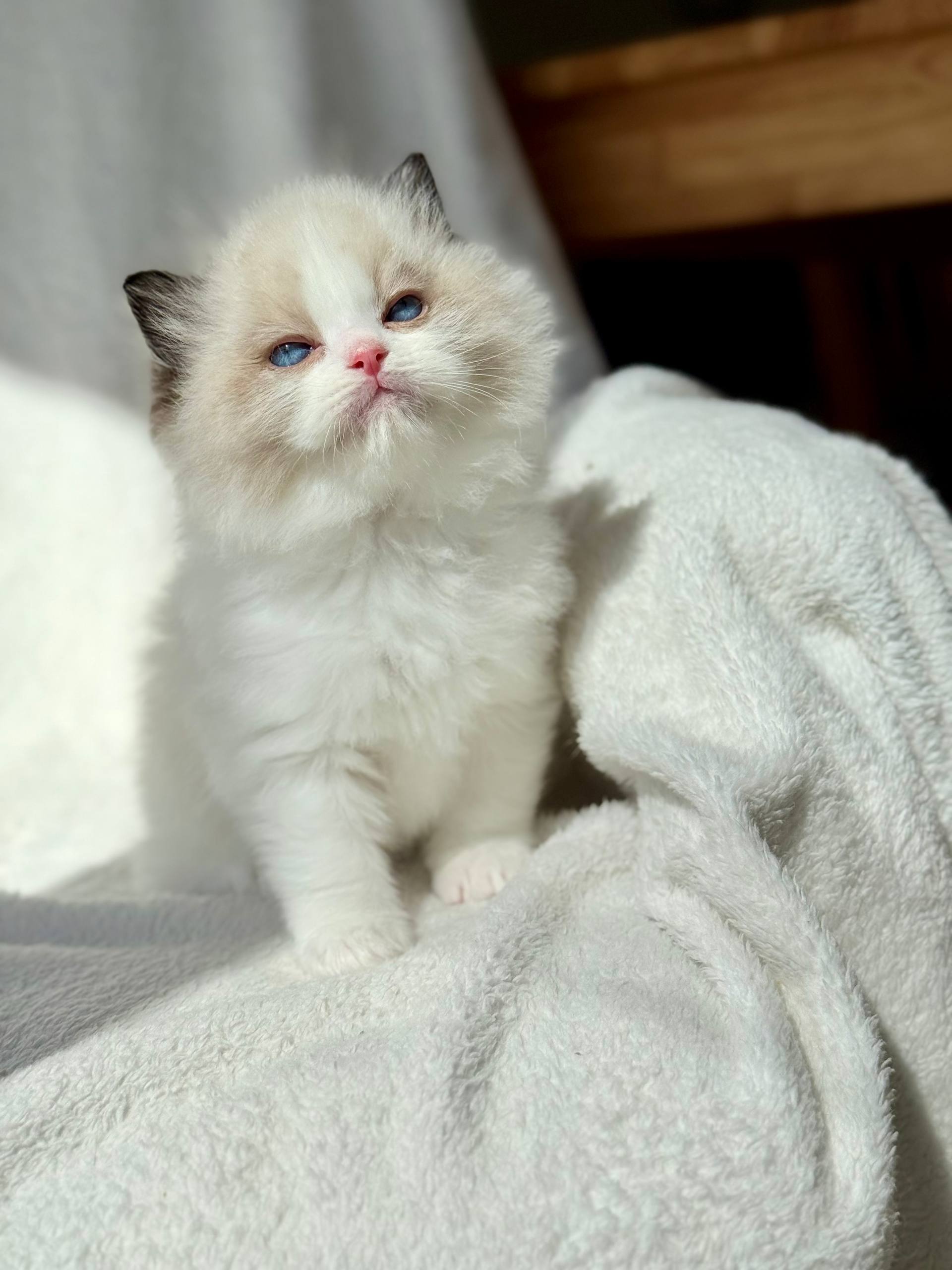 From the moment you scoop Rhine into your arms, his downy Seal Bicolor coat envelopes your hands—soft and plush like fine velvet. His clear blue eyes meet yours with a gaze so gentle and warm, you feel an instant comfort. Every line of his small, elegant frame promises elegance and serenity.