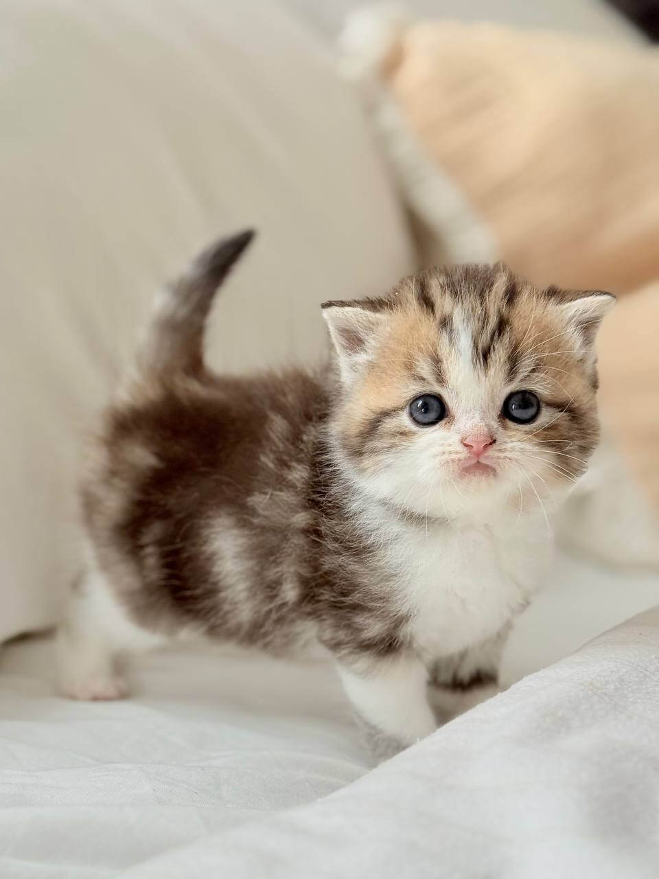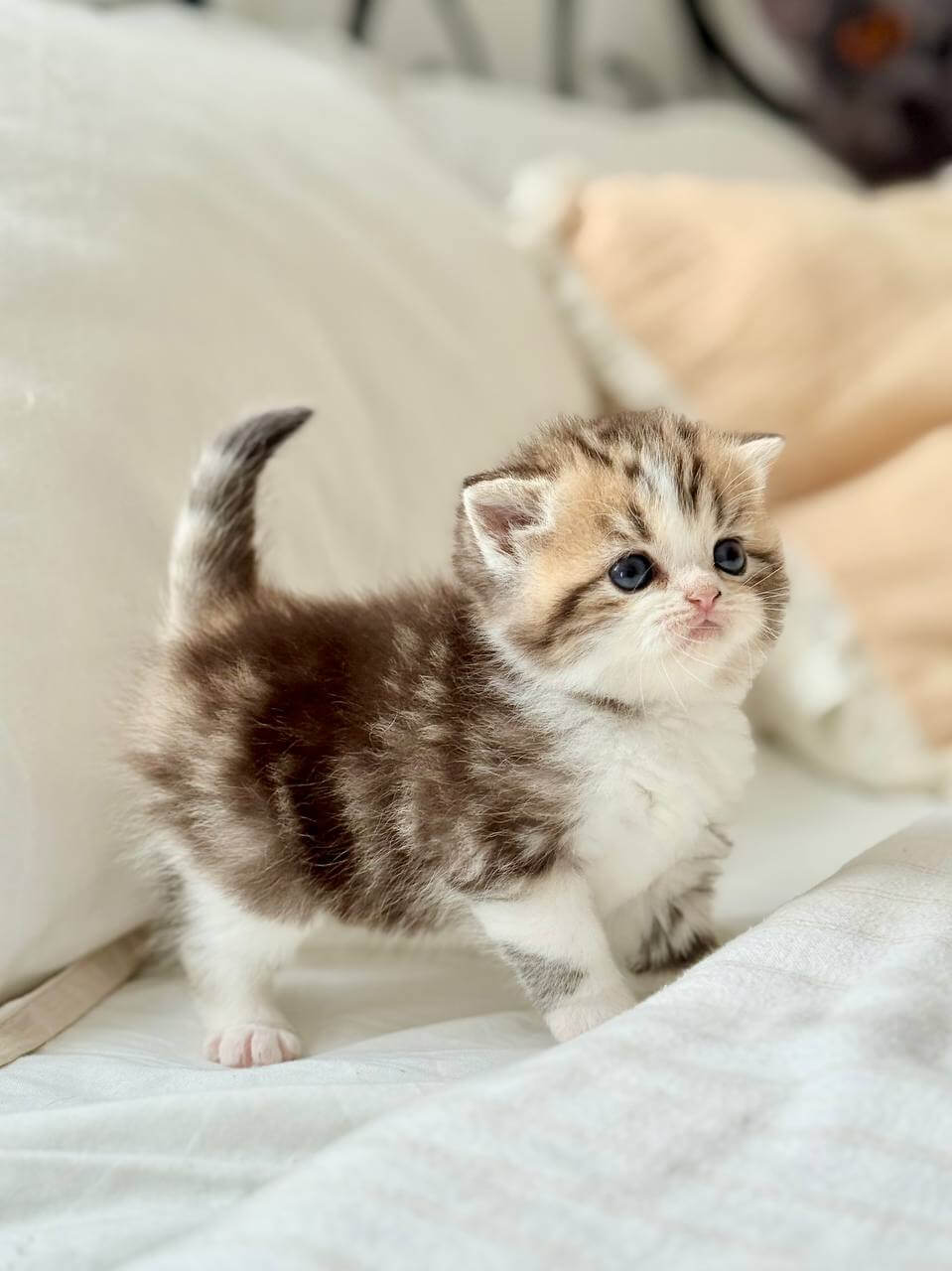 Meet Rihanna, our enchanting female Scottish Straight with a striking black tabby blotched coat, complemented by white accents and mesmerizing yellow eyes. Born on September 1, 2025, she’s ready to fill your home with love and joy starting January 1, 2026, when she’s set to leave her breeder house. Hailing from champion bloodlines, Rihanna is of show quality and comes with a conditional pedigree—simply ask for more details.