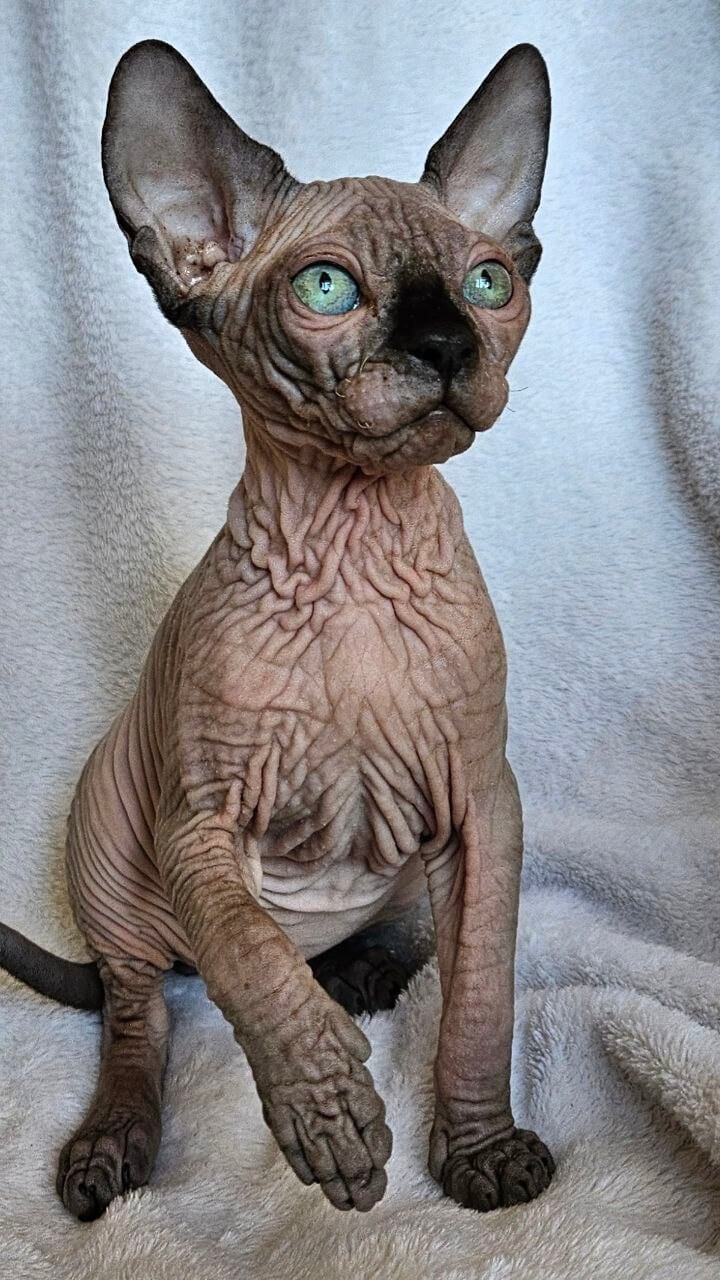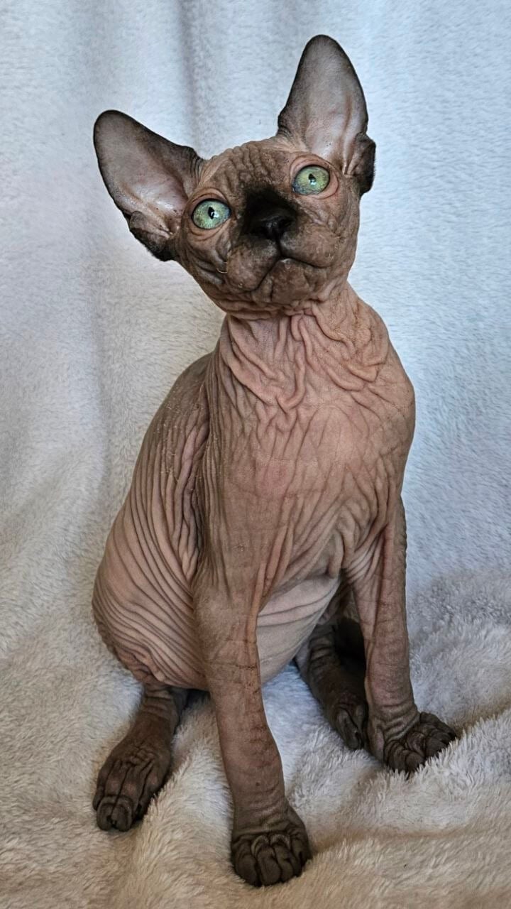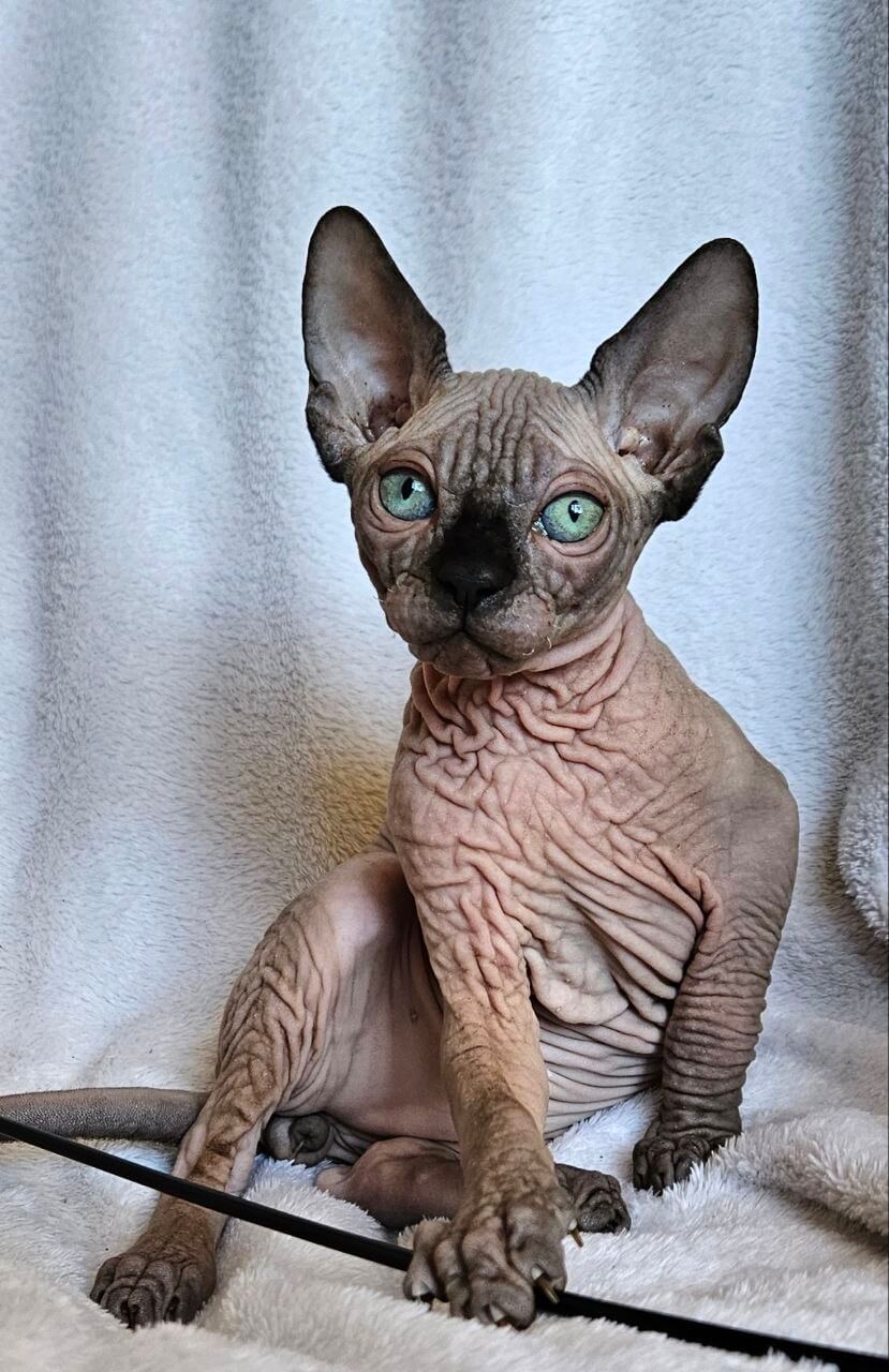 The moment you meet Robert, your fingertips discover the velvet touch unique to this Black Mink Sphynx kitten—his luxurious warmth is utterly surprising. His emerald green eyes glow with intelligence and affection, catching sunlight in dazzling ways. There’s a gentle weight when he settles into your arms, a softness paired with Sphynx devotion, making every cuddle unforgettable.