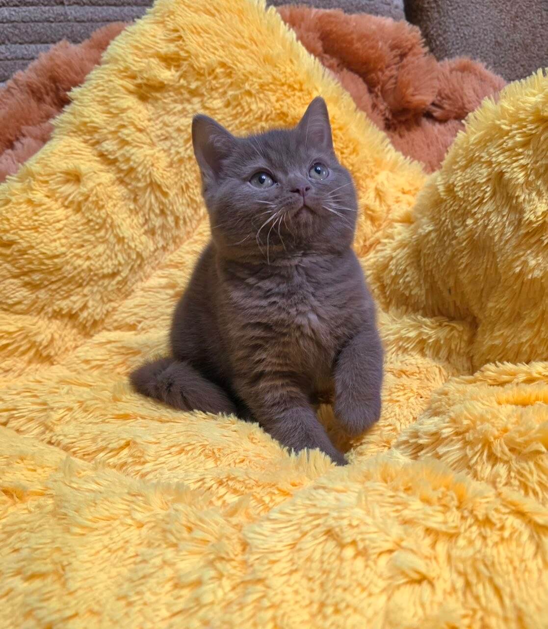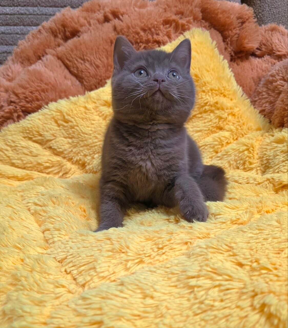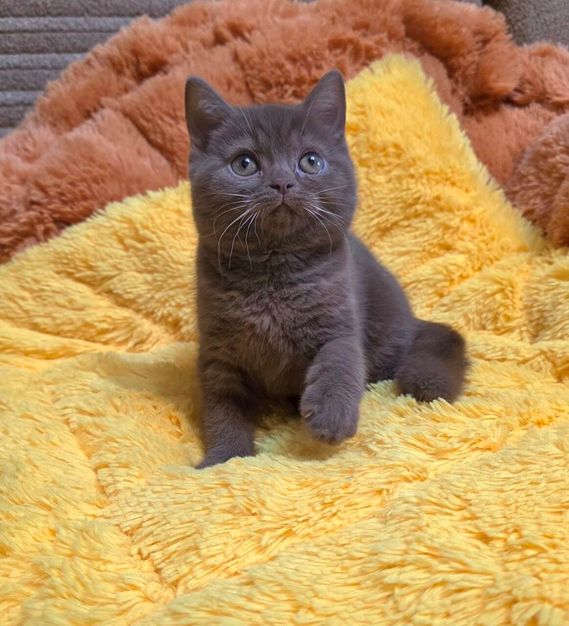 Run your hand across Rocky’s plush cinnamon coat and you’ll discover the unmistakable velvet of a true Cinnamon British Shorthair kitten. His thick, teddy bear fur feels like warm suede, an irresistible backdrop for those deep orange eyes that glow like polished copper in the soft light. Rocky carries gentle weight and a quiet, calming presence in your arms.