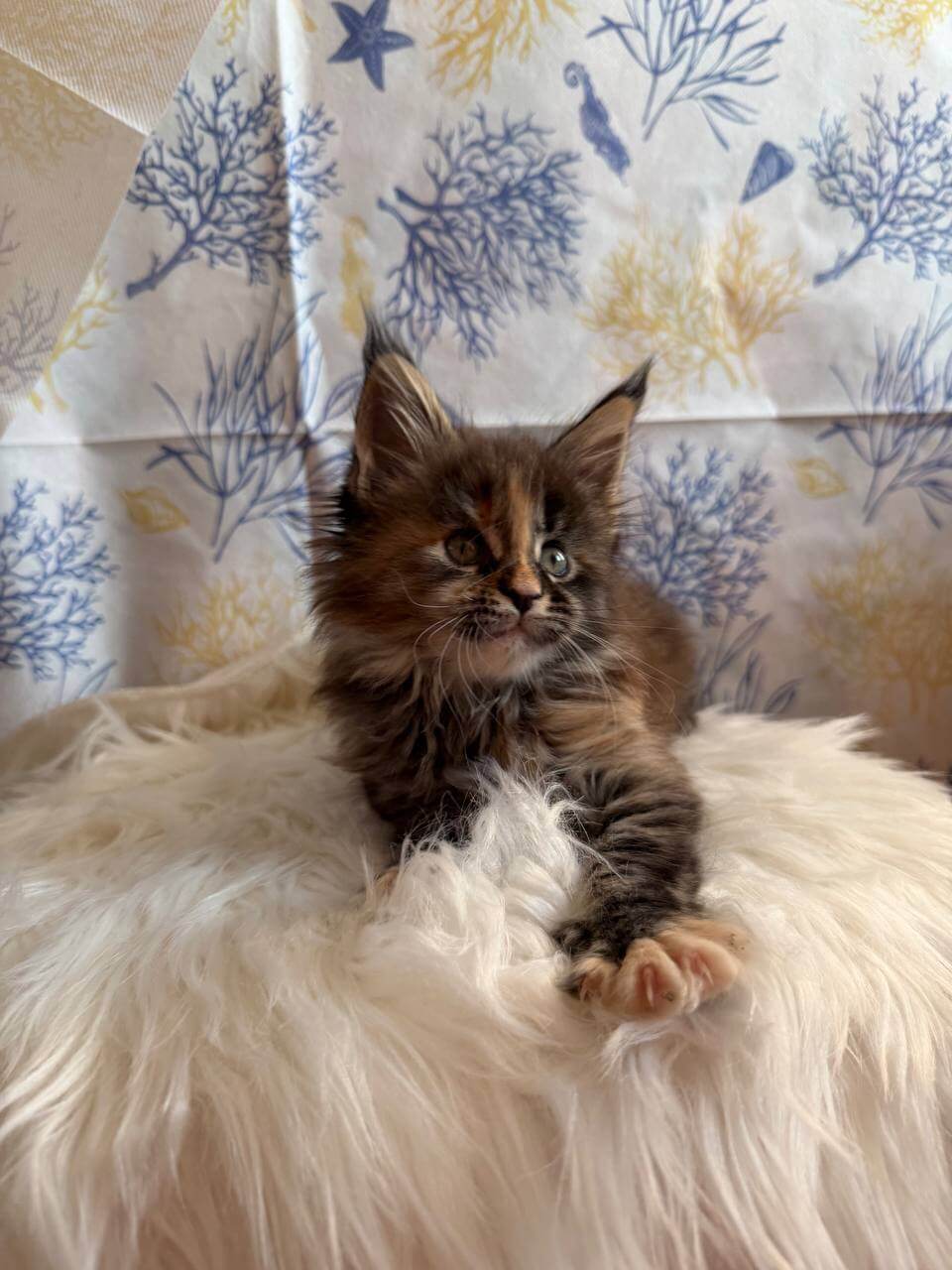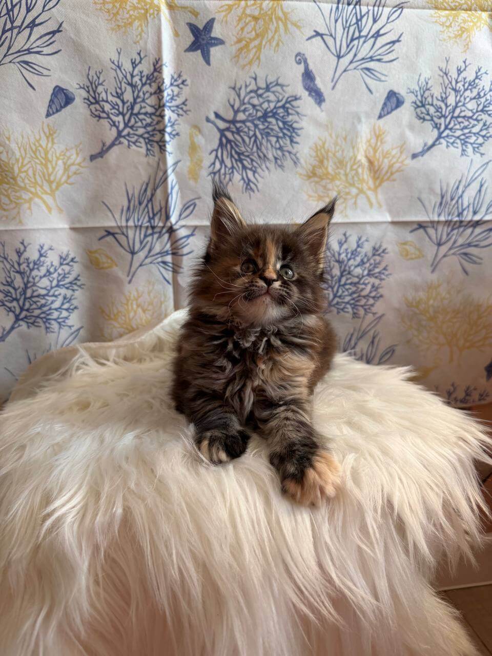 Meet Rona — your future heart-stealer wrapped in velvet black tortie fur, with soulful yellow eyes that glimmer like golden lanterns. She’s the kind of kitten who melts into your touch, gently purring as she nestles in, her warmth weaving right into your life from the very first cuddle.