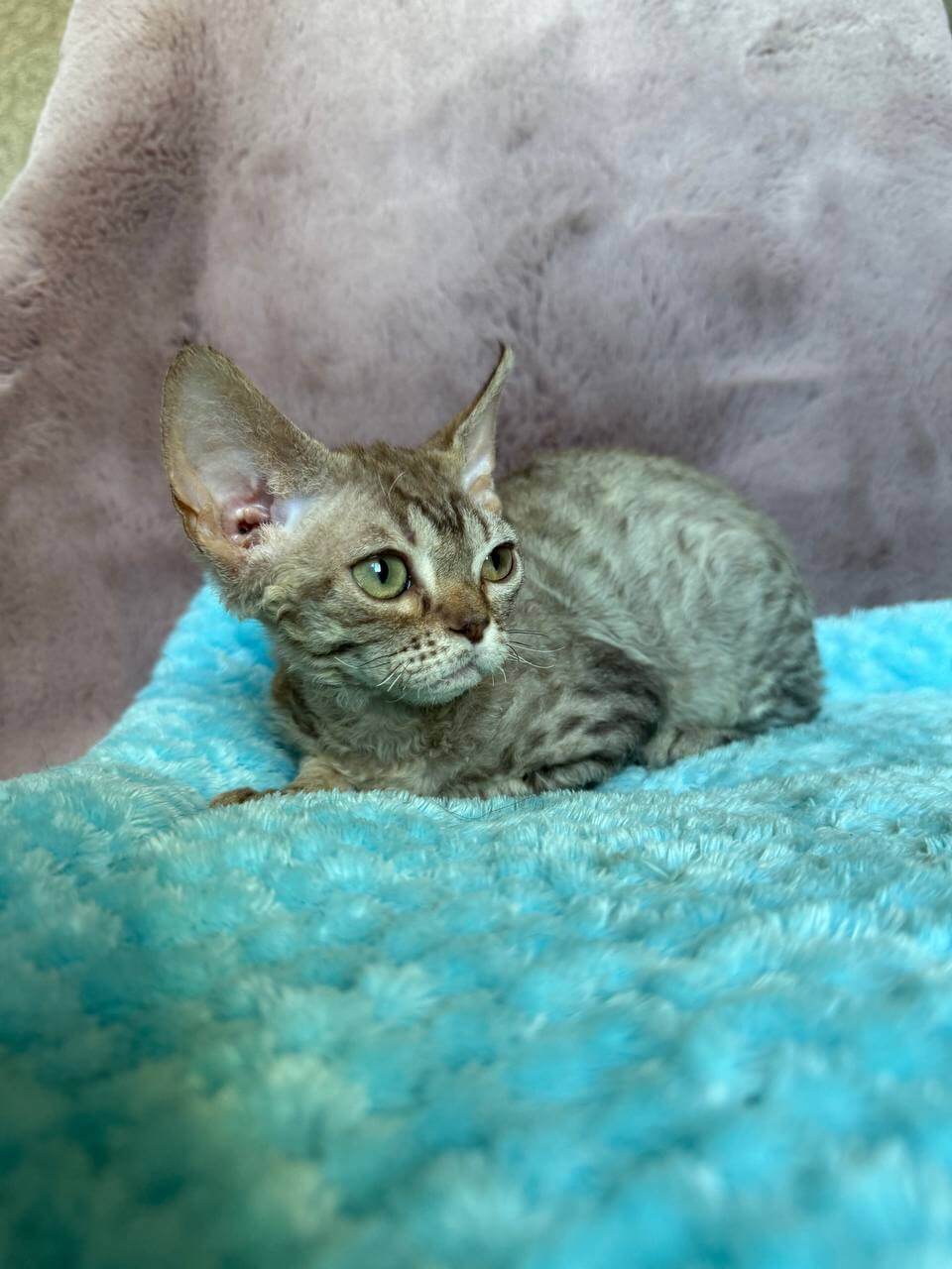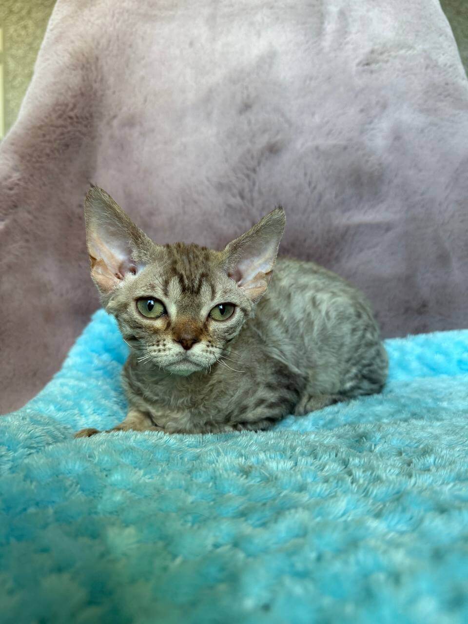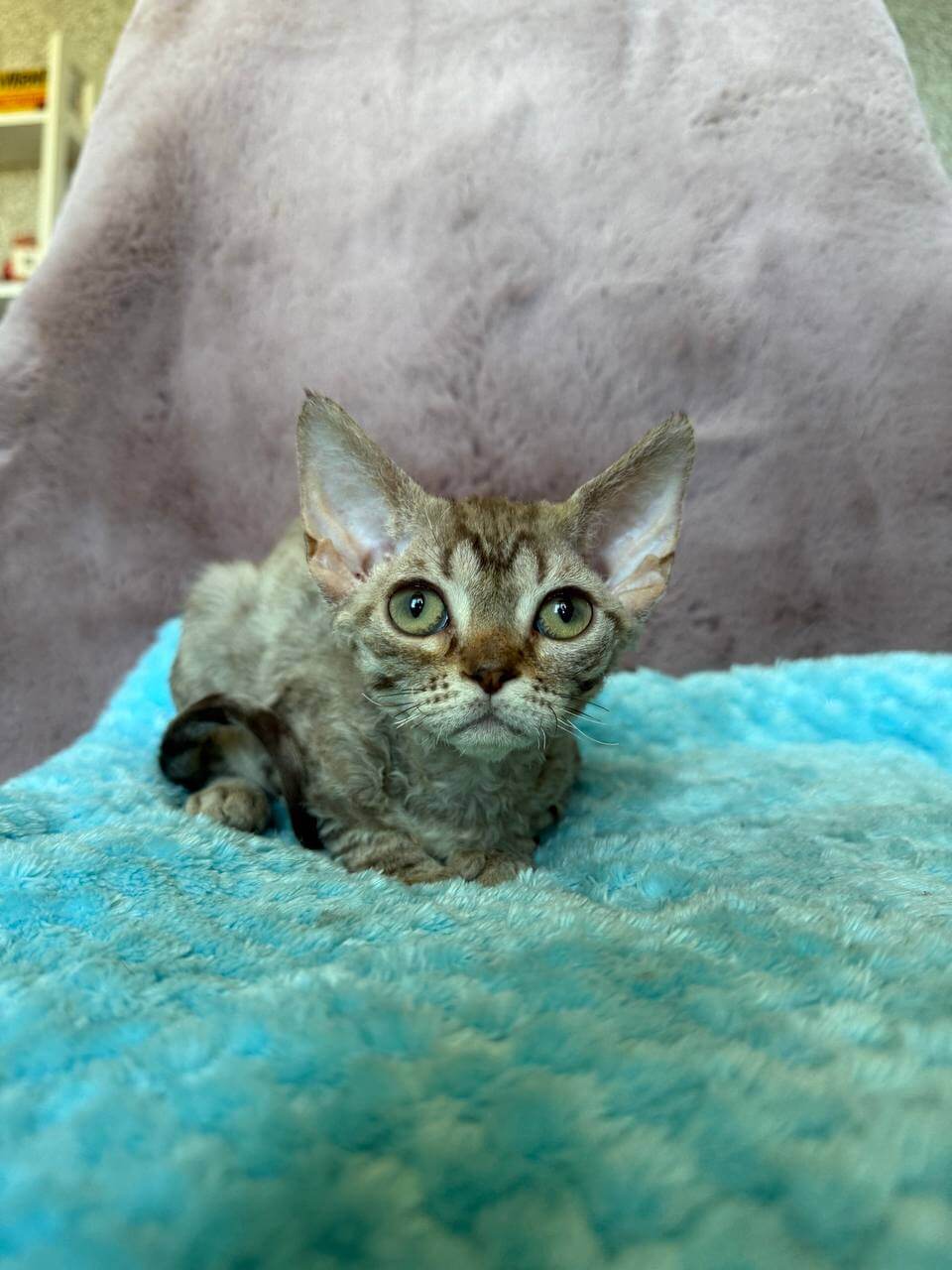 Meet Rory, an adorable male Devon Rex kitten with a charming chocolate tabby coat and striking green eyes. Born on June 10, 2025, Rory comes from champion bloodlines and is show quality, ensuring he’s as stunning as he is sweet. With conditional pedigree options available, Rory is registered and set to join a loving home, ready to leave his breeder on October 10, 2025, after being neutered/spayed as a pet.