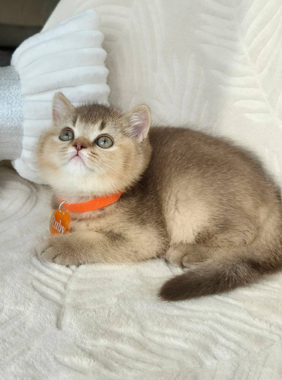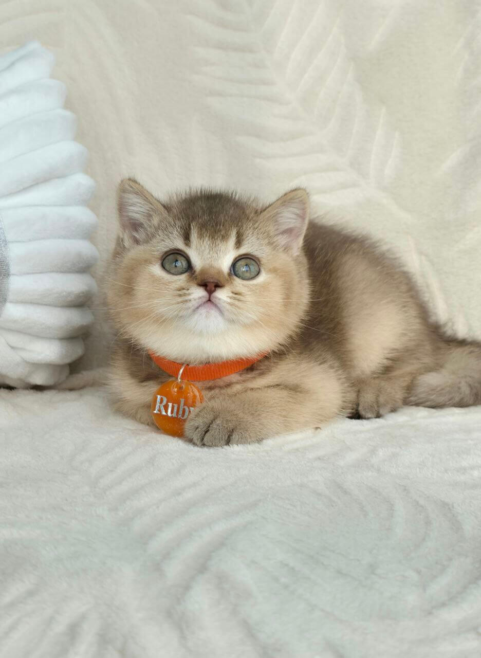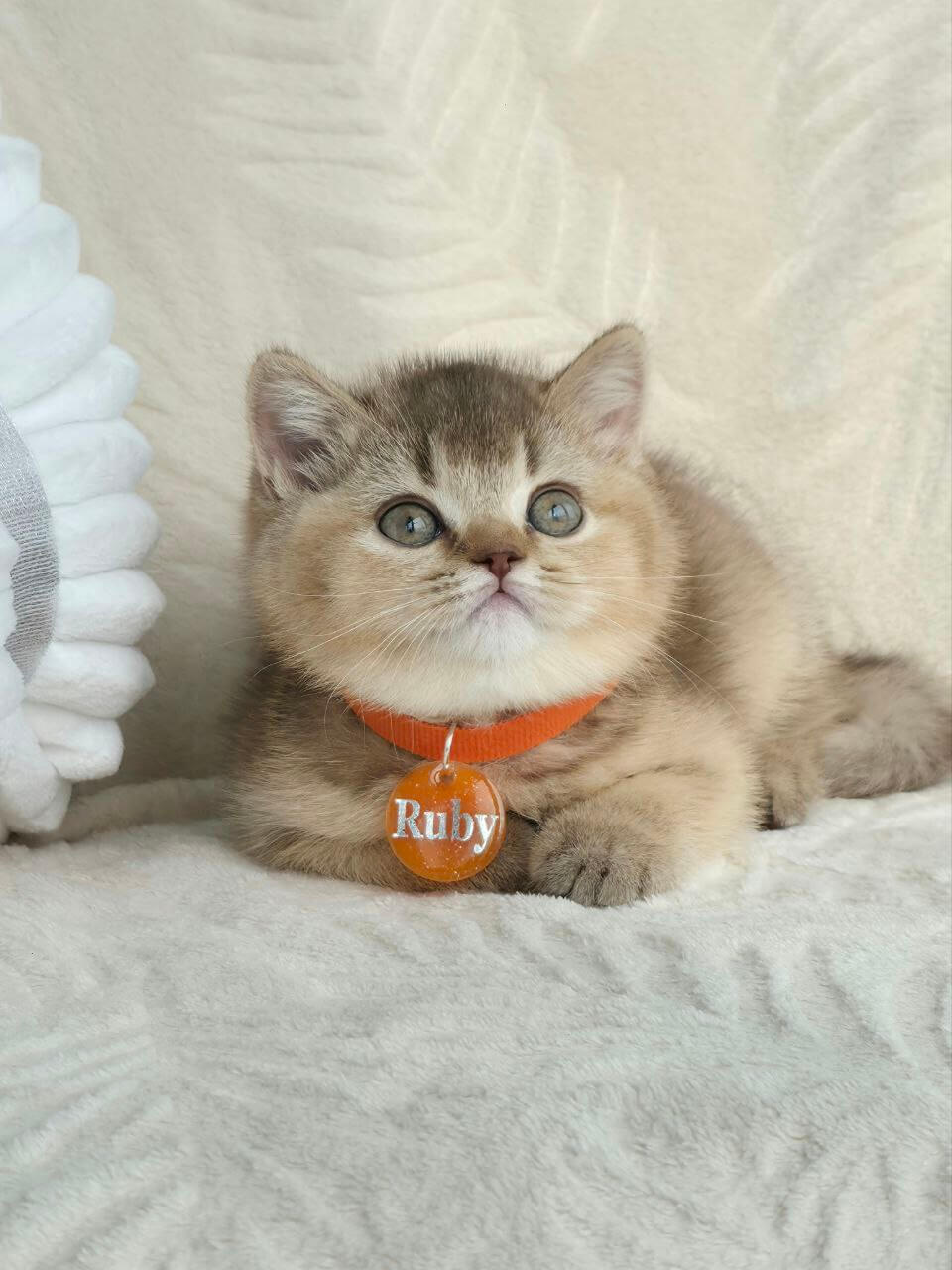Ruby is a rare jewel with champion bloodlines, bringing you the best of the British Shorthair: affectionate, playful, and oh-so-cuddly. She adores nestling into cozy arms, follows you with quiet devotion, and will win your heart with her charming nature and plush coat.