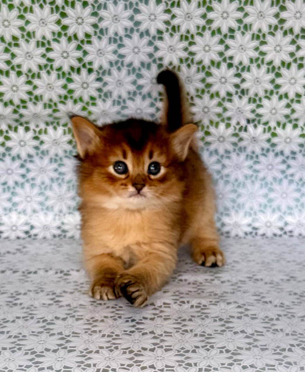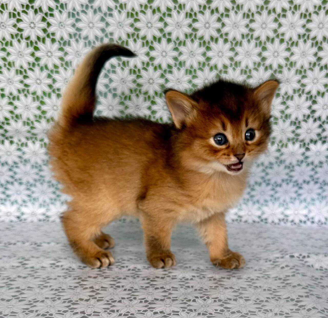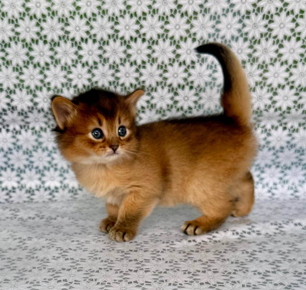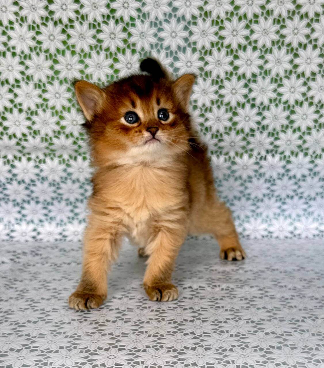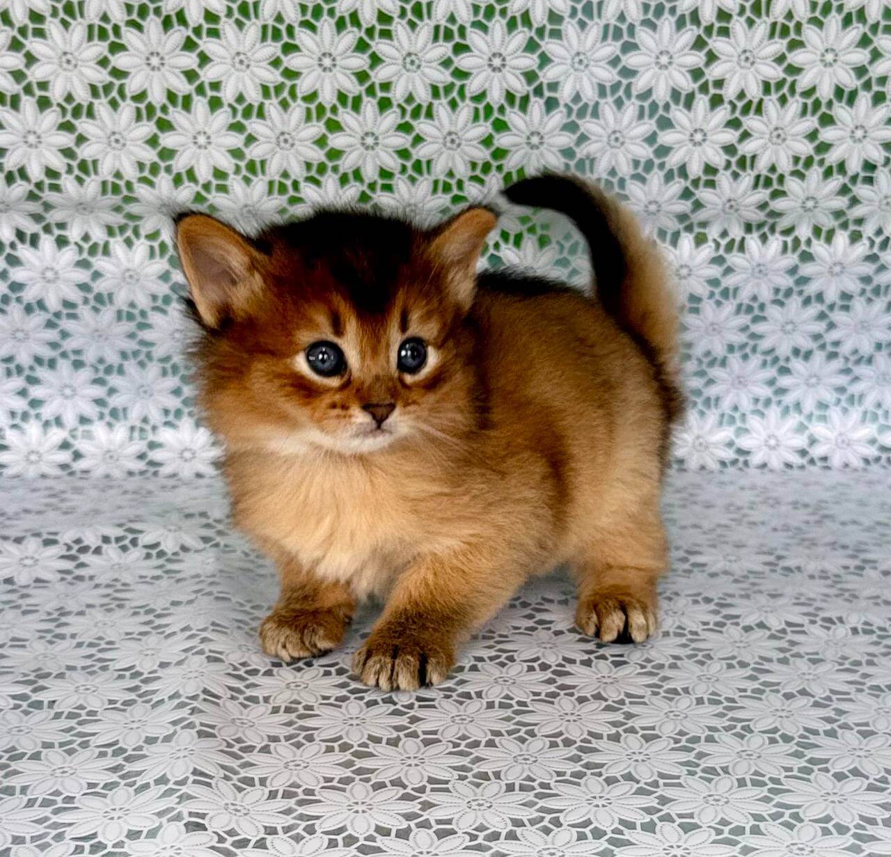 Fall in love at first touch with Sapphira, our enchanting ruddy Somali kitten—a little queen with a coat as soft and warm as cinnamon toast, and golden-yellow eyes brimming with curiosity and affection. Sapphira is pure elegance in a petite, playful package: she adores gentle cuddles, purrs delightedly at every chin scratch, and lights up every room with her mischievous charm and signature fluffy plume tail.