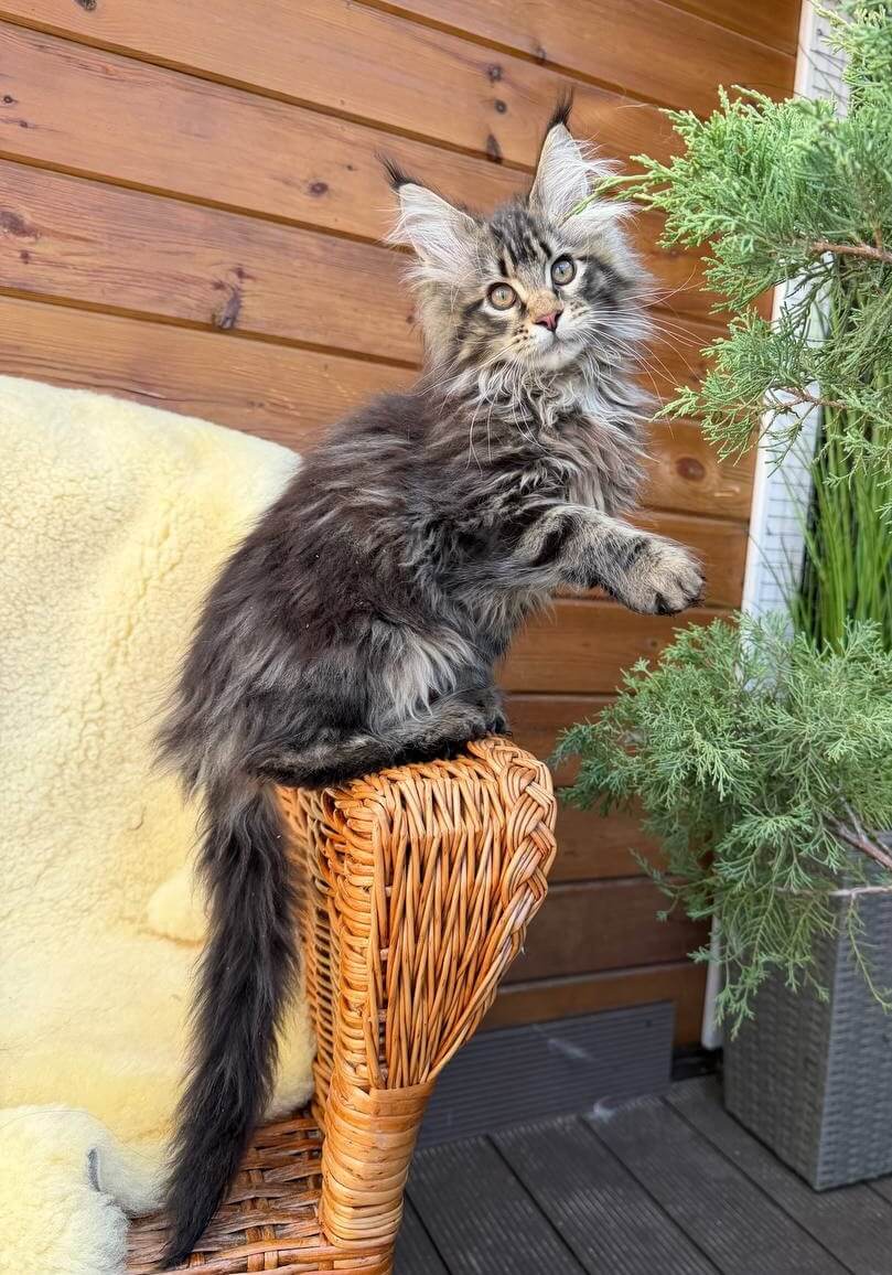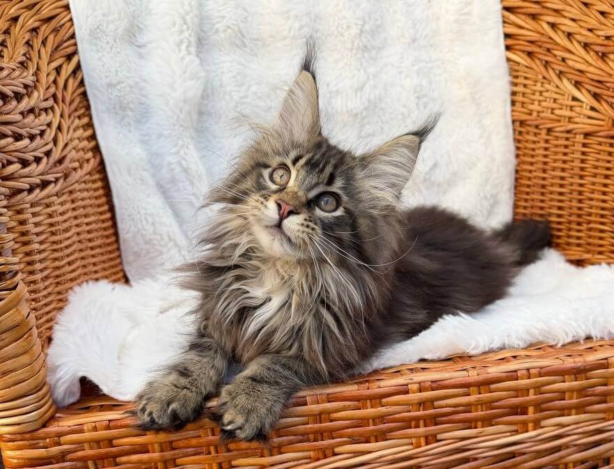 Sima’s personality is pure Maine Coon: observant, quietly confident, and clever. She’ll greet you at the door with a chirr, tail high, then wind her way around your ankles as she surveys the room. At night, you’ll find her perched at your bedside—never imposing, but always watchful—content to be near those she chooses as her true companions.