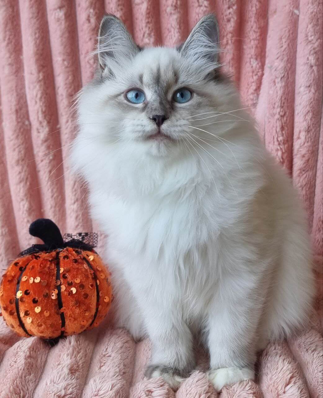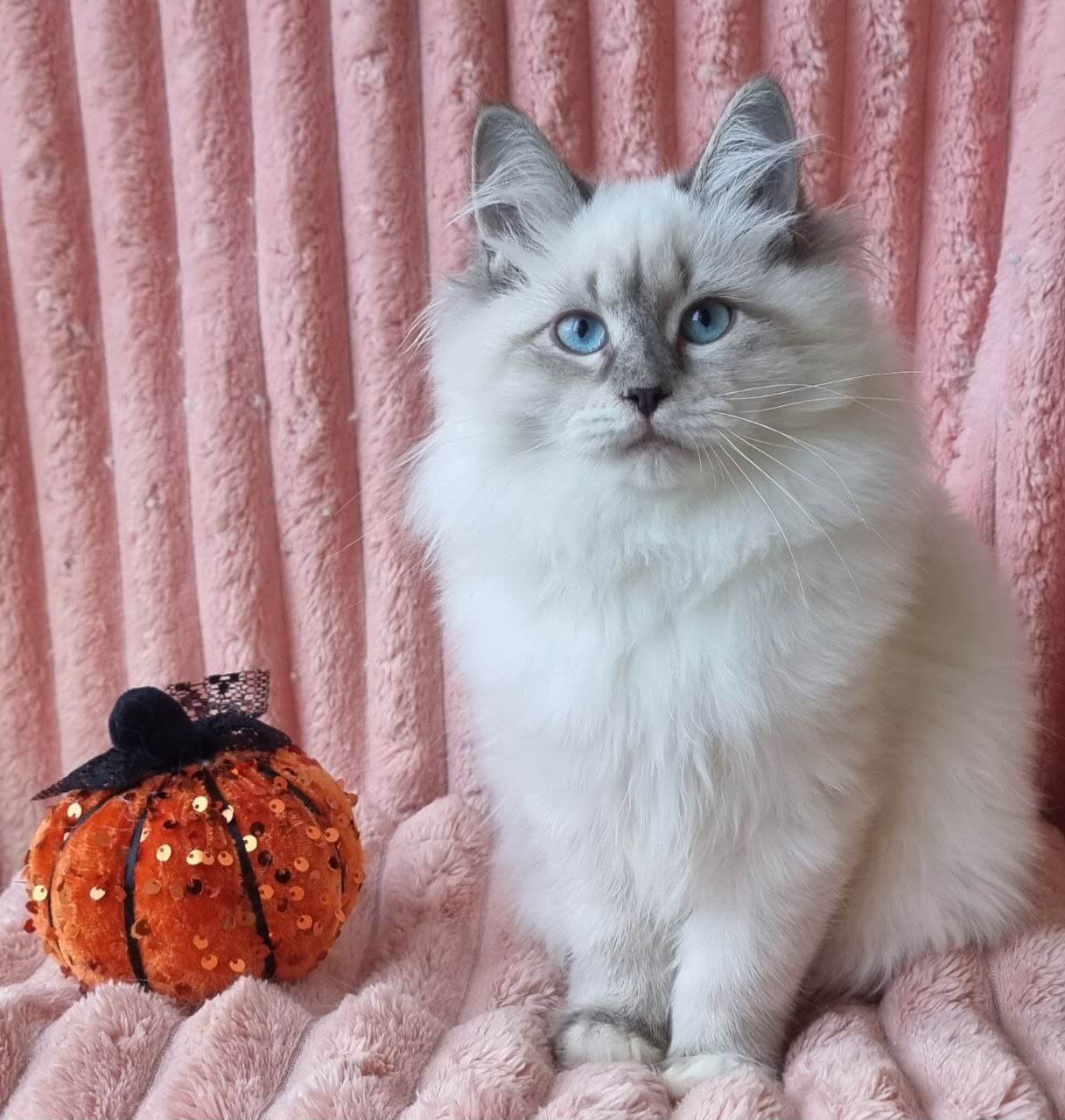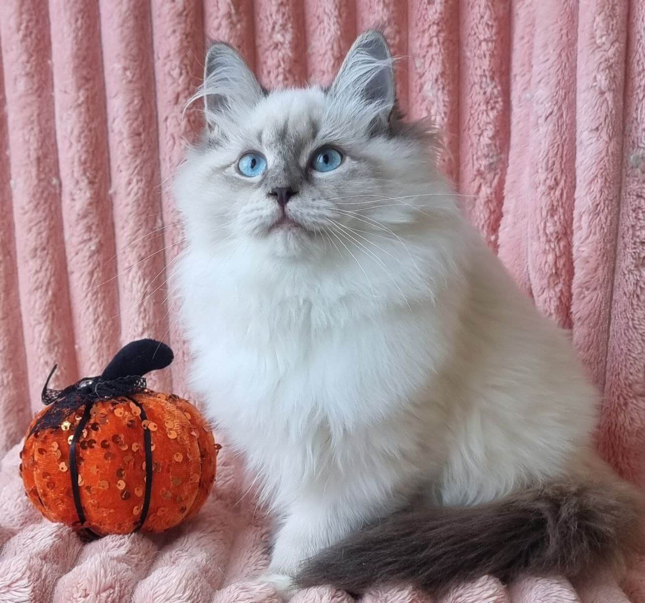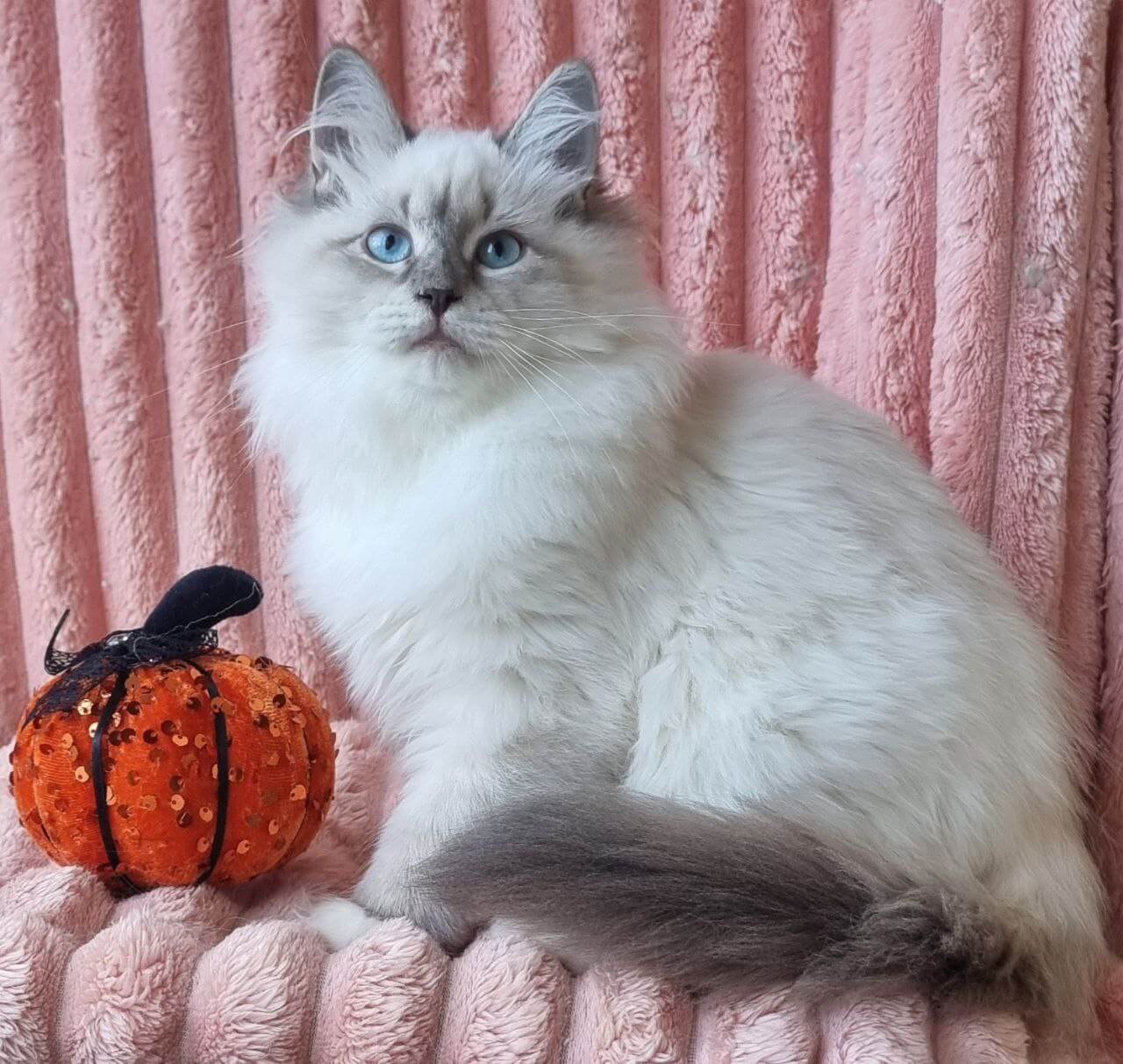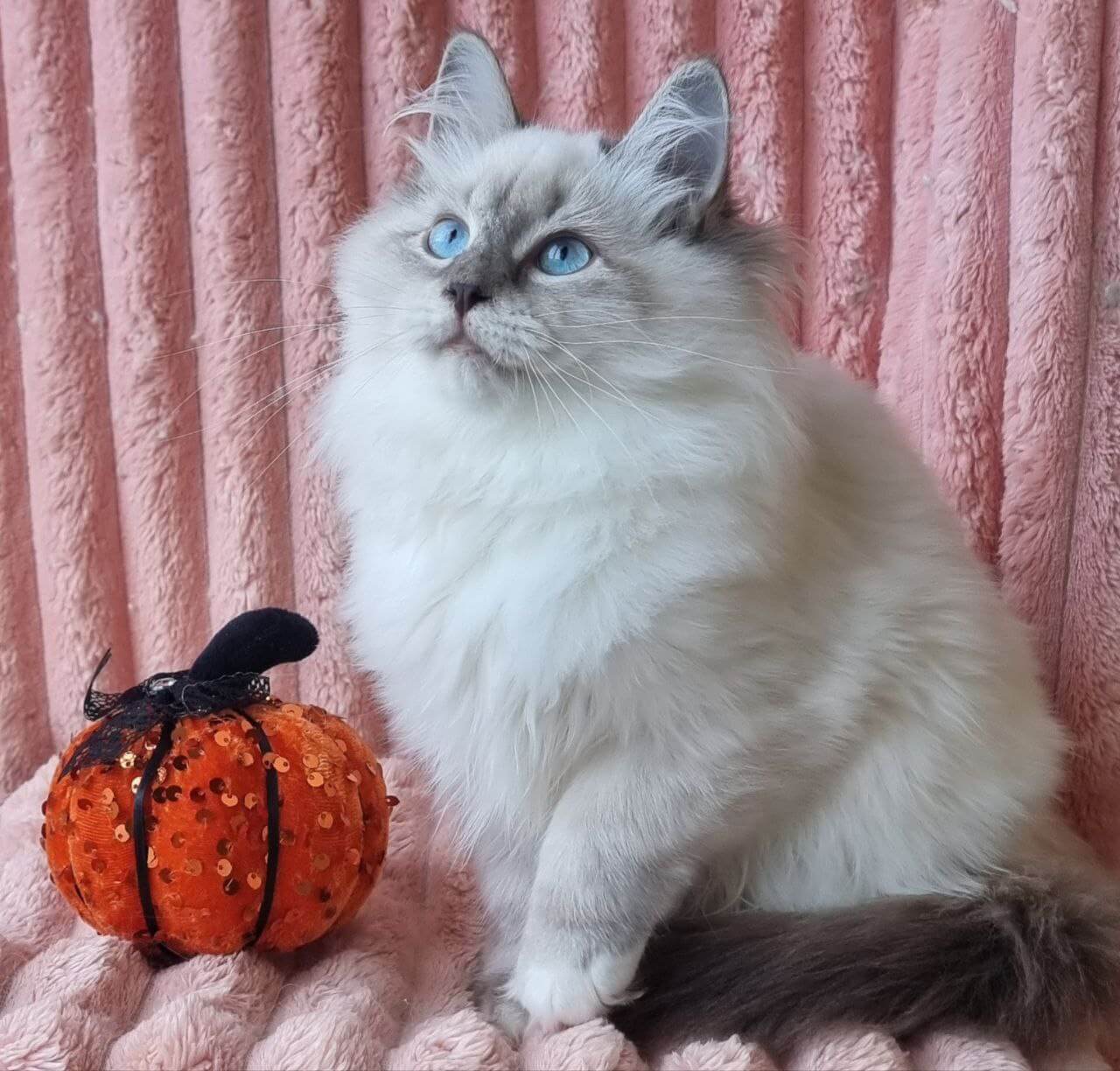This enchanting girl is a blue lynx point with white—her silvery fur glows against her pure snow-white markings, and her gaze shimmers a soulful blue. Sireniya is as affectionate as she is stunning, greeting gentle hands with purrs and playful swishes, and curling contentedly in warm laps. Her temperament is pure Siberian: calm, clever, cuddly, and wonderfully social with both people and other pets.