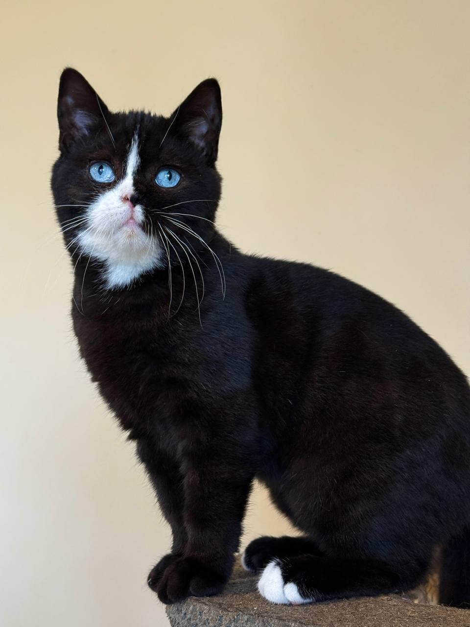 The first time you meet Sky, a Black Scottish Straight kitten, you’ll notice how the light shimmers across his midnight black coat, impossibly soft to your touch. His blue eyes are clear and glimmering, drawing you in with a gentle, almost inquisitive gaze. Pick him up and you’ll feel his warmth, his small weight grounding you in the moment.