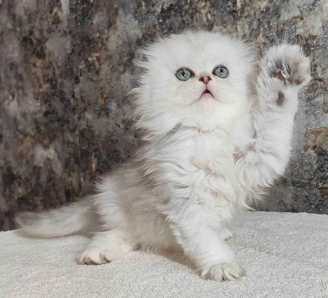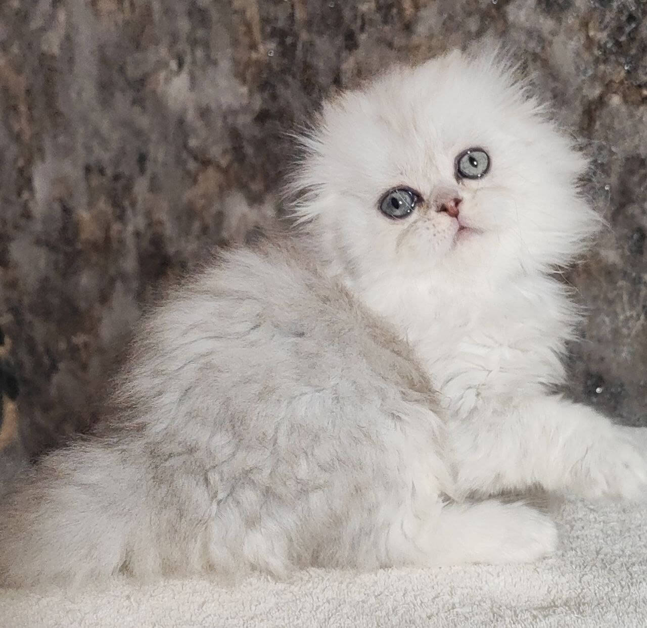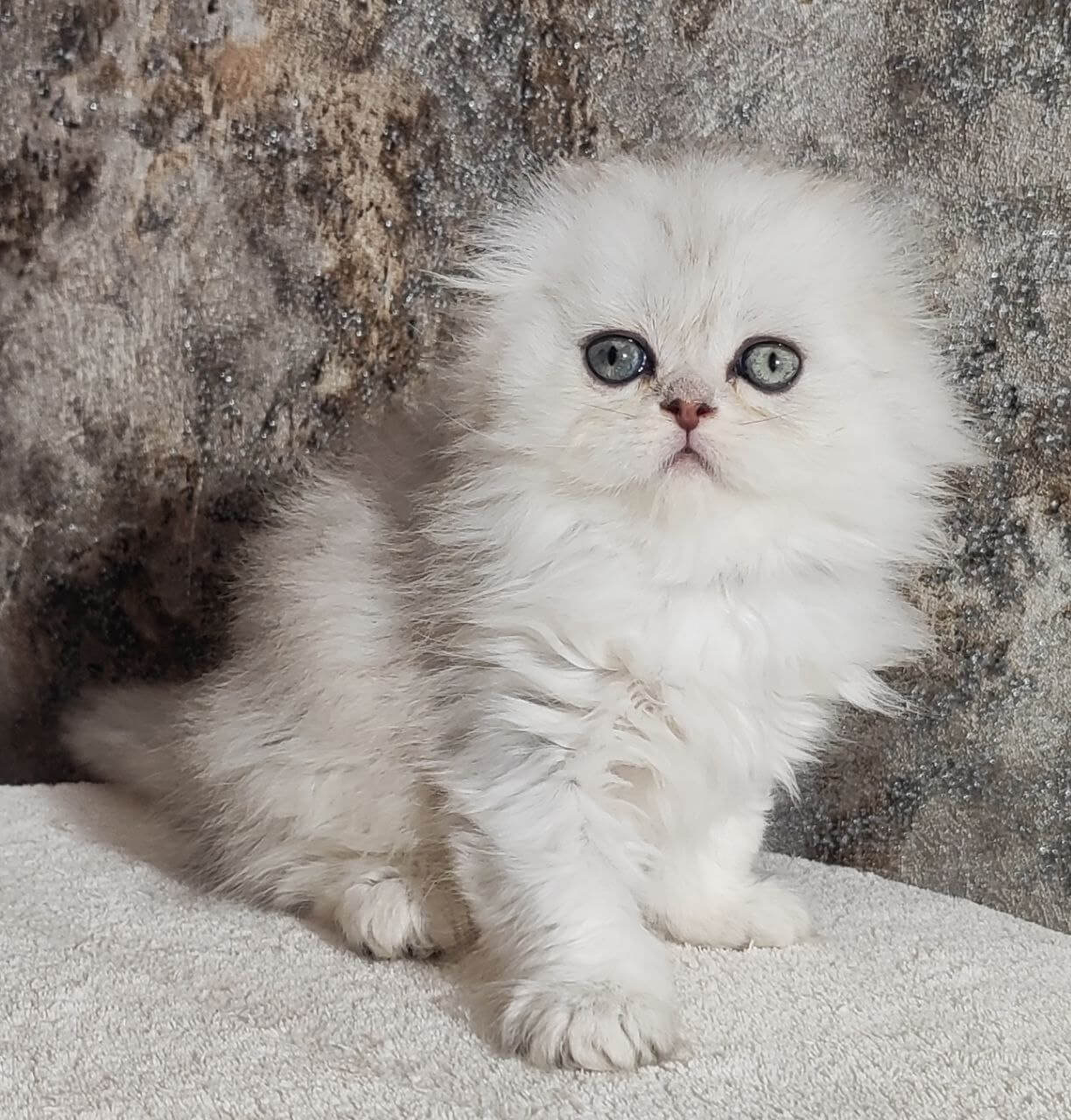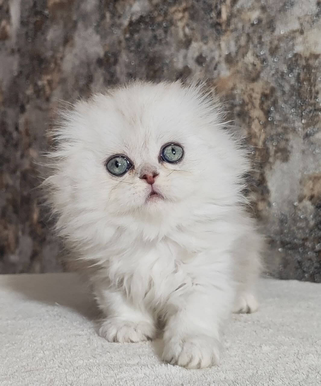 Spencer is a Blue Silver Shaded Scottish Fold kitten whose plush, cloud-soft fur invites every touch. When you meet him, his green eyes shine like dew-kissed leaves, catching a glint of light as he looks up at you. Tuck him in your arms, and you’ll feel a gentle, steady warmth that instantly soothes the soul.