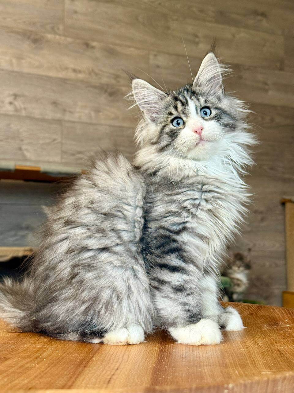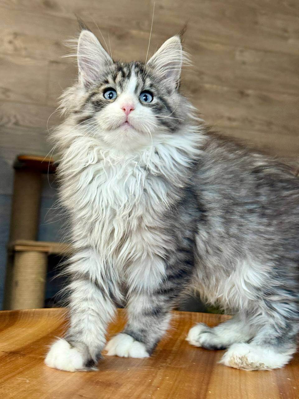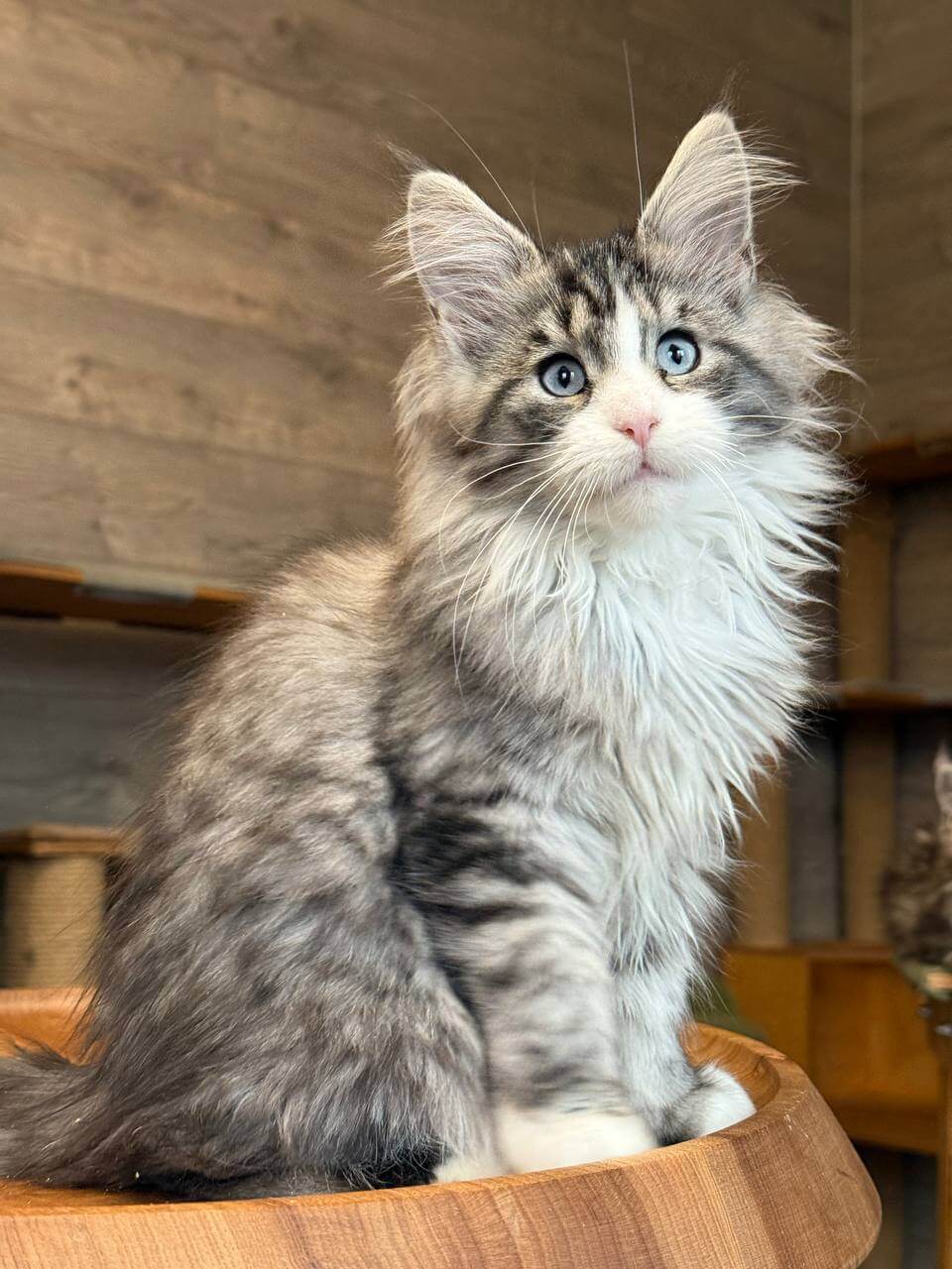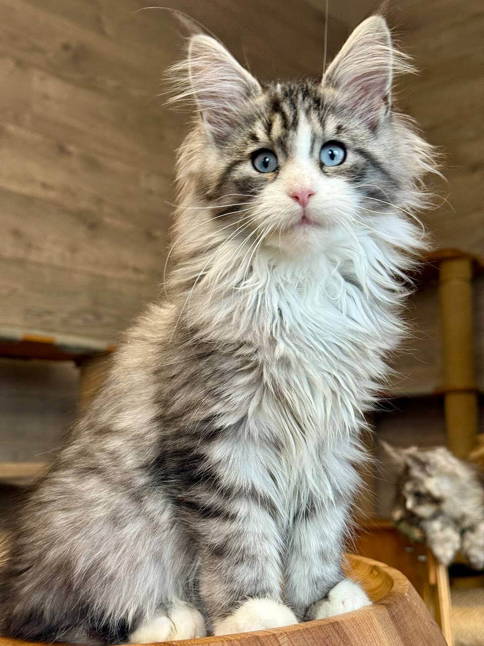 Sultan, a Black Silver Tabby Spotted Maine Coon kitten, instantly delights your senses with his dramatic ink-rippled coat and striking blue eyes. Each time you lift him, you feel the sturdy, gentle strength that sets Maine Coons apart. His fur is plush and silky, with subtle stripes that ripple when you stroke his back, and his gaze radiates curiosity and quiet devotion.