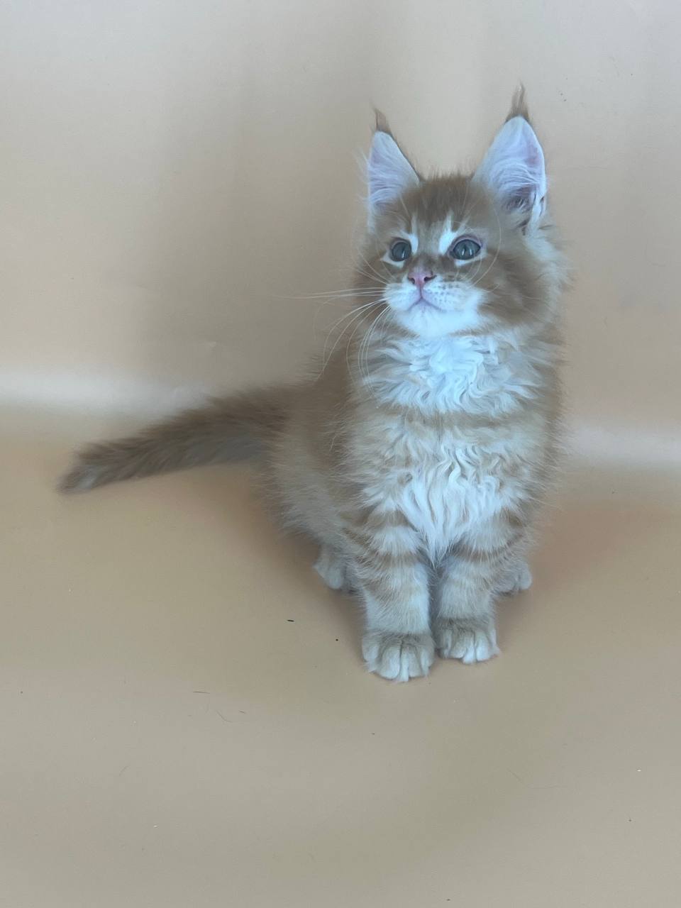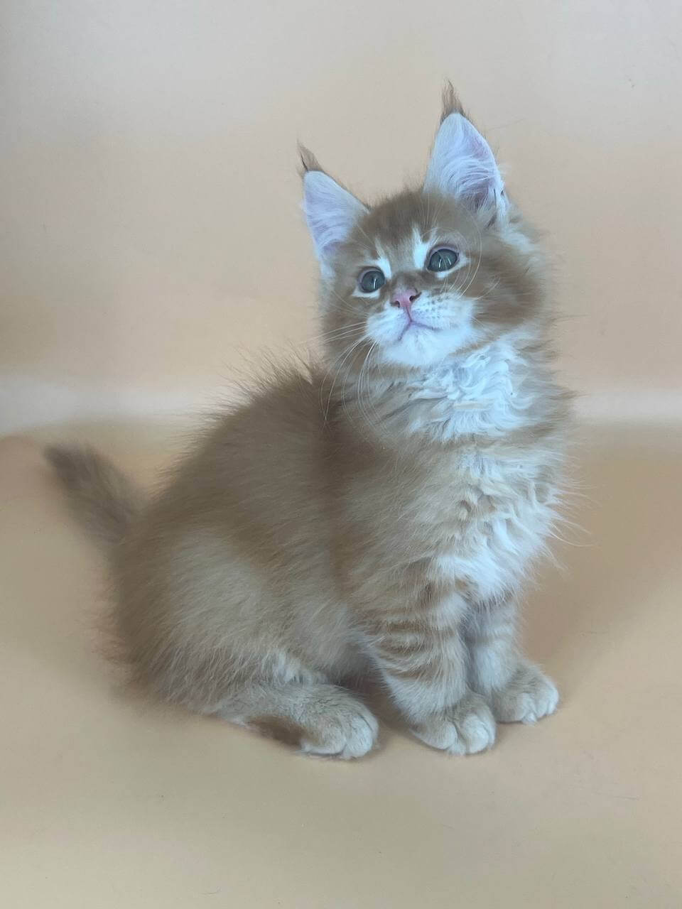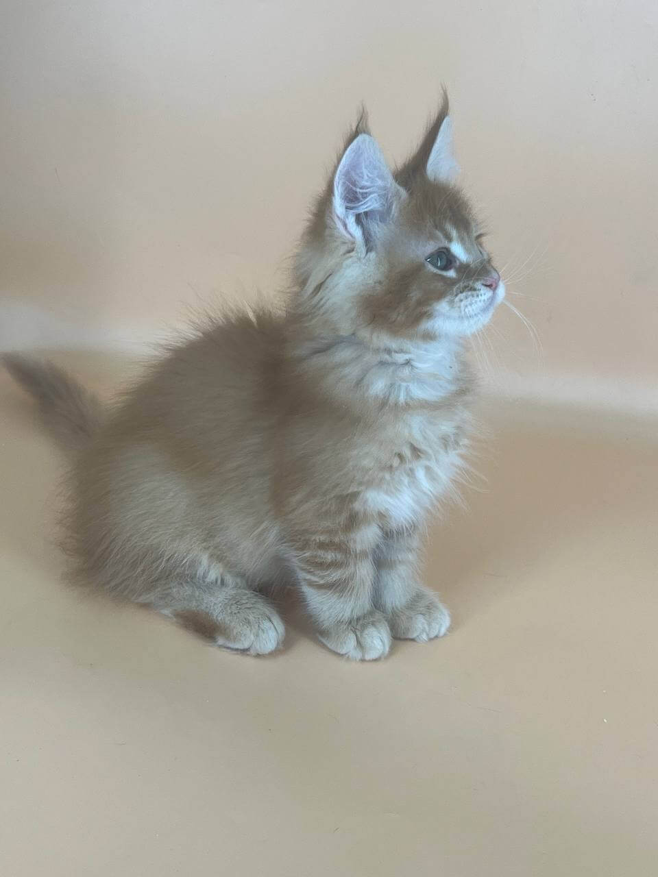 Tiguan is a Red Maine Coon kitten with a strikingly warm presence. His long, luxurious coat is dense yet silky, begging to be stroked as he relaxes in your arms. Vivid yellow eyes beam with curiosity, their golden flecks catching afternoon light. When Tiguan curls up beside you, his gentle purr sends a comforting hum right to your heart.