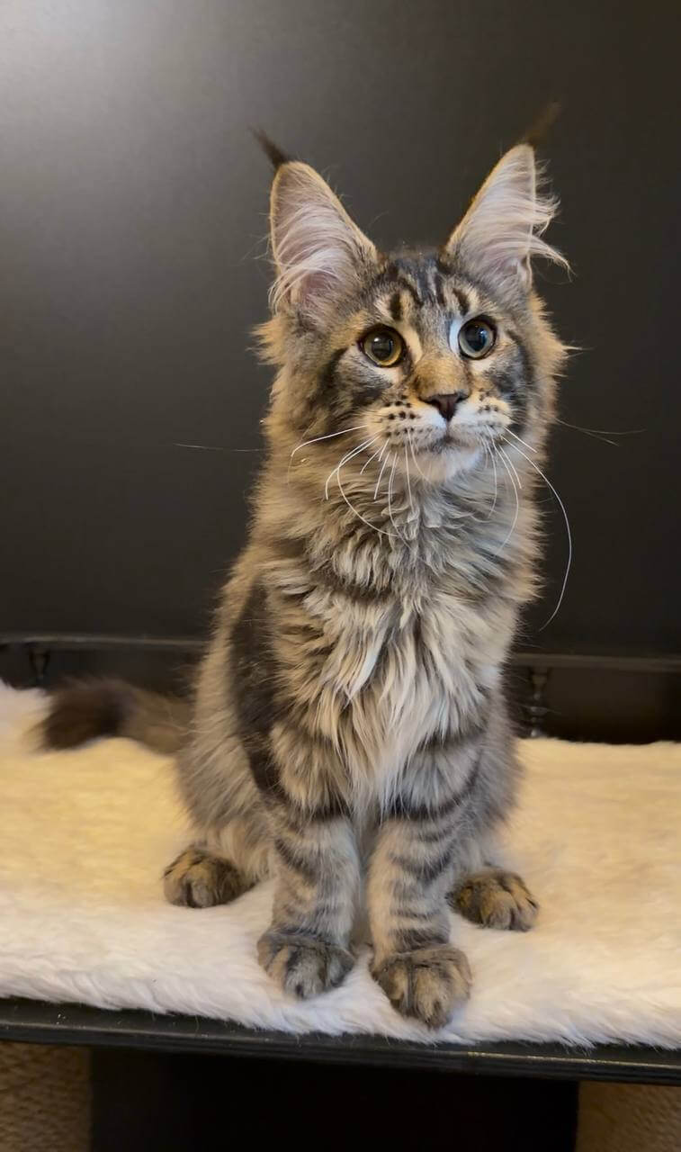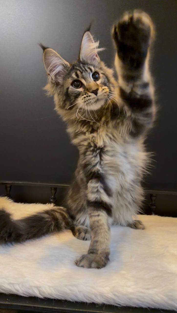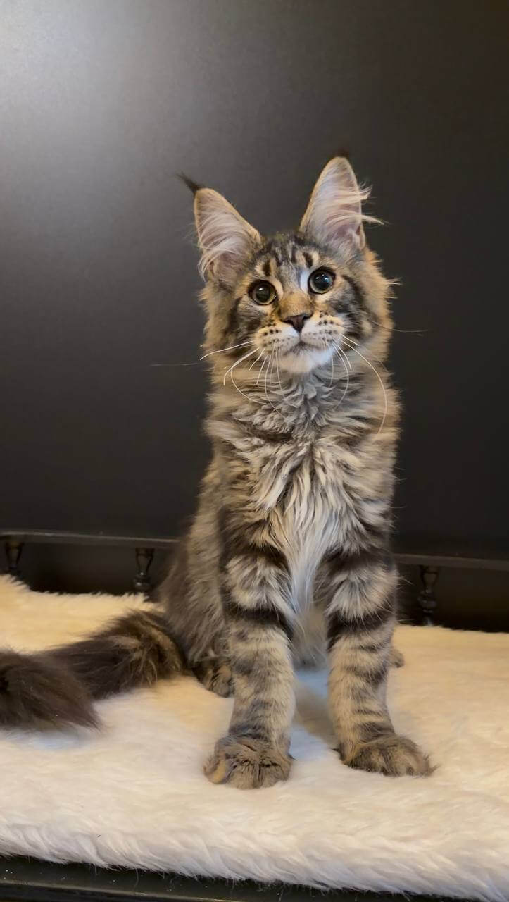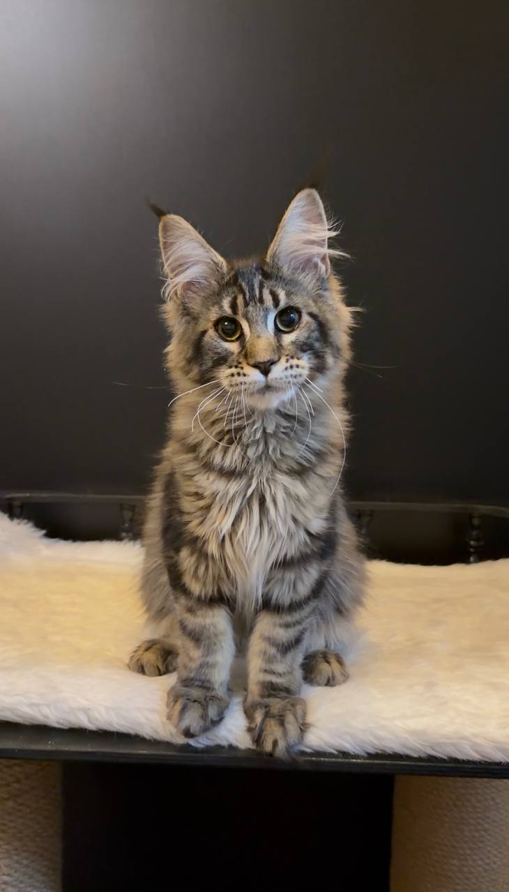 Tymon is a Black Tabby Blotched Maine Coon kitten whose presence instantly draws you in. His thick, velvety coat ripples with deep, smoky stripes, perfectly framing his long, strong body. When Tymon gazes up at you, his gold-yellow eyes glow with a gentle, intelligent warmth, full of curiosity and connection. Holding him, you’ll notice a reassuring heaviness—classic Maine Coon stature, all muscle and softness.
