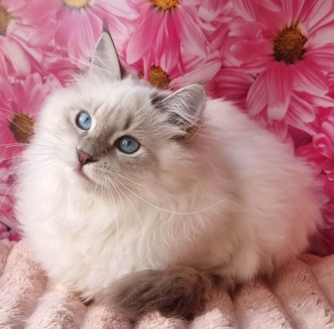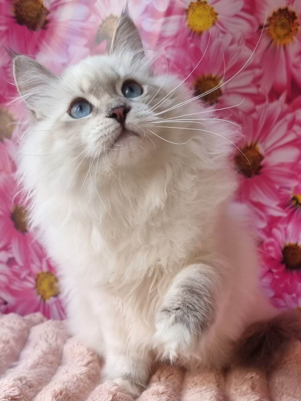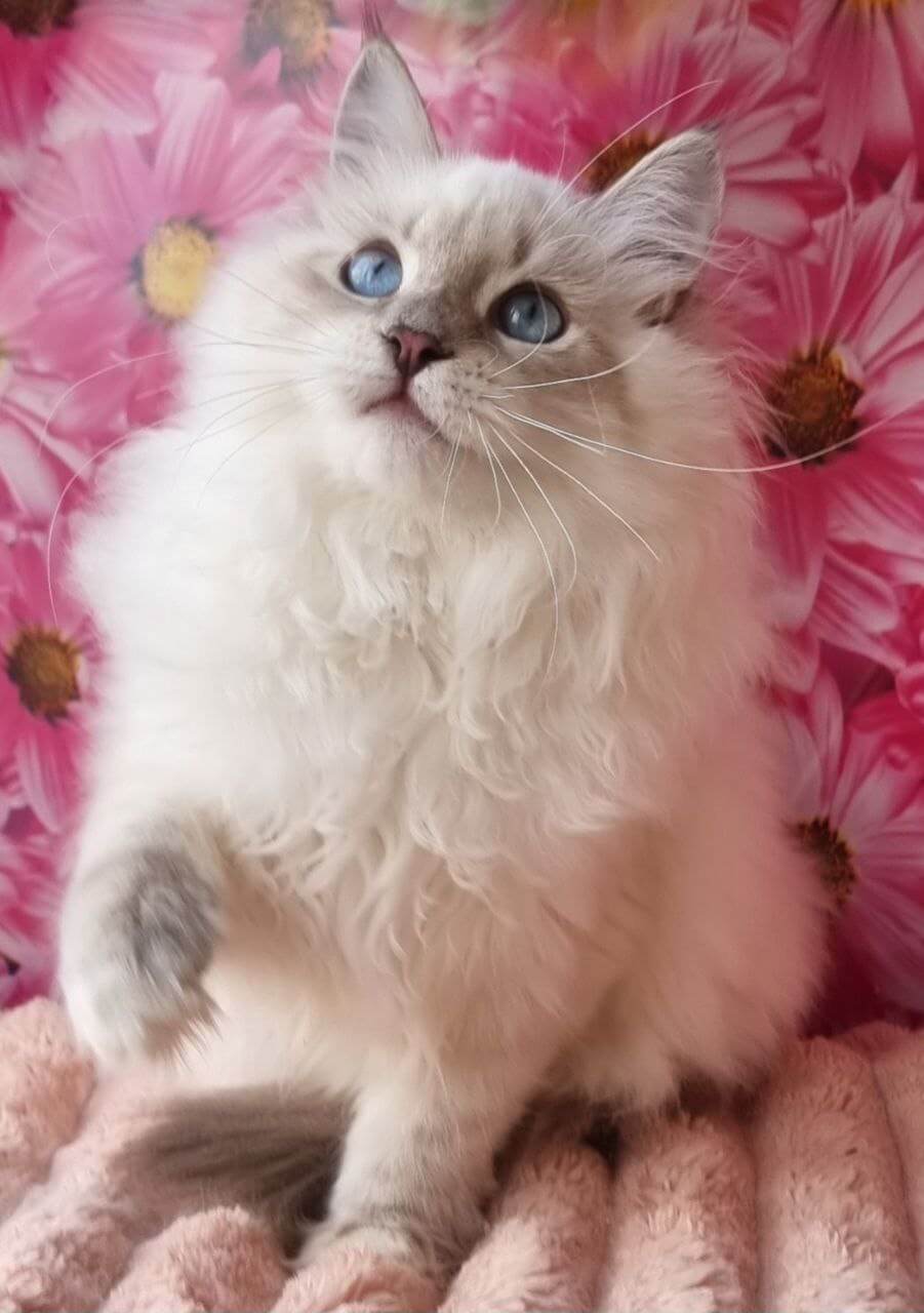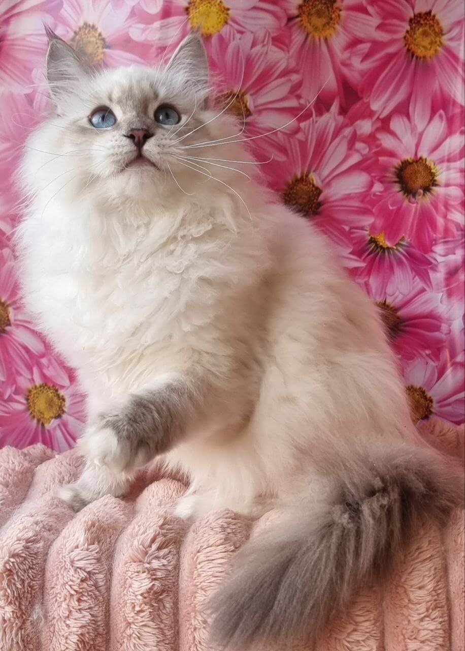 Meet Ulyaniya, a blue-eyed whisper of winter wonder—her velvety blue lynx point coat and delicate white markings are matched only by the sweetness in her gaze. From the moment you stroke her plush fur, Ulyaniya will purr her way into your heart, craving gentle cuddles and sharing her warmth with trusting softness.