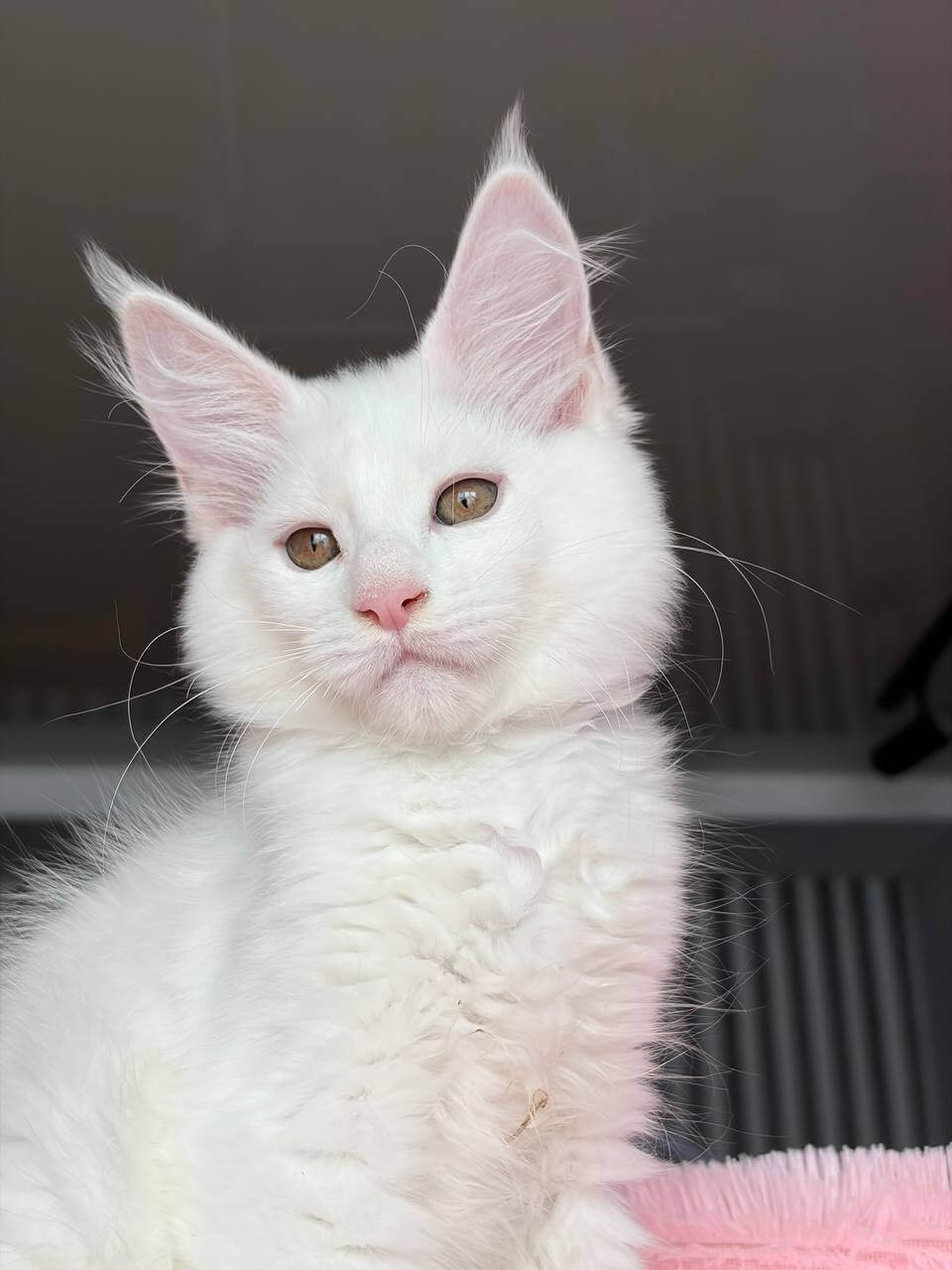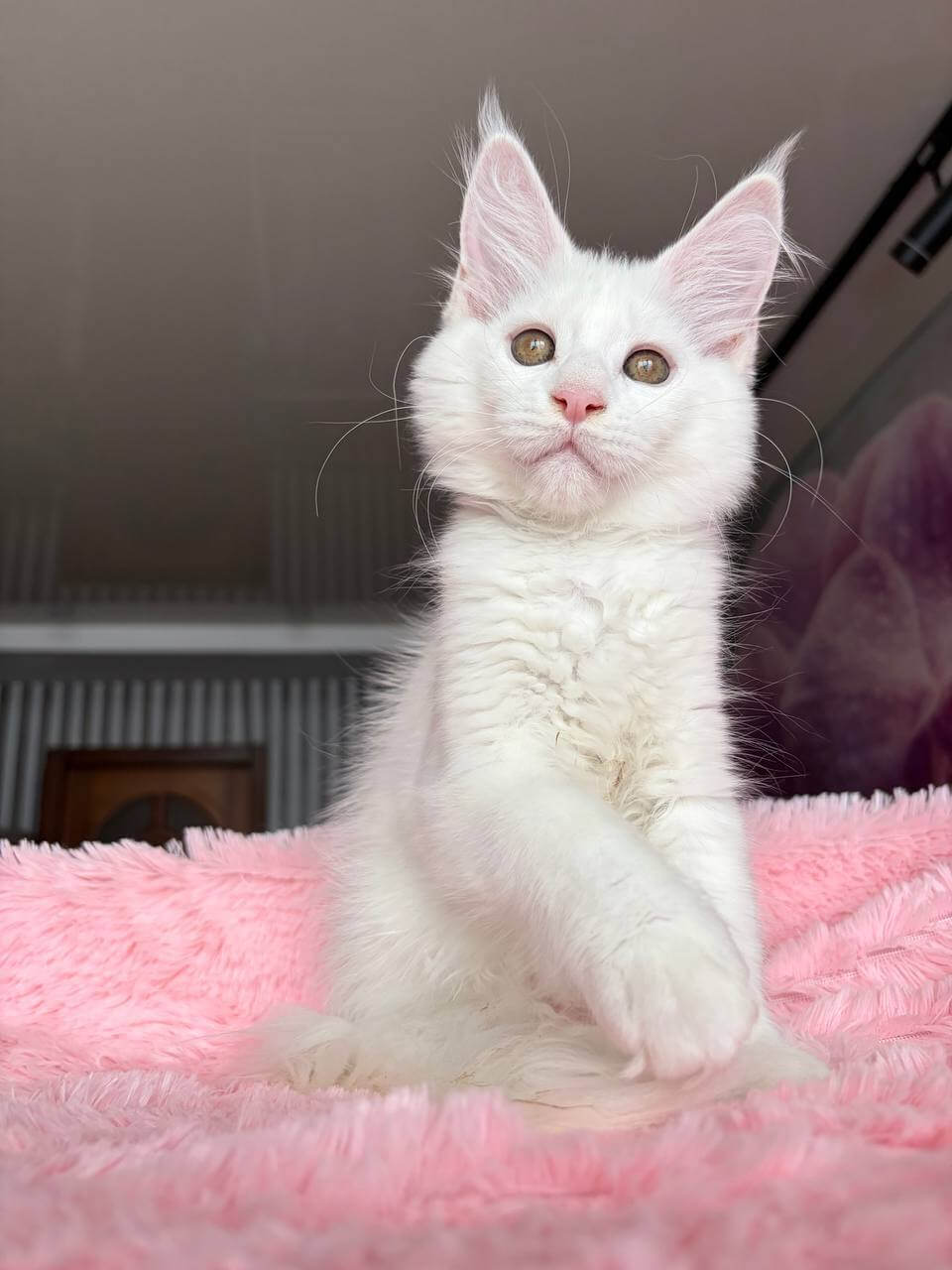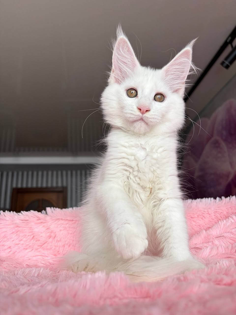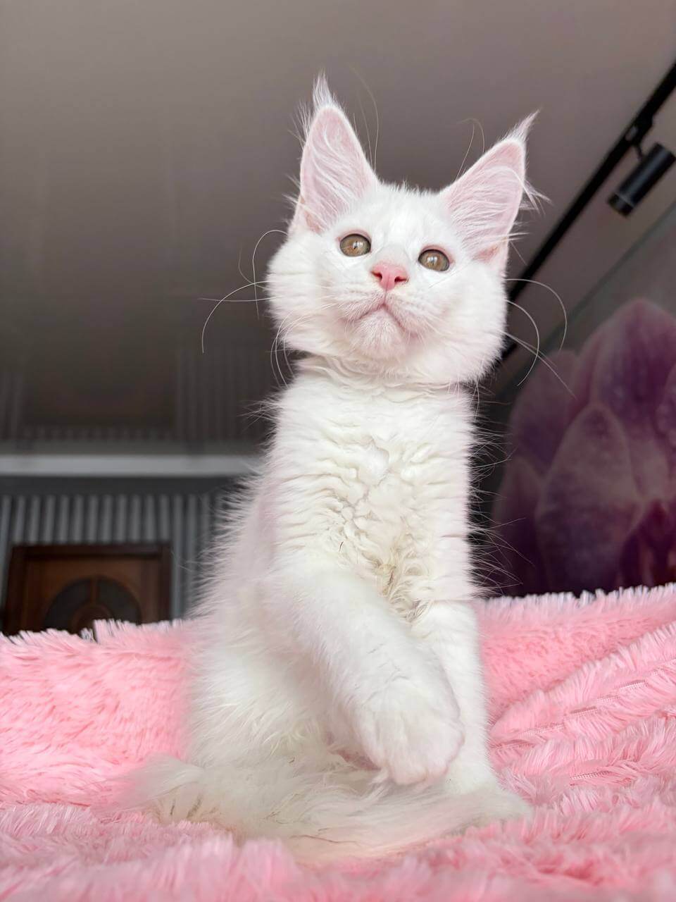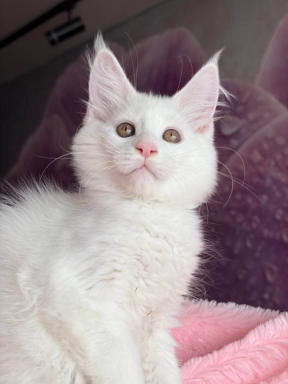 Let your senses linger on Undine, a White Maine Coon kitten whose coat feels as delicate as spun silk beneath your fingertips. Her snowy fur glows in the afternoon sun, accentuating her strikingly warm yellow eyes that seem to watch you with both wisdom and curiosity. When you cradle her, you truly sense her gentle presence.
