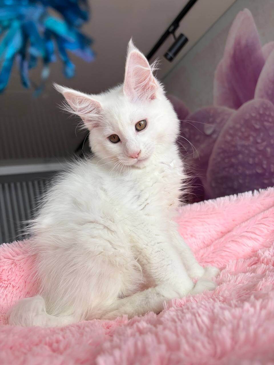 Undine’s personality sparkles with classic Maine Coon intelligence and quirky, affectionate charm. Each morning, she’ll pad softly to greet you, chirping softly and arching her plume-like tail in friendly invitation. At play, she tumbles with feather toys, yet she always circles back for a slow blink and a head press against your hand, making every interaction feel personal and special.