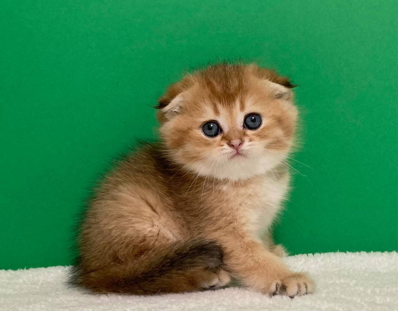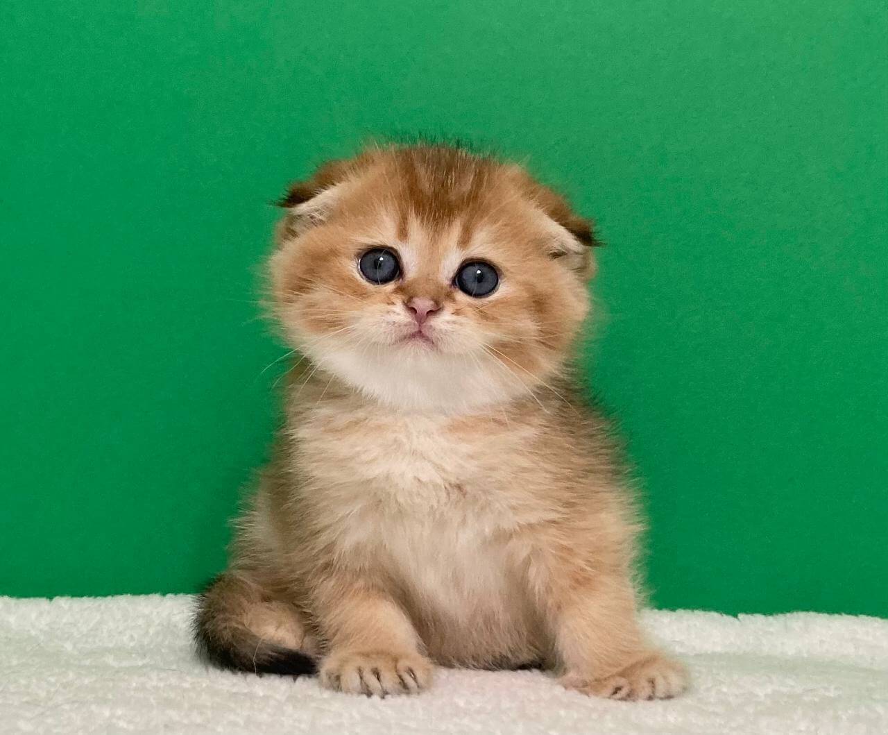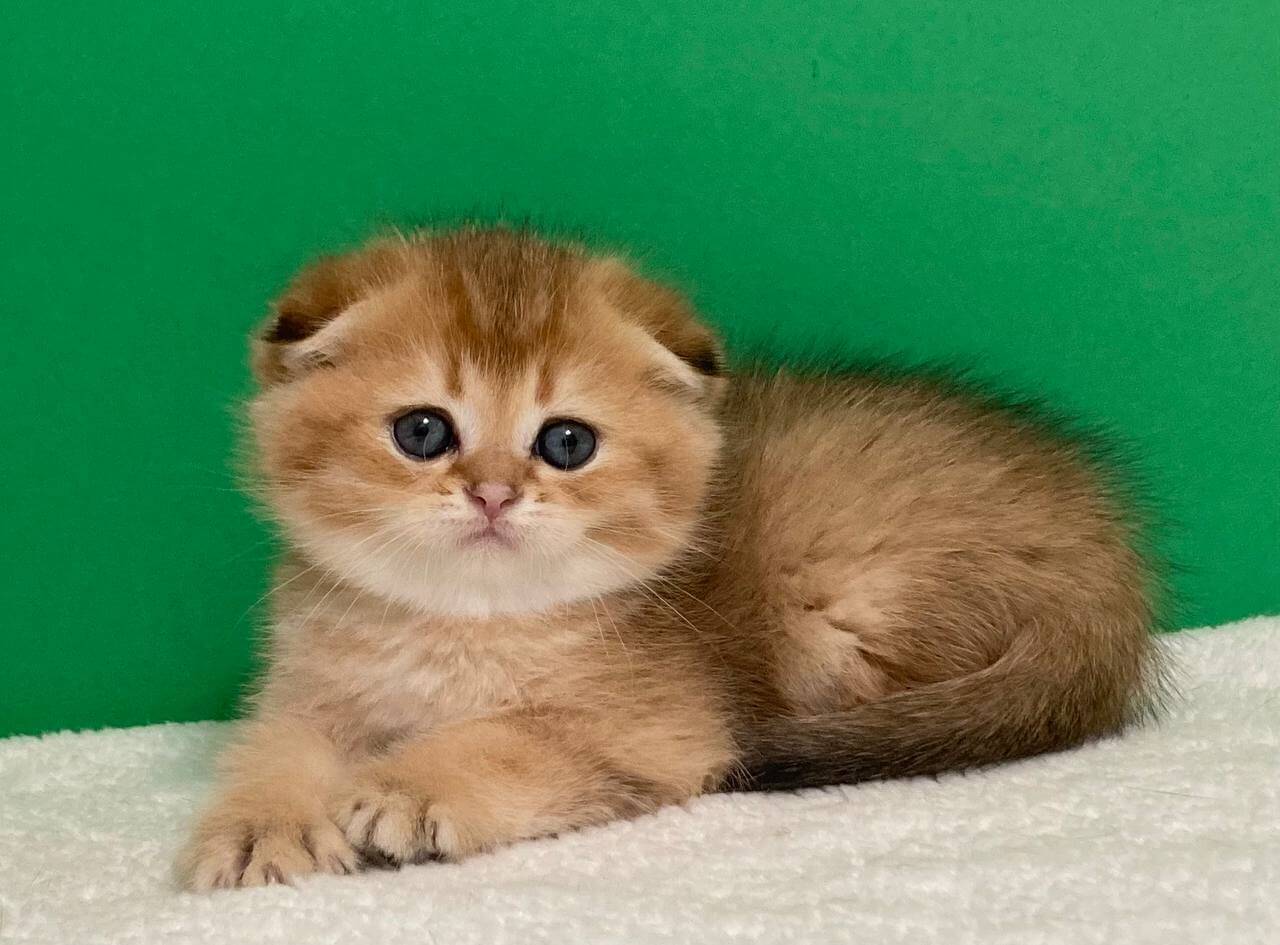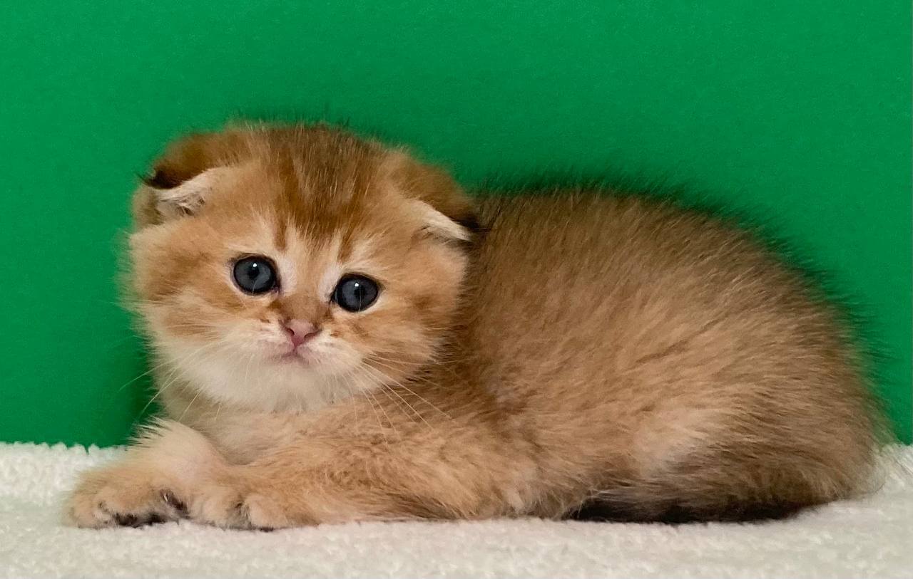 Meet Unikum – a rare Scottish Fold boy whose golden-black coat shimmers like the first rays of sunrise, and whose gentle green eyes invite you in for soft purrs and endless cuddles. One glance, and your heart will melt.
