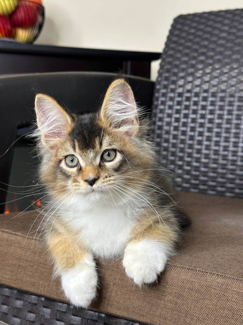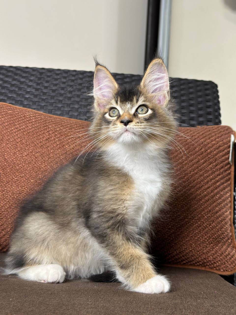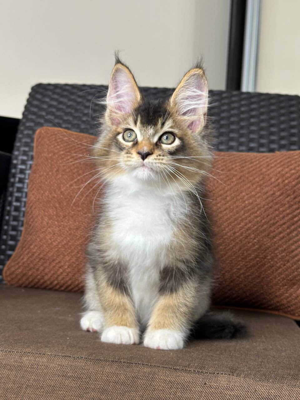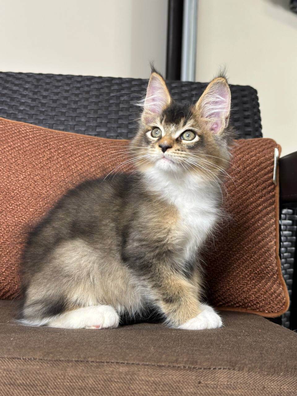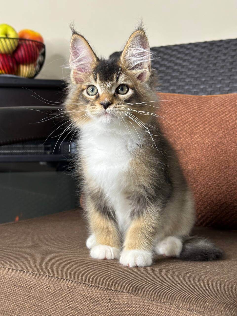 Meet Vassabi – a black tabby ticked Maine Coon boy with a whisper-soft white coat and enchanting yellow eyes that shine with gentle intelligence. The moment you rest your hand on his plush fur, you’ll feel his purring warmth and steadfast affection – he’s a true heart-melter waiting to be your loyal companion.