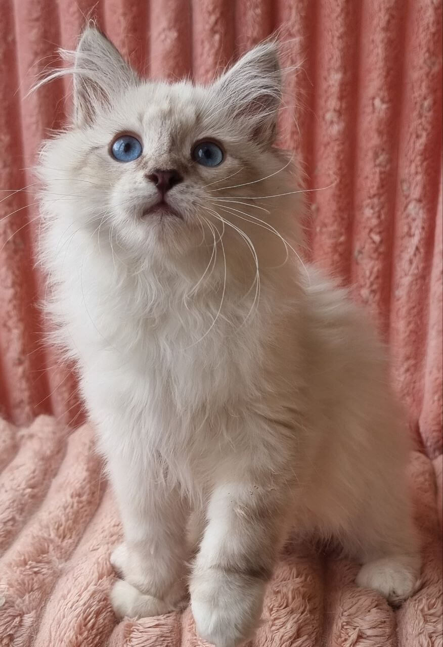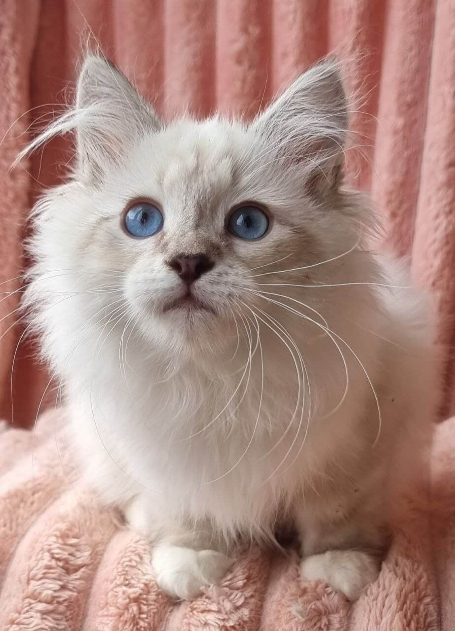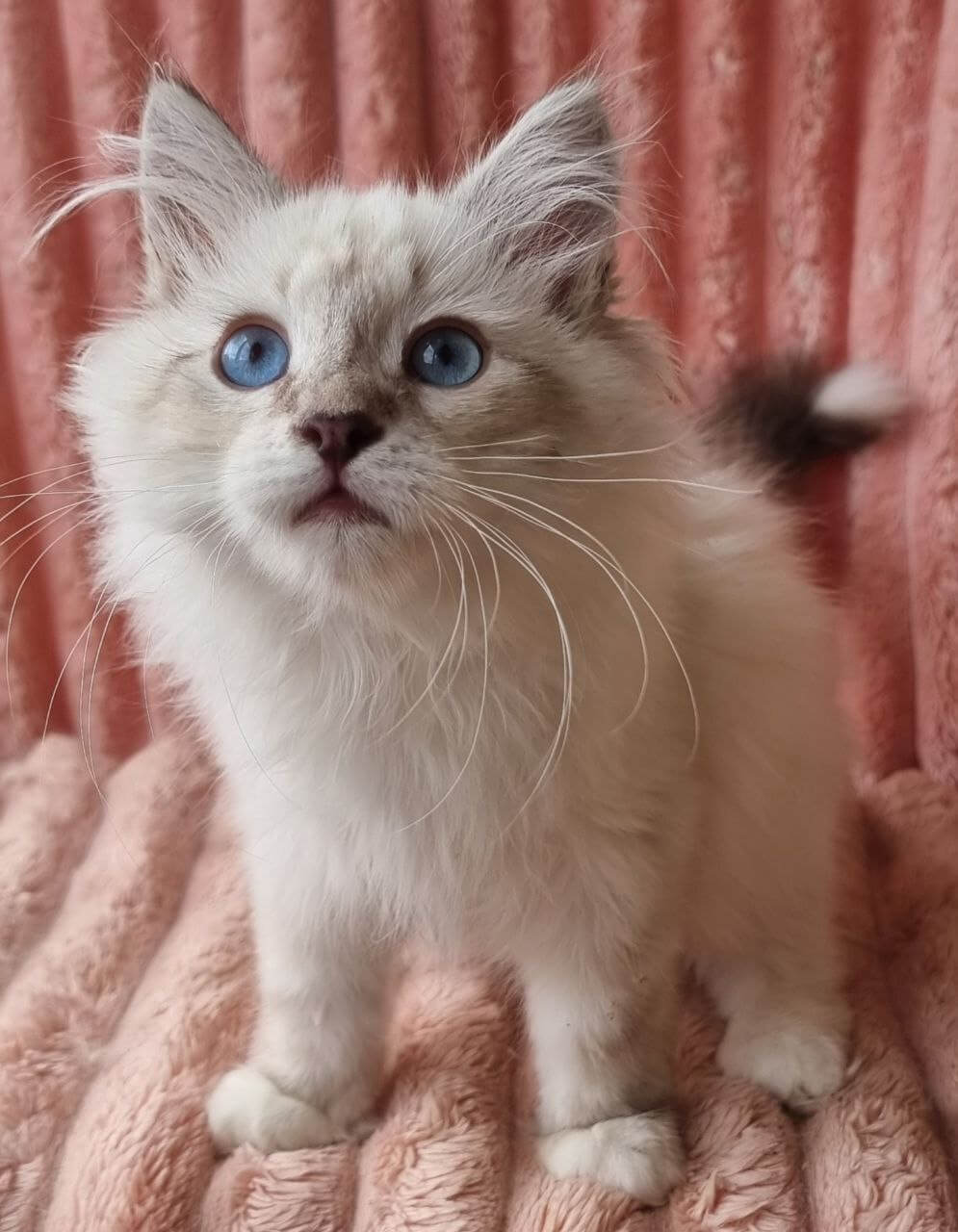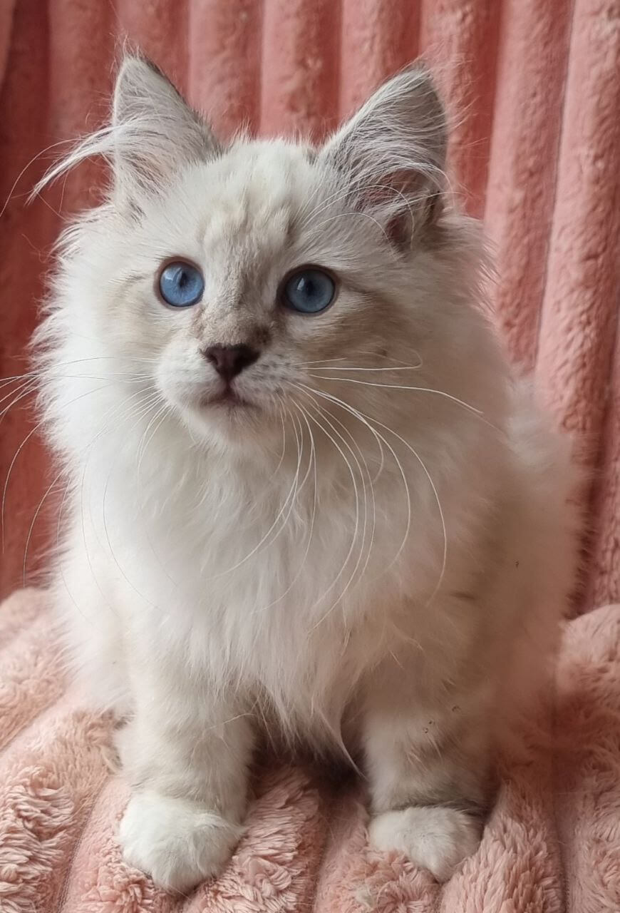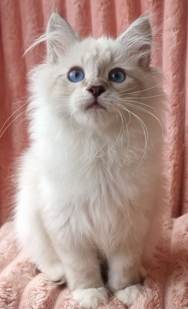 One look into Veselan’s crystal blue eyes, and you’ll feel the gentle warmth only a true companion can give. Cloaked in a plush blue lynx point coat brushed softly with white, this enchanting Siberian girl purrs with quiet affection and adores curling up beside you—her silken fur and radiating sweetness will touch your soul.