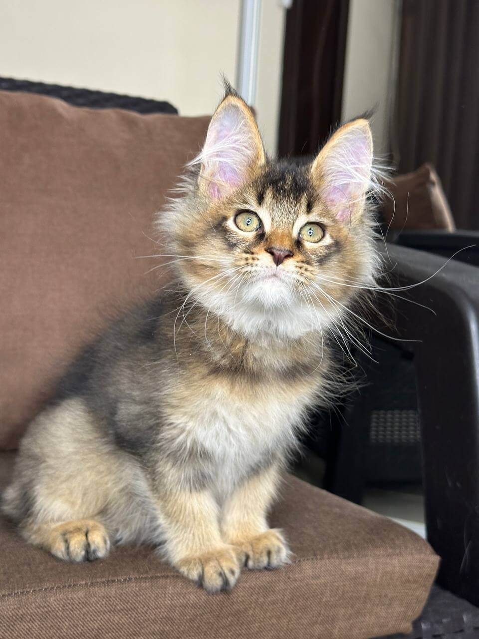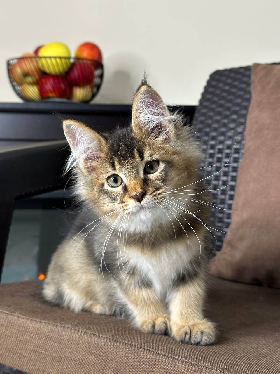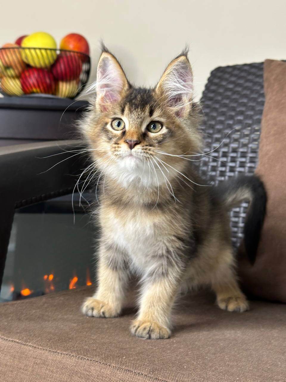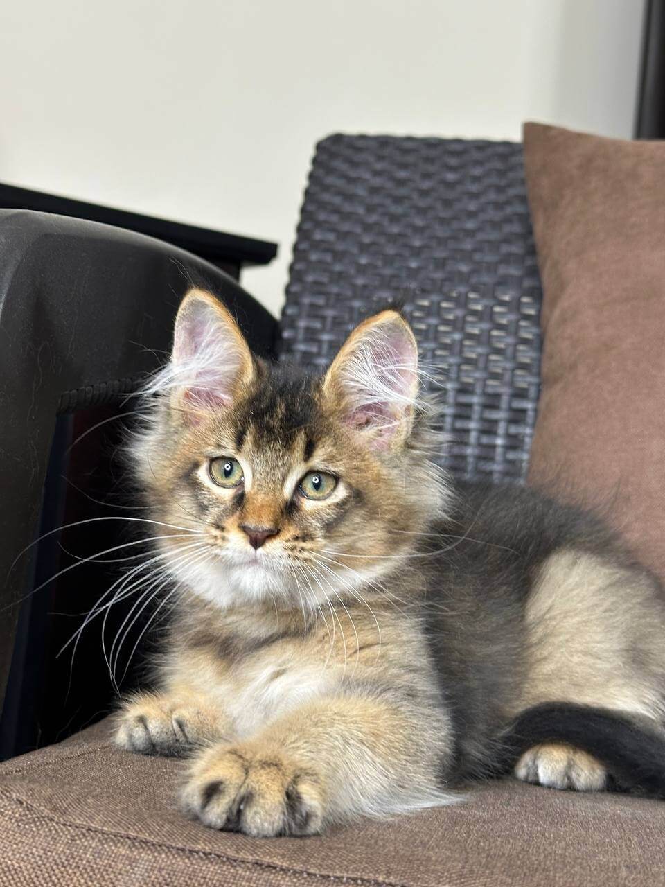 Meet Vorchut, a male Maine Coon kitten with a heart as warm as his plush, black tabby ticked fur and soulful yellow eyes. From the moment you touch his gentle paws or feel the soft rumble of his purrs against your palm, you’ll know he’s meant to be cherished.