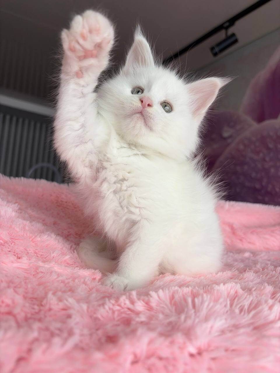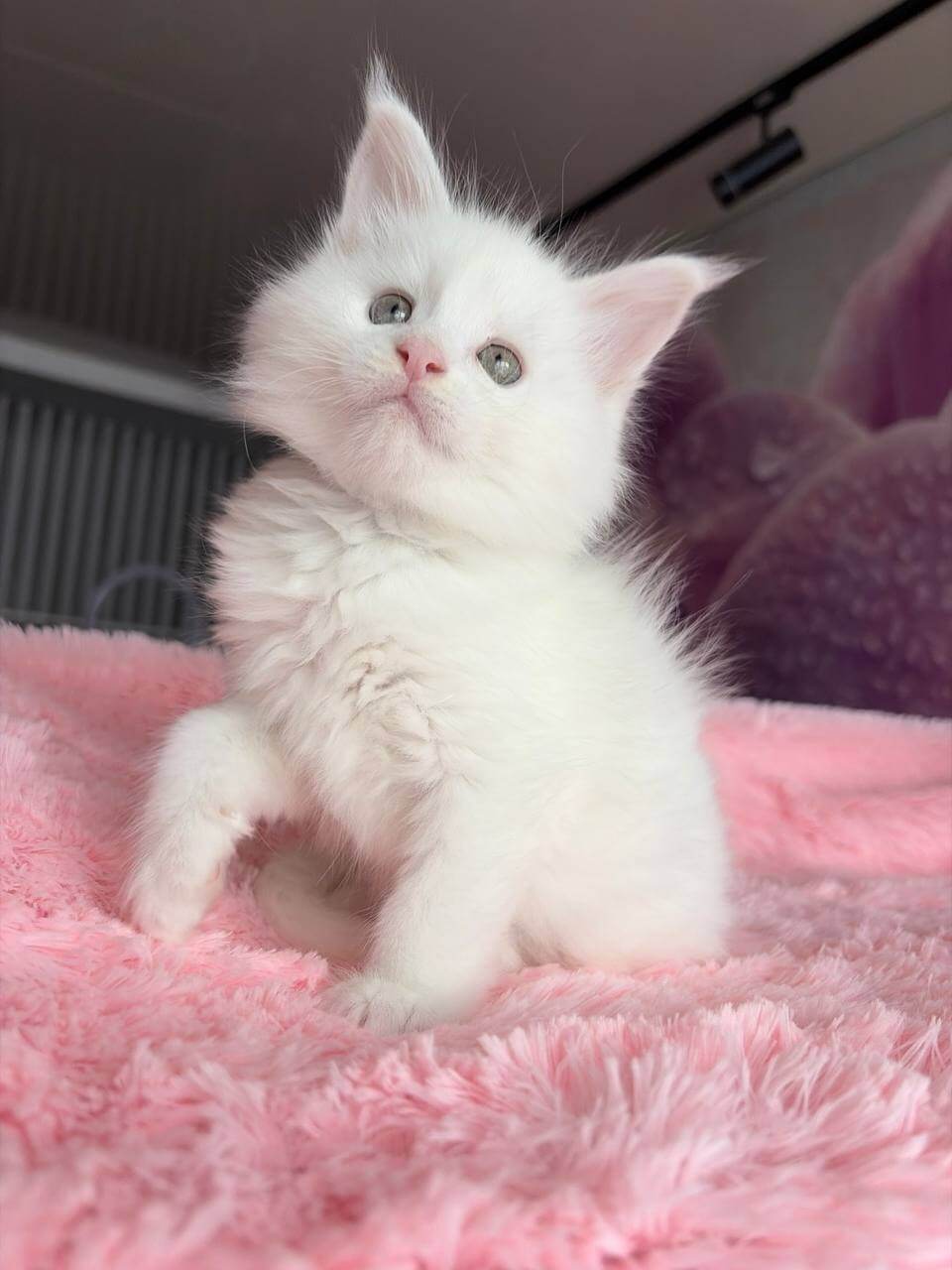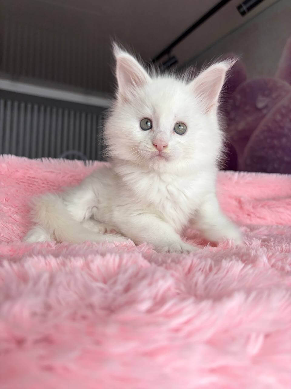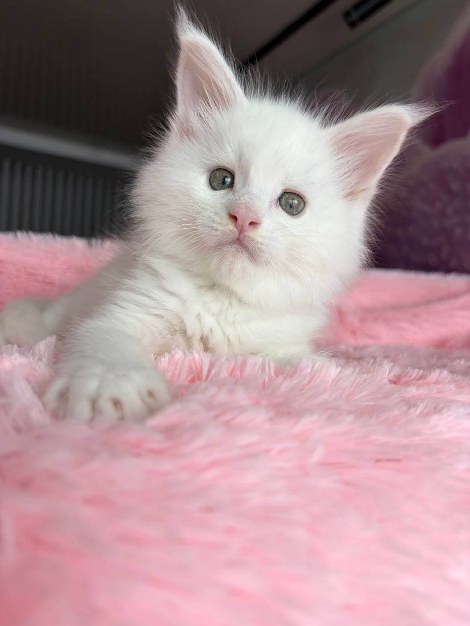 At first glance, White—the exquisite White Maine Coon kitten—draws you in with his purest snow-white fur, irresistibly long and silky under your fingertips. The moment your eyes meet his striking yellow gaze, you feel the intelligent curiosity and confident presence unique to this rare Maine Coon companion. Holding him, you sense both elegance and gentle strength.