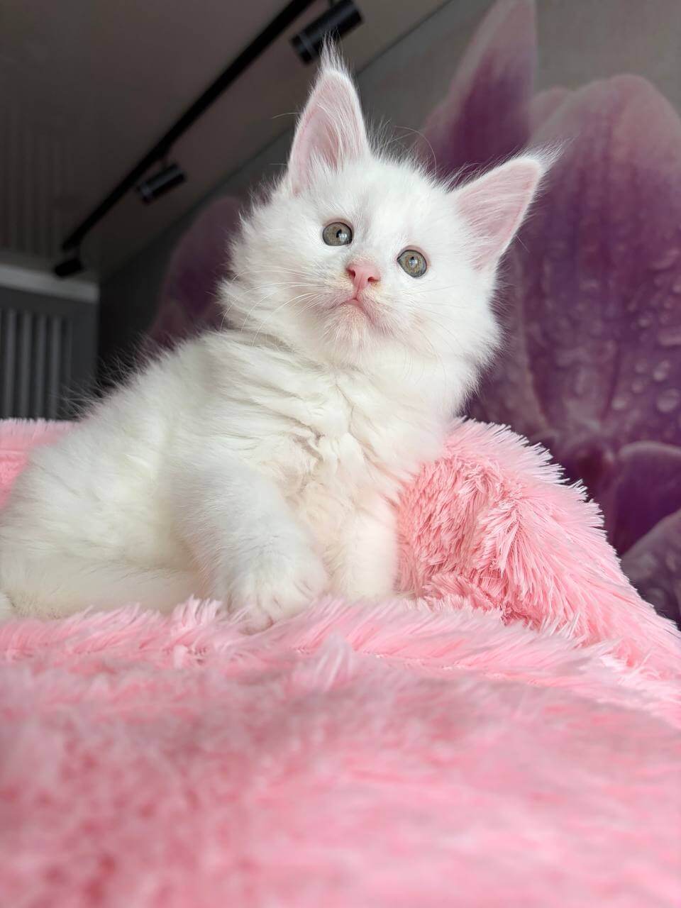 When you hold Winter, our pristine white Maine Coon kitten, his silky coat flows through your fingers like the softest snow, cool yet inviting. His eyes are a striking shade of yellow, glowing with golden warmth and intelligence against his snowy fur. In your arms, Winter feels substantial and gentle, settling in with an irresistibly plush presence.