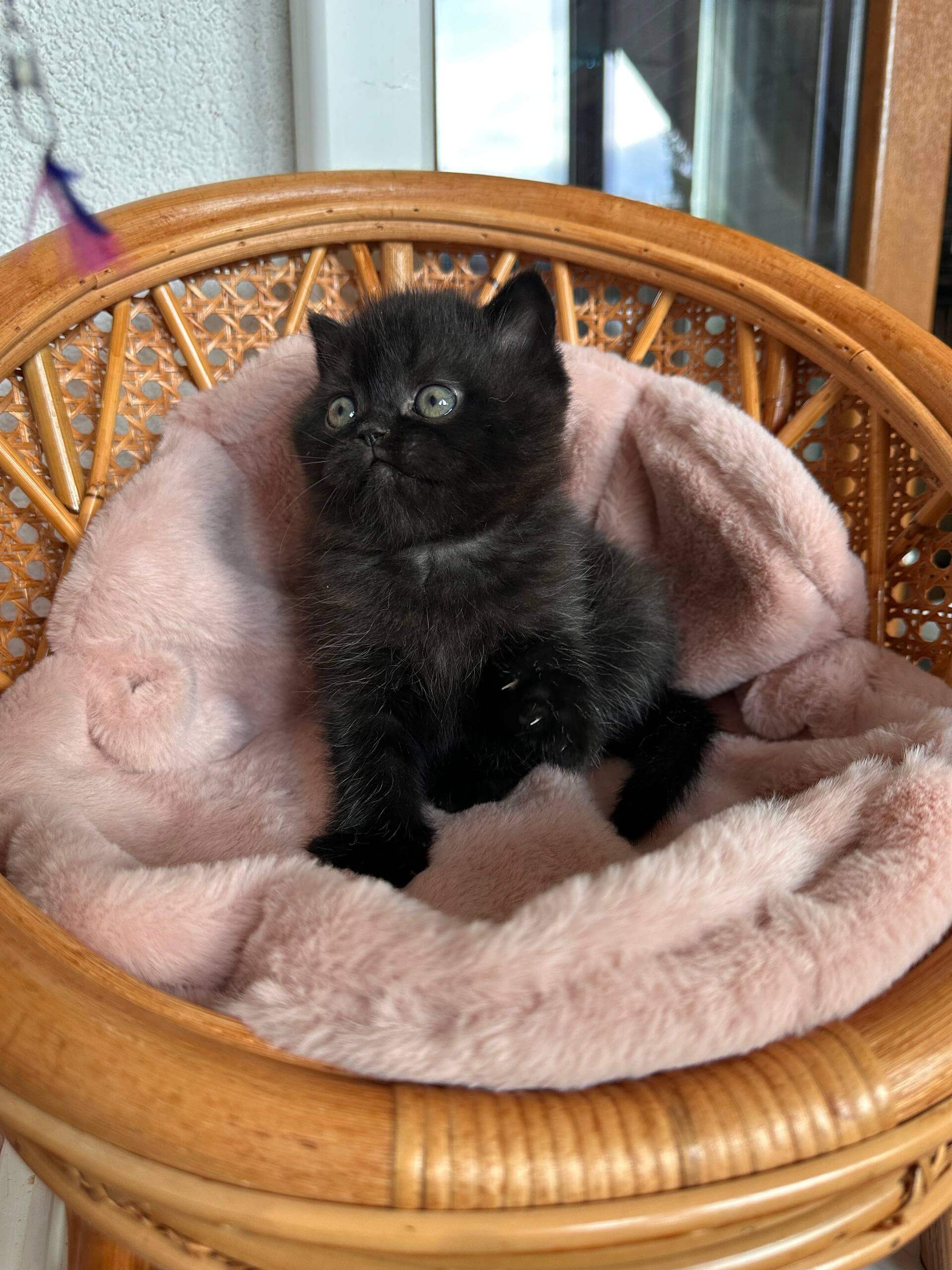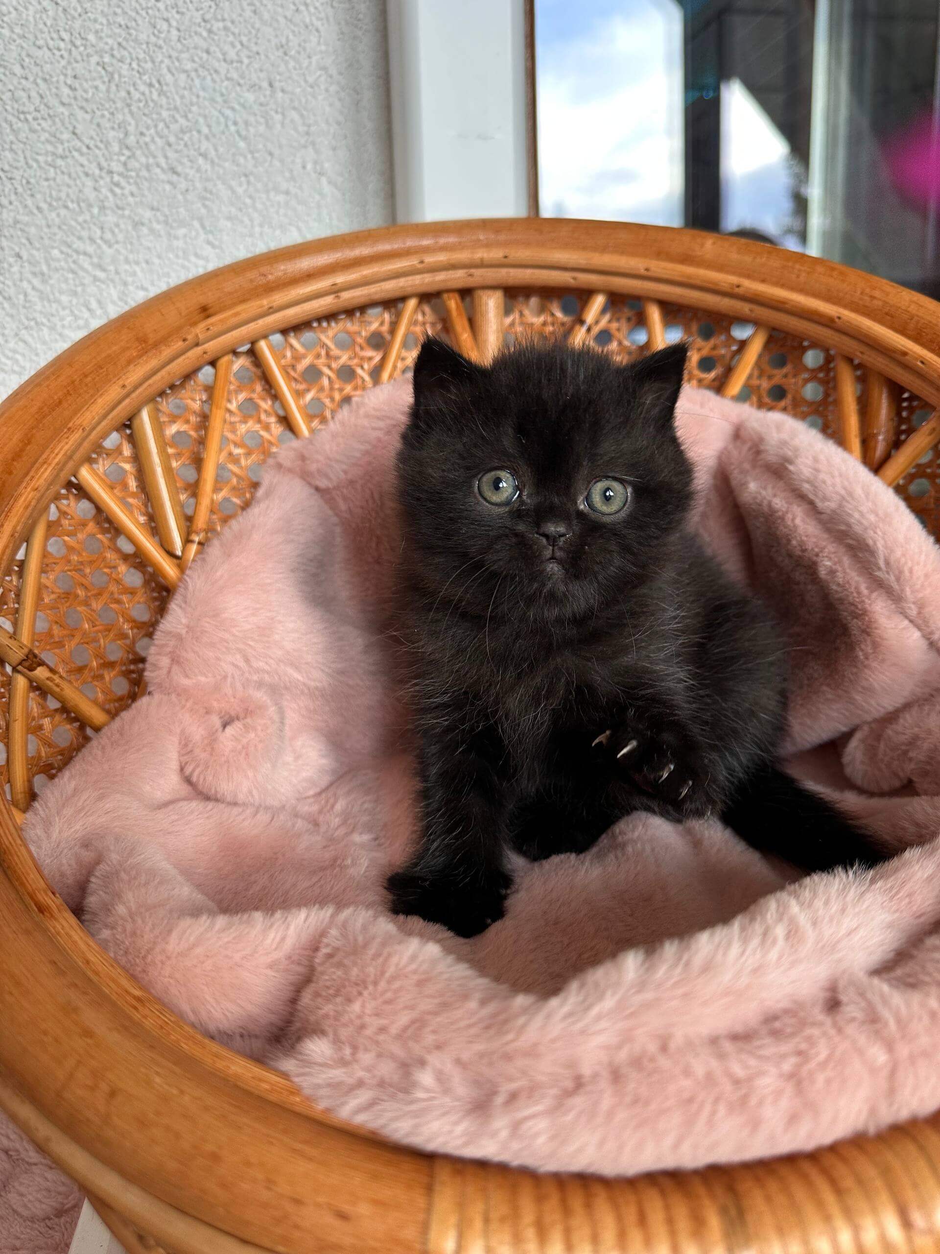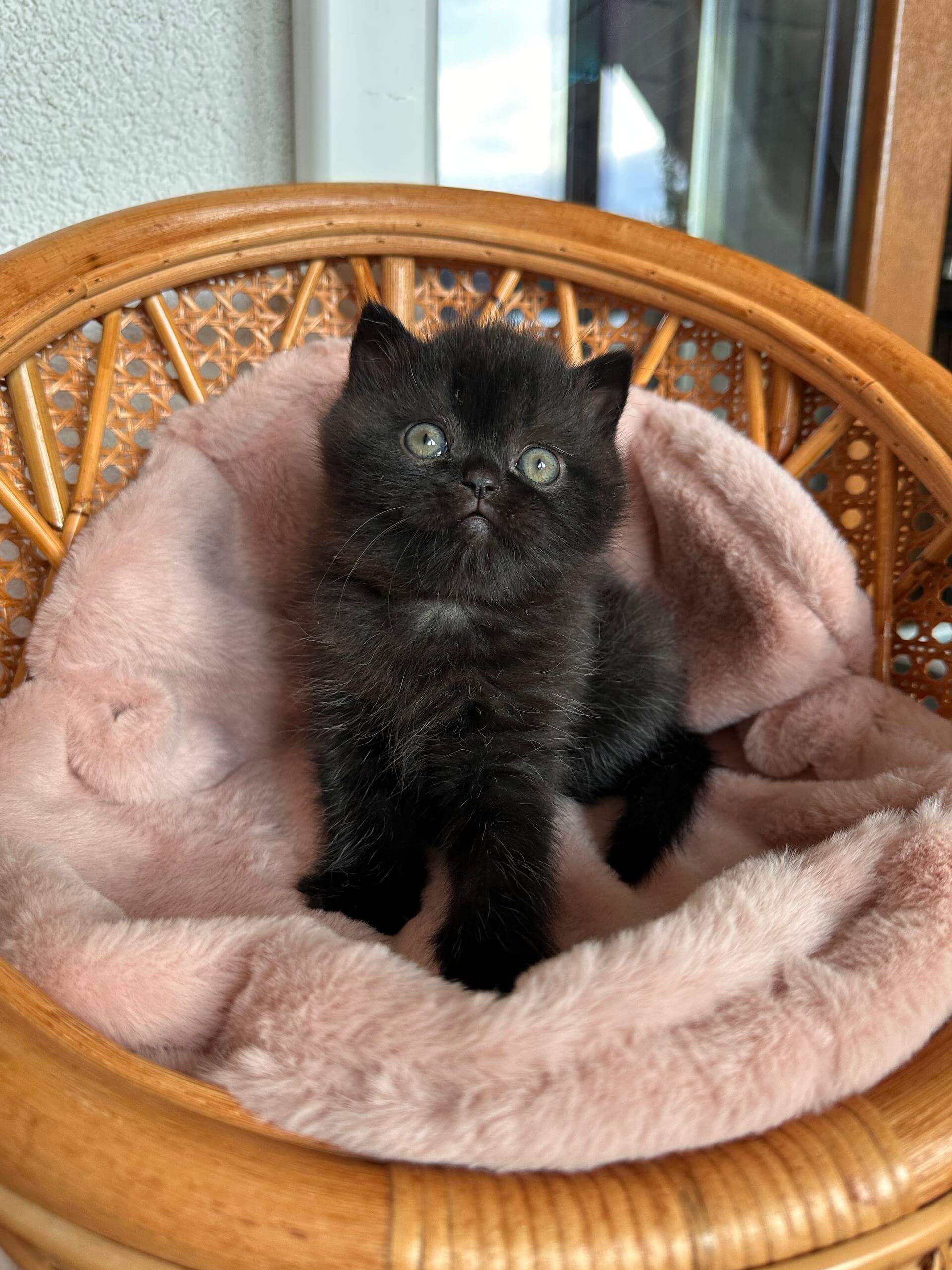 The softest touch of midnight fur and mesmerizing yellow eyes—this darling Scottish Straight male instantly captures your heart. Imagine gentle purrs, soft nuzzles, and a warm body curled peacefully by your side each day.
