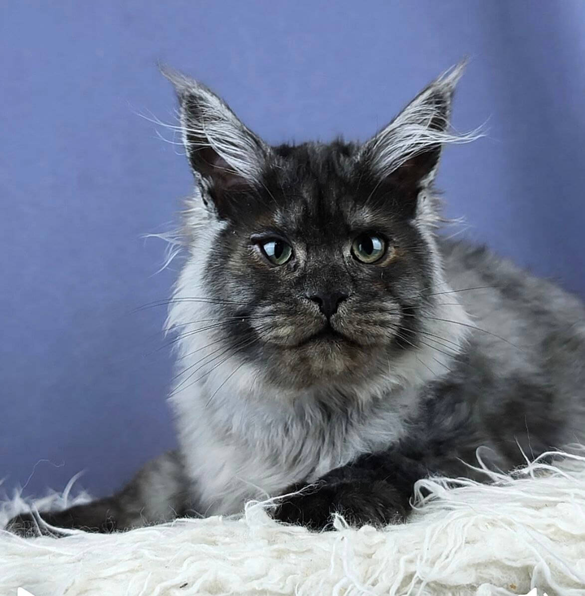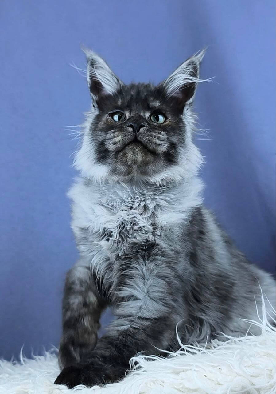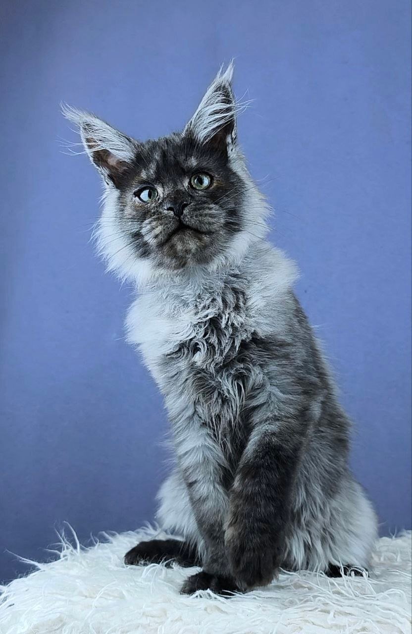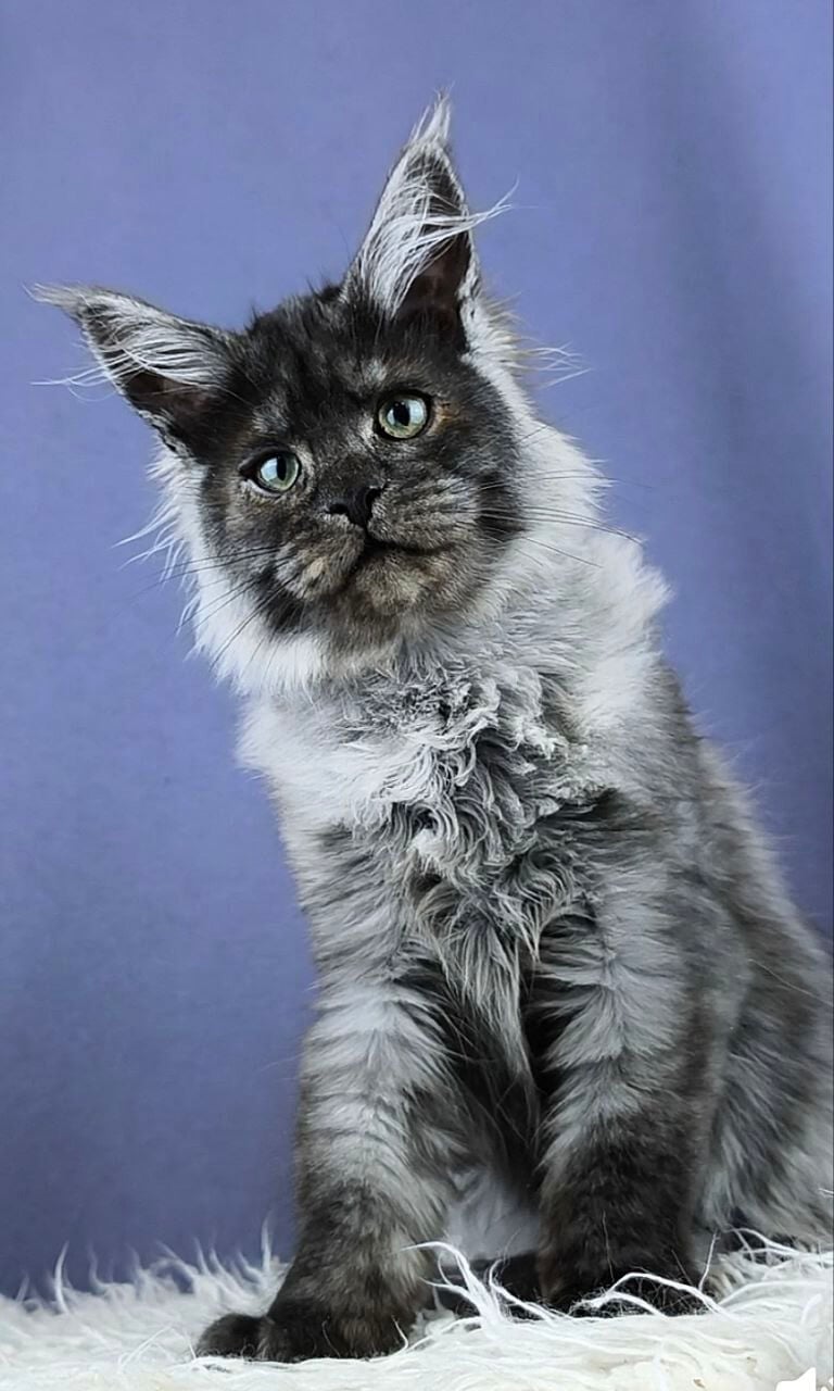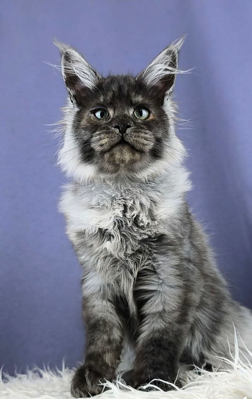 Meet Woron, a mesmerizing Black Silver Maine Coon kitten whose lustrous fur feels like silk between your fingers. His dramatic black-silver coat gleams underneath even soft morning light, framing a broad face with vivid, yellow eyes—each glance radiates warmth and a curious depth. When held, you’ll feel a gentle, comforting weight against your chest, and his contented purrs seem to vibrate straight into your heart.