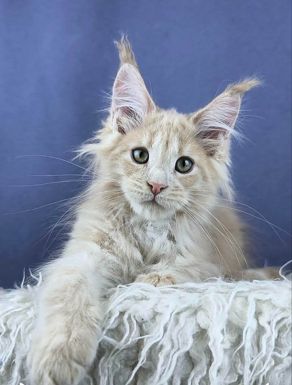 Run your fingers through Yagdash’s luxurious Cream Silver Tabby Ticked Maine Coon kitten coat and you’ll feel the softest waves of fur, cool and silky yet substantial beneath your hand. His yellow eyes glow with a golden warmth, following your every move, promising connection. This gentle giant’s quiet weight settles against you, offering comfort and confidence.