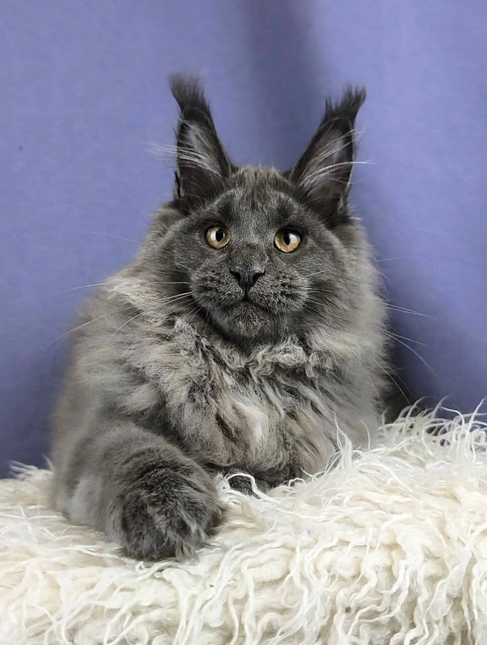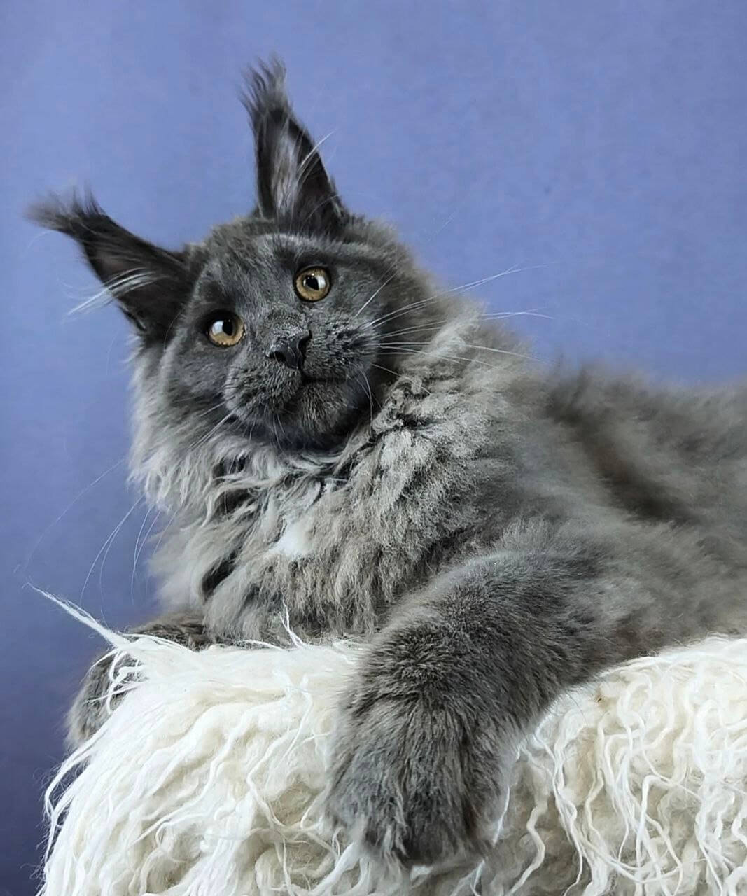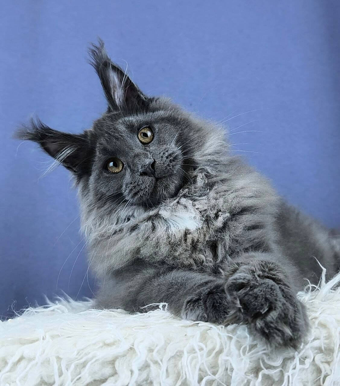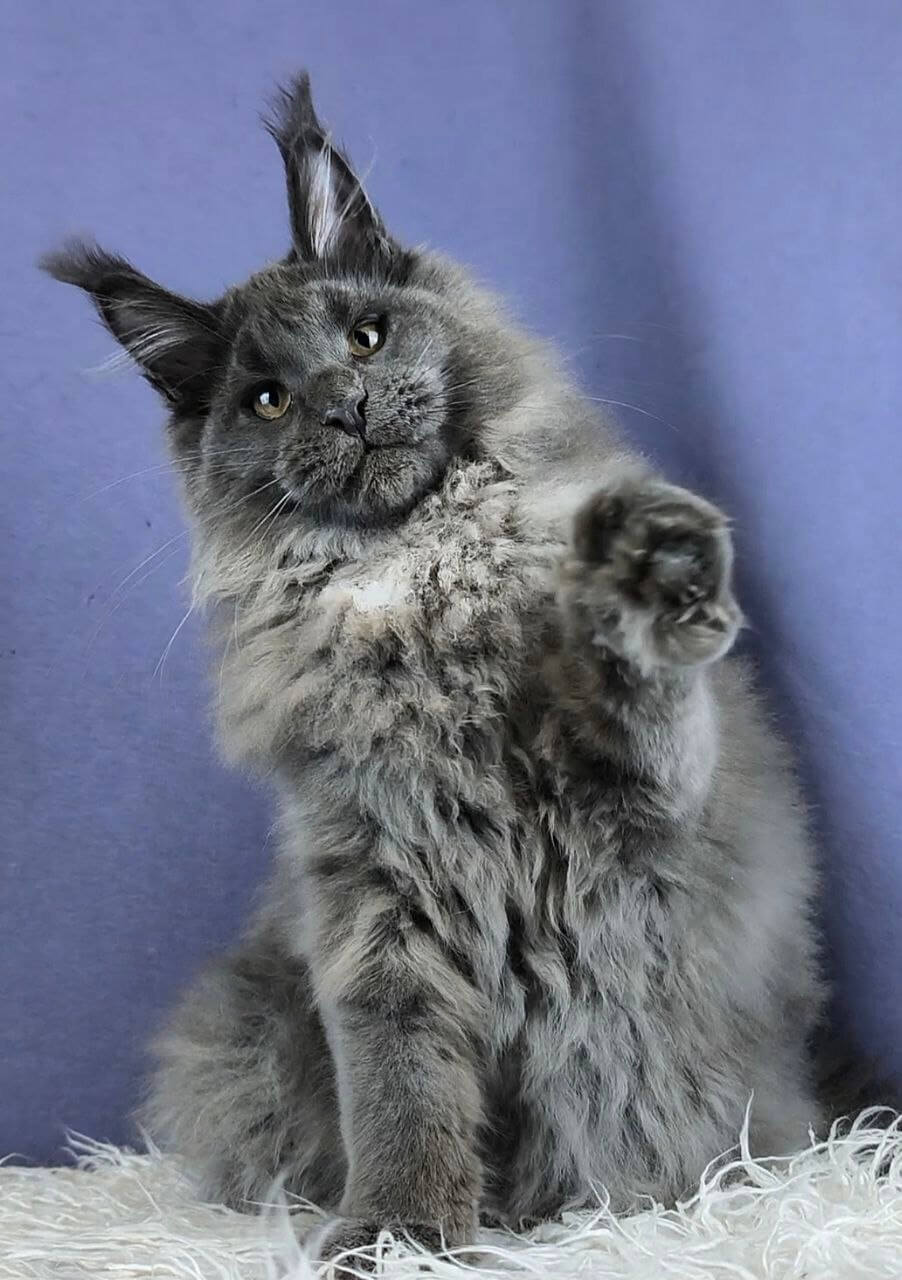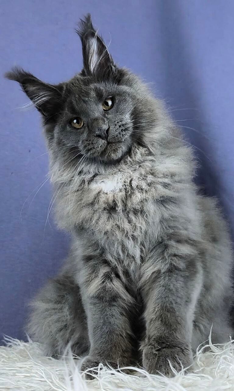 Yakut’s blue with white Maine Coon kitten fur feels like a cloud beneath your fingertips, with streaks of downy white rippling through cool slate blue. When you meet his steady yellow gaze, you’ll notice the curious gleam—soft but vivid—that makes him impossible to ignore. There’s solid Maine Coon heft to his presence, both sturdy and luxuriously plush in your arms.