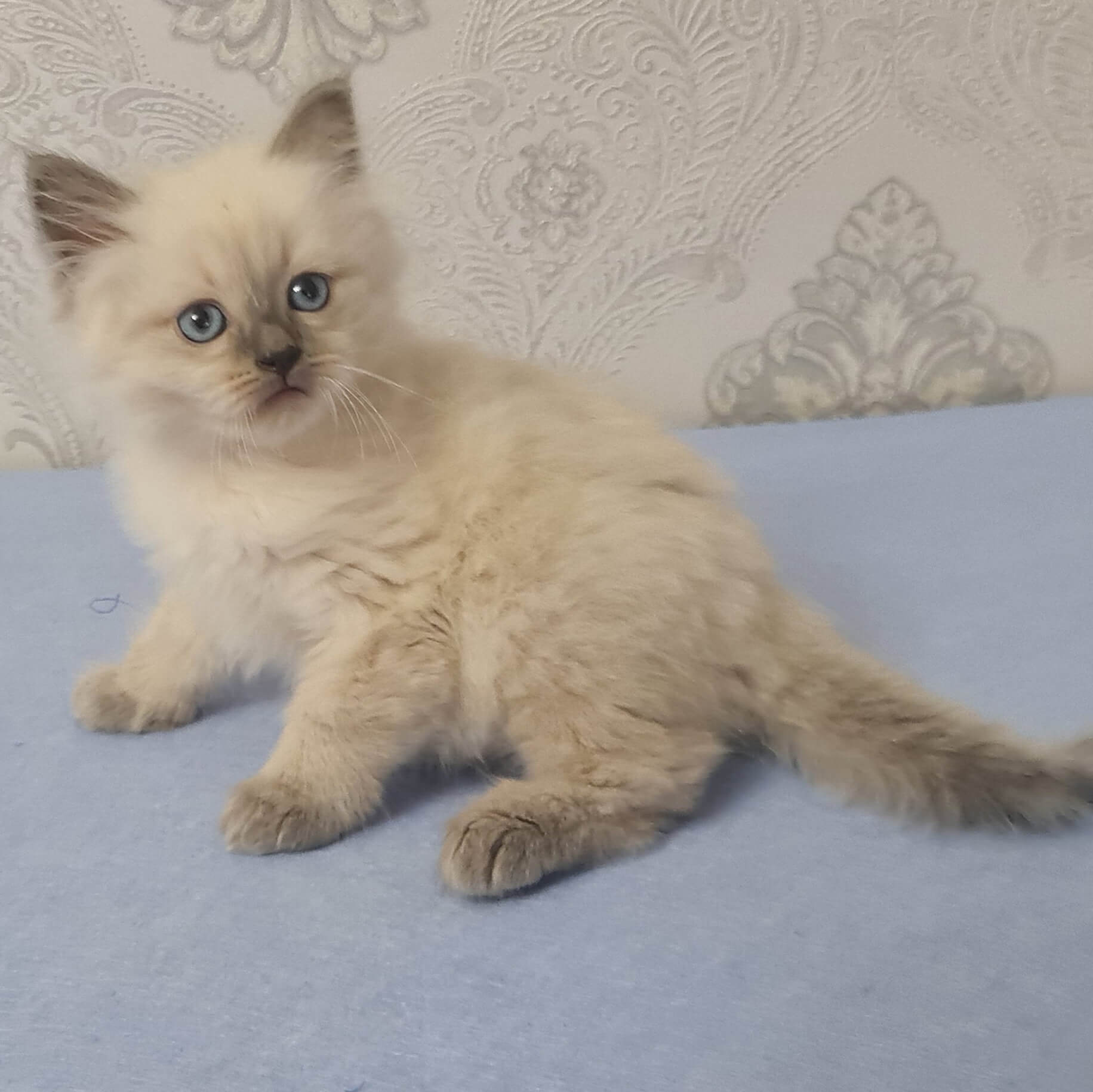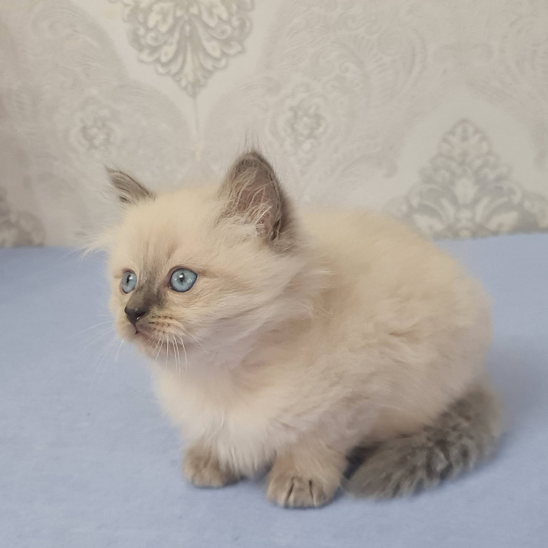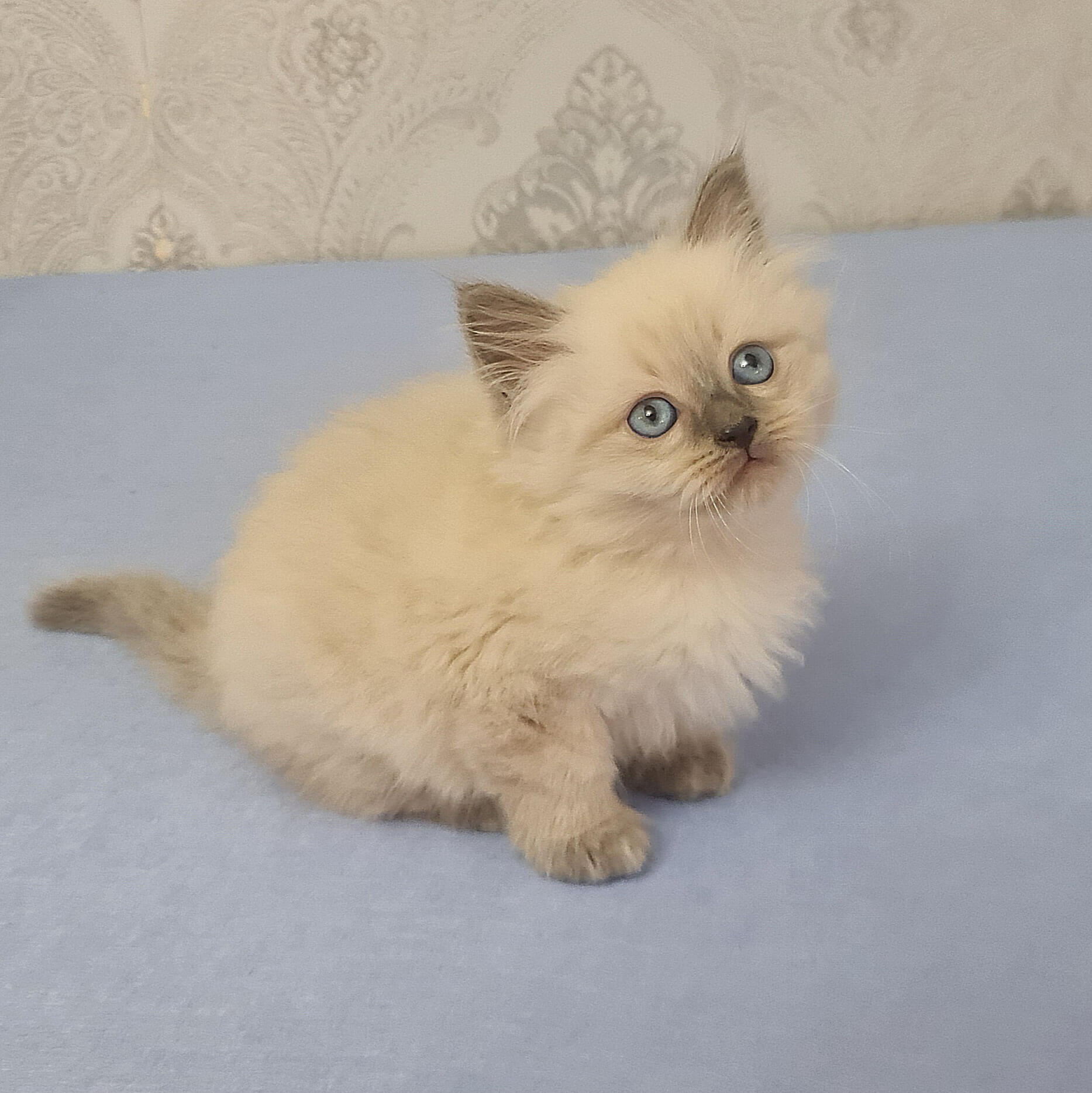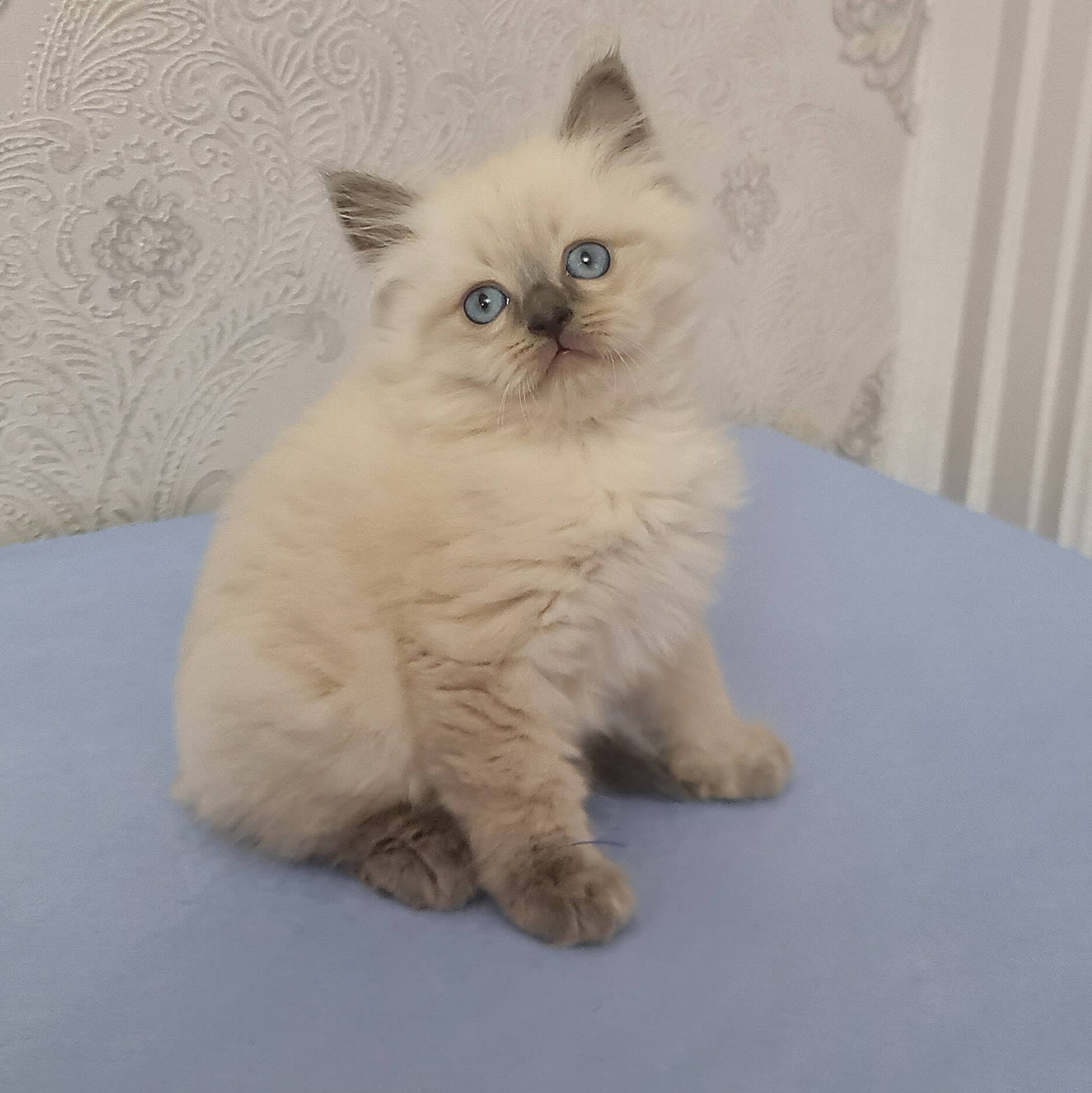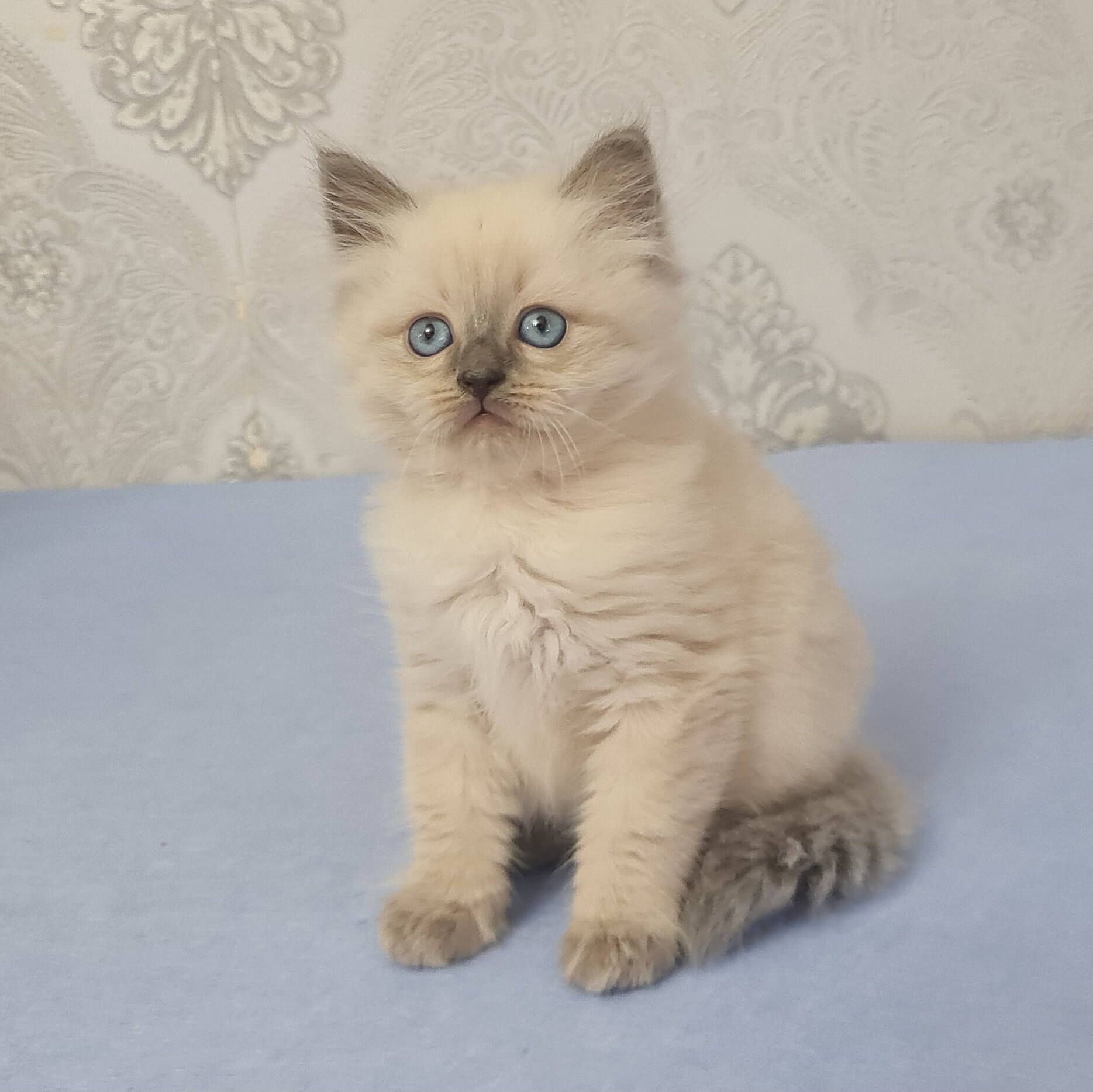 Meet Yaroslav, a Siberian kitten whose enchanting blue point coat shimmers under gentle light and whose crystalline blue eyes reflect pure wonder. From the first soft purr at your side, he weaves instant warmth into your heart—imagine the velvet touch of his fur as you cradle him, feeling his calm heartbeat in your palm.