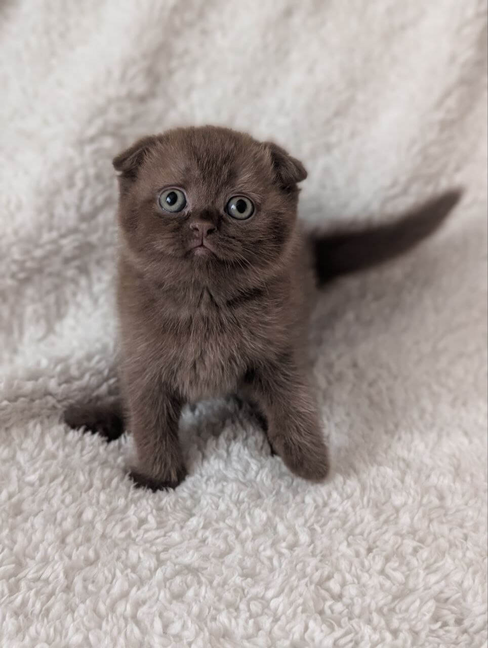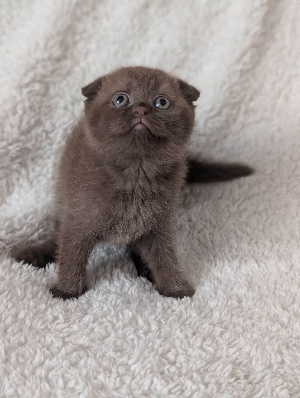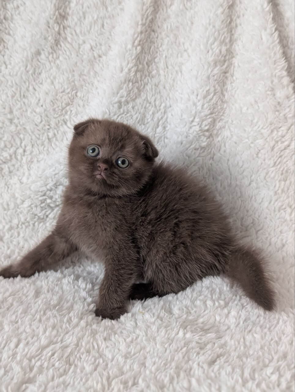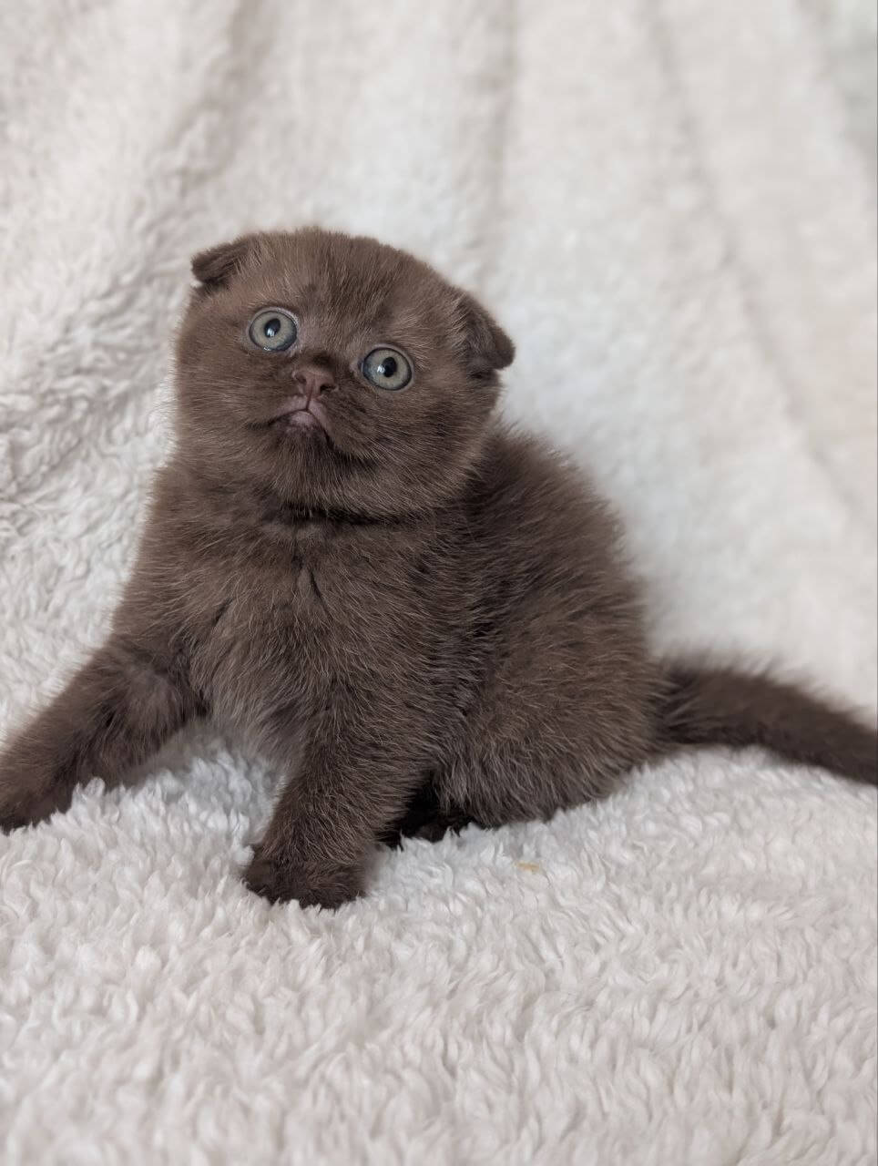 Yasmine is a Chocolate Scottish Fold kitten whose satiny coat draws you to run your fingertips down her silky back, while her luminous yellow eyes glow with a gentle, intelligent warmth. The signature round face and folded ears rest above a plush, compact body that nestles contentedly against your chest, purring with undeniable serenity.