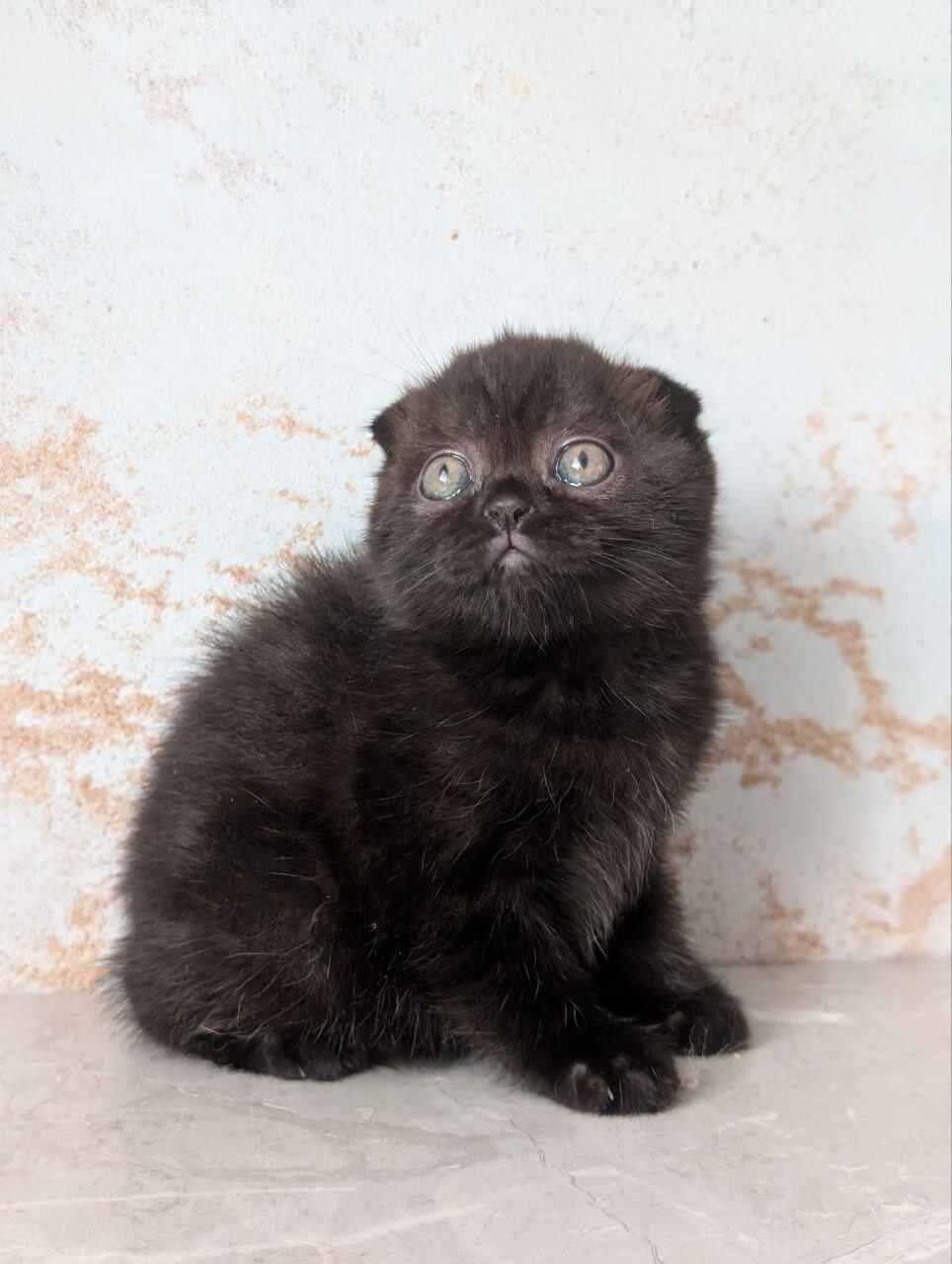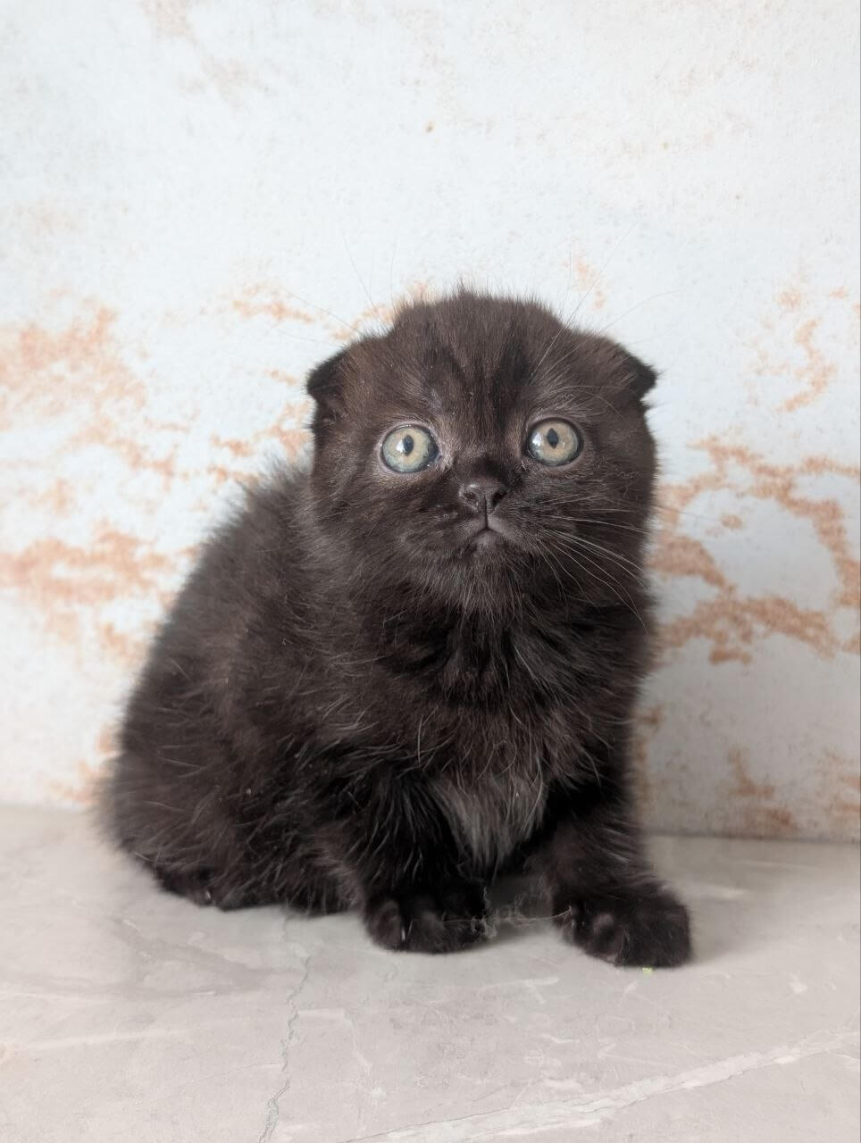 YUNA is a Black Scottish Fold kitten whose charcoal velvet coat feels like the softest night breeze against your skin. Her bright yellow eyes glow with the inviting warmth of candlelight, shining from her gentle, rounded face. Holding YUNA, you’ll notice her signature folded ears and the quiet steadiness of her delicate frame curled in your lap.