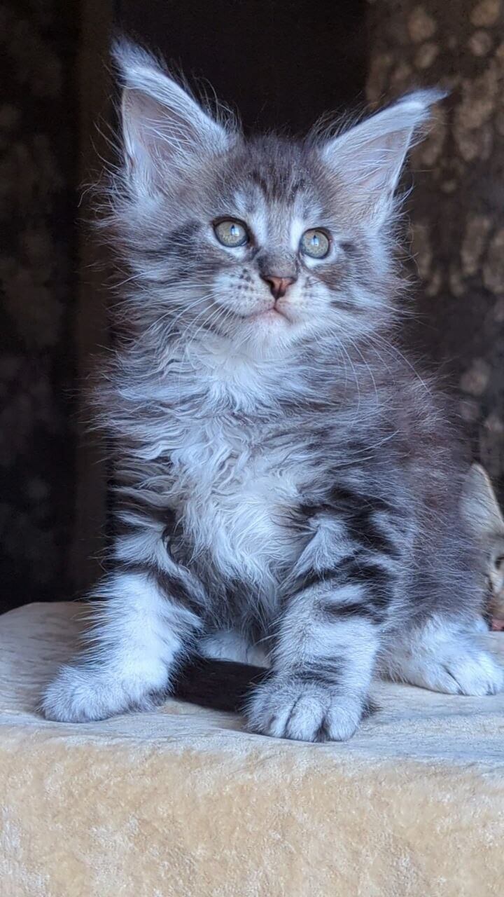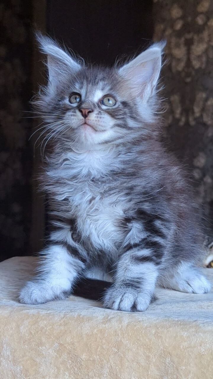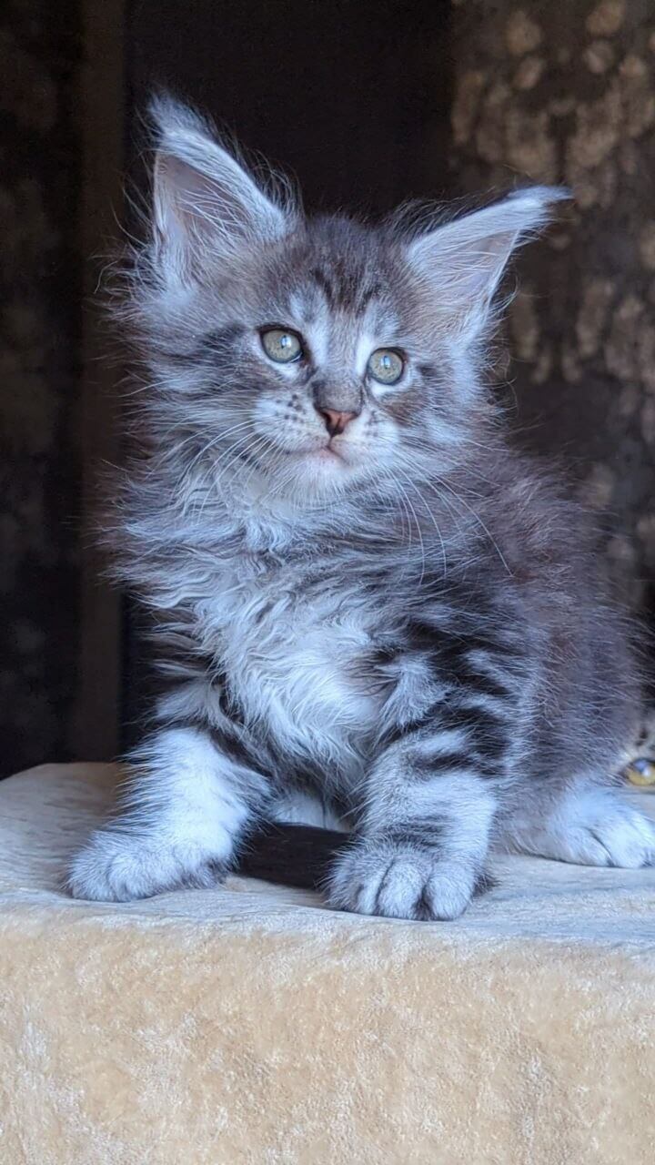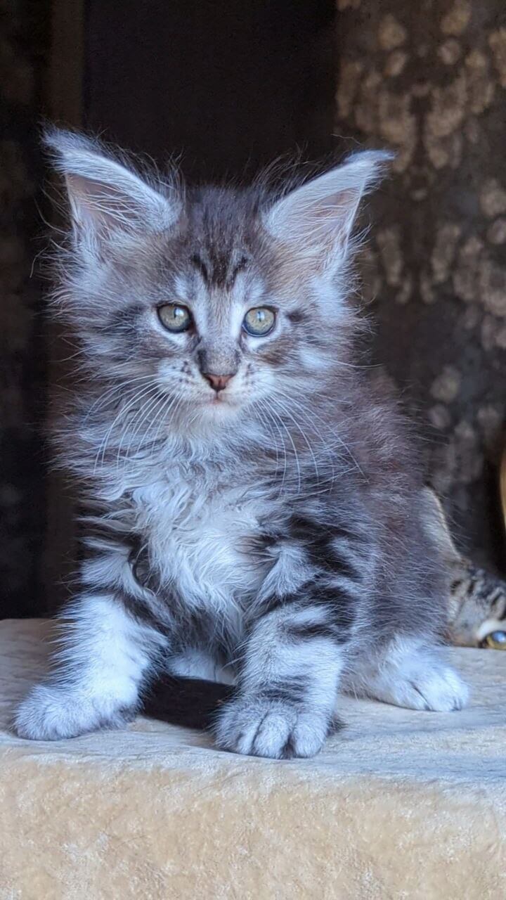 Meet Zeitun, a breathtaking black silver tabby Maine Coon boy whose gentle spirit and dazzling yellow eyes will capture your heart from the very first moment. With his plush, silken coat and long, elegant whiskers, Zeitun brings a touch of wild beauty to every cuddle, while his loving purr wraps you in warmth like a soft blanket.