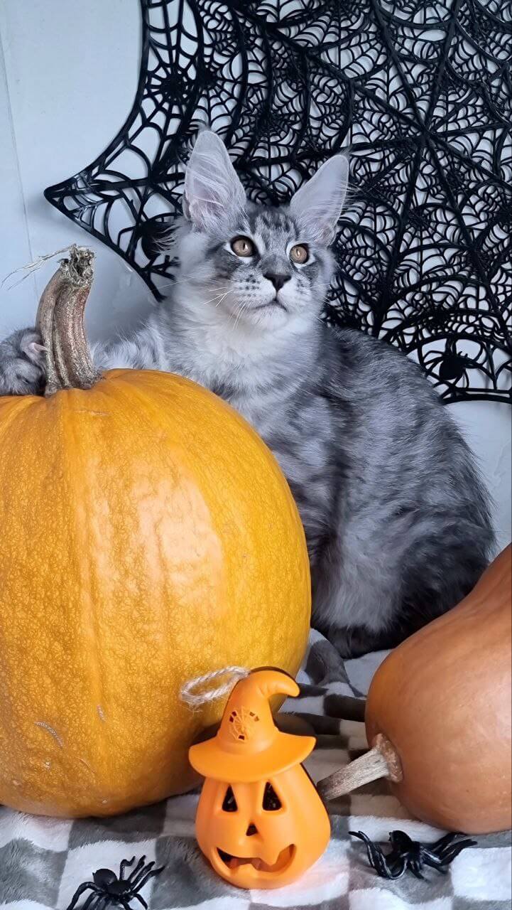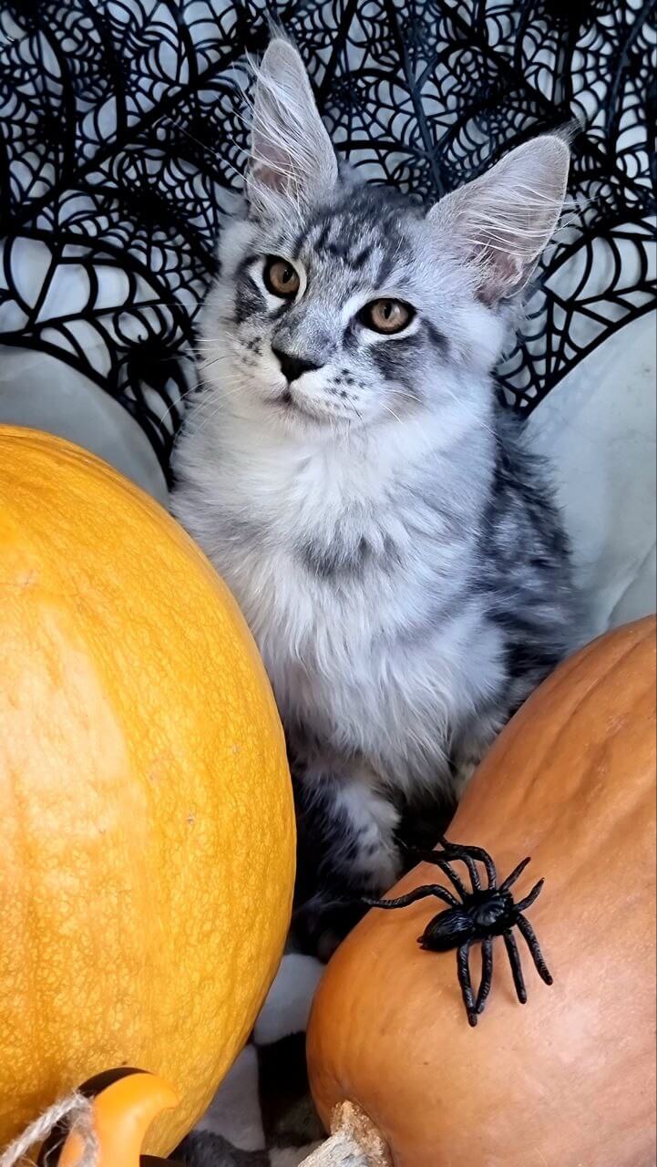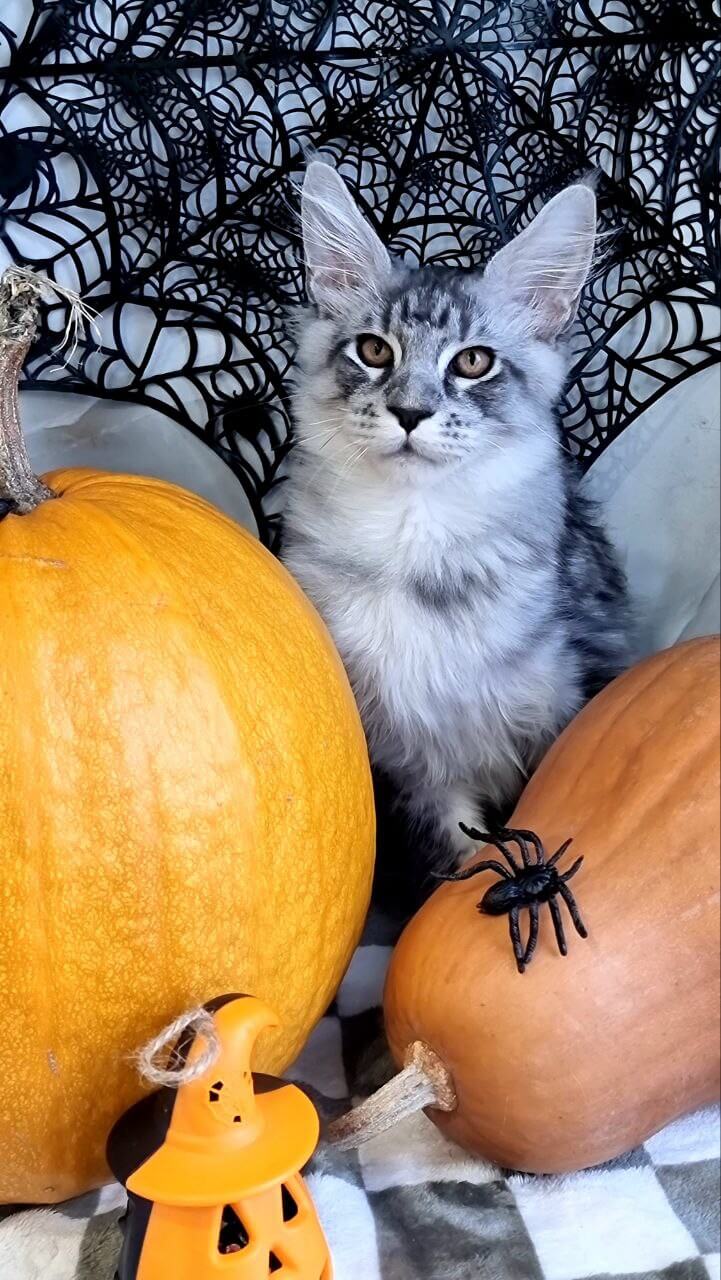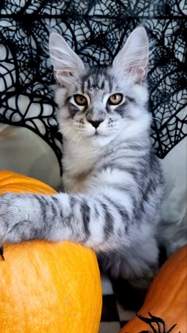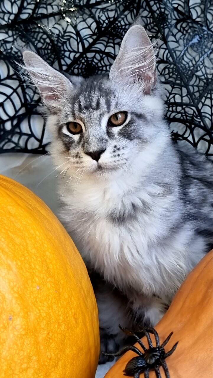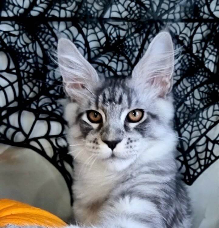 From the first moment Zelan looks up at you with his luminous yellow eyes, you’ll feel an instant connection—a soft, magnetic pull to this majestic Maine Coon boy. His stunning black silver tabby-spotted coat is touched with silvery moonlight, making every cuddle and gentle stroke pure magic.