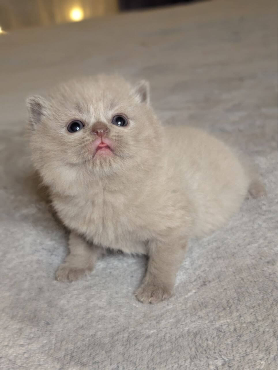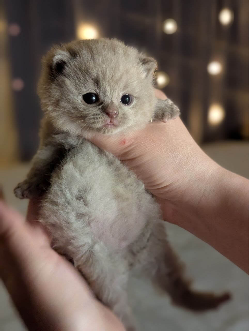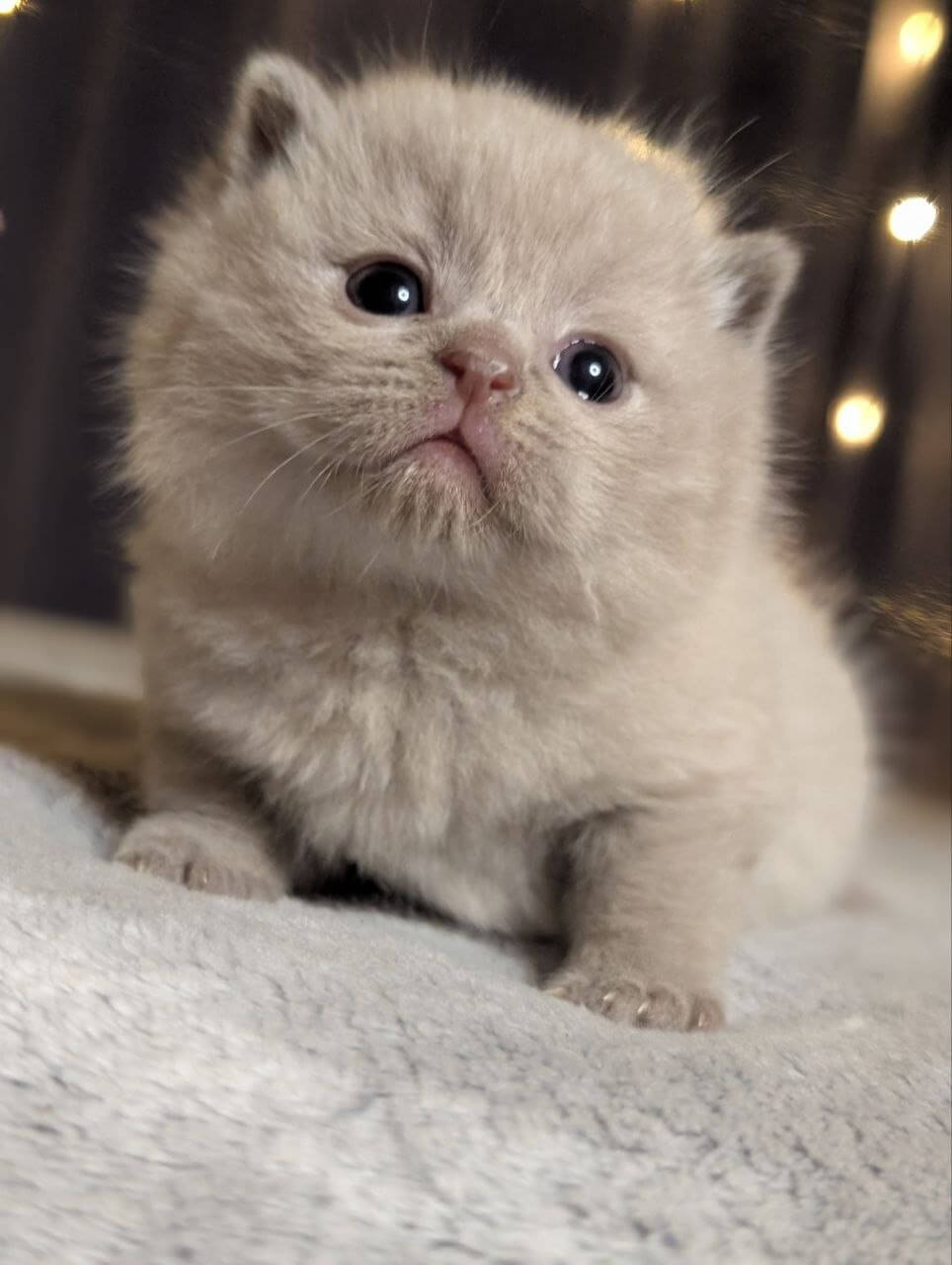 Zeus is a Lilac Scottish Straight kitten whose plush, silvery-lilac fur begs to be touched—soft as clouds gathered at dusk. When he curls by your side, you’ll notice the glow of his yellow eyes: clear, searching, and impossibly warm. His compact, gently rounded shape settles against your arm, making every encounter feel grounding and calm.