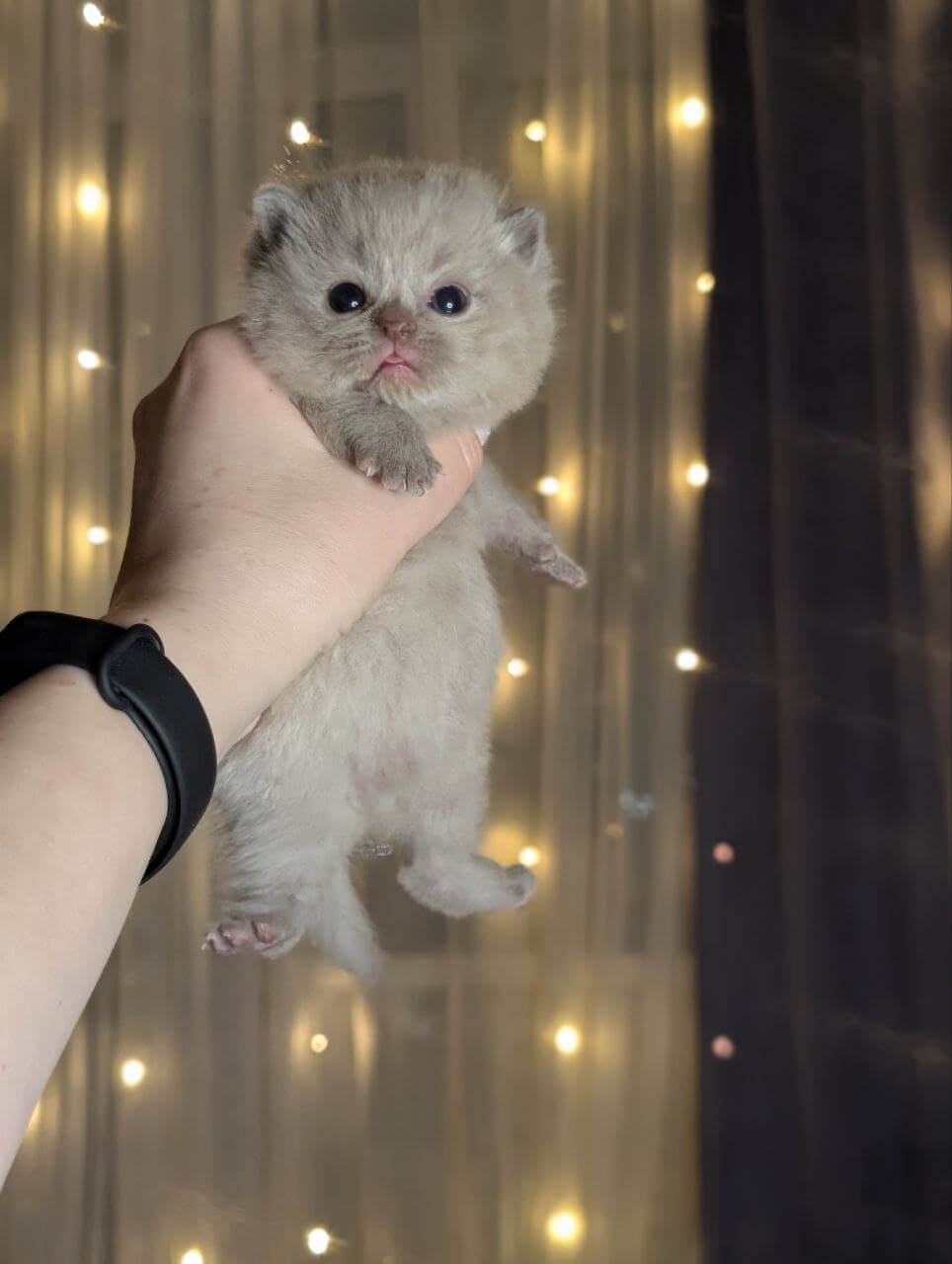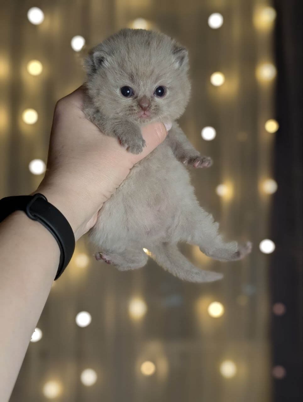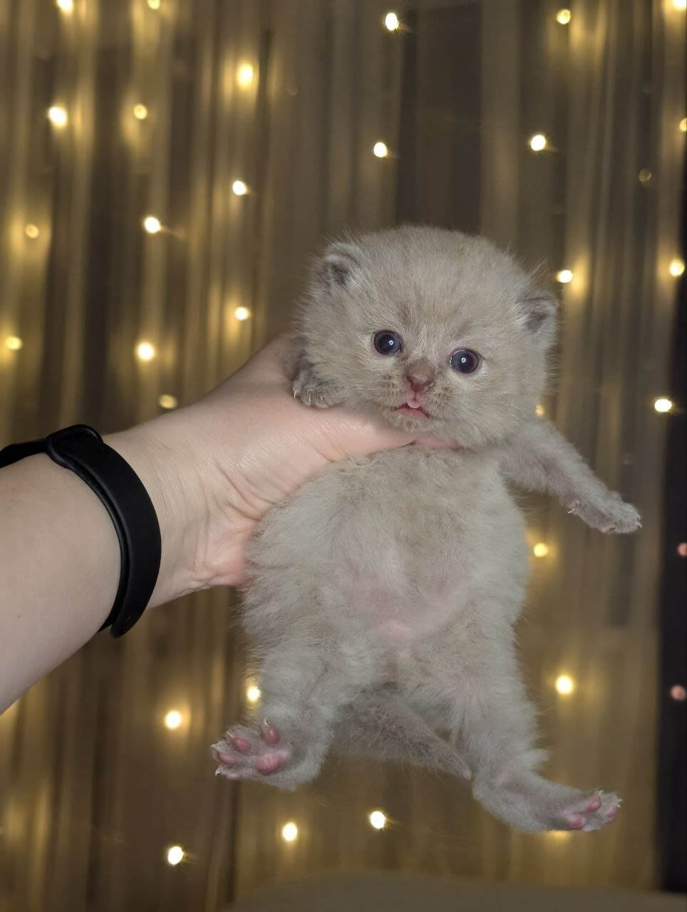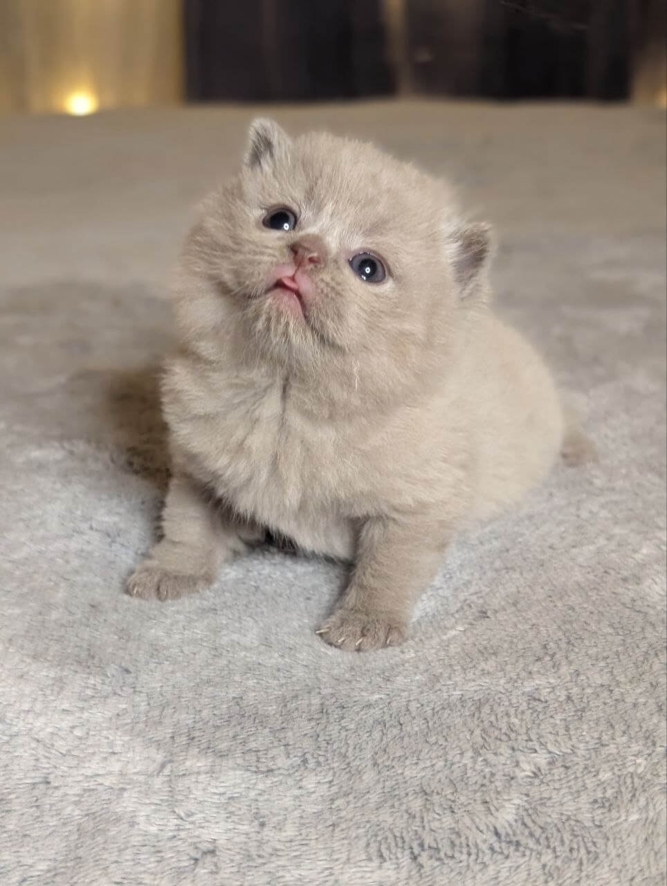 Zeus is a Lilac Scottish Straight kitten whose plush, silvery-lilac fur begs to be touched—soft as clouds gathered at dusk. When he curls by your side, you’ll notice the glow of his yellow eyes: clear, searching, and impossibly warm. His compact, gently rounded shape settles against your arm, making every encounter feel grounding and calm.
