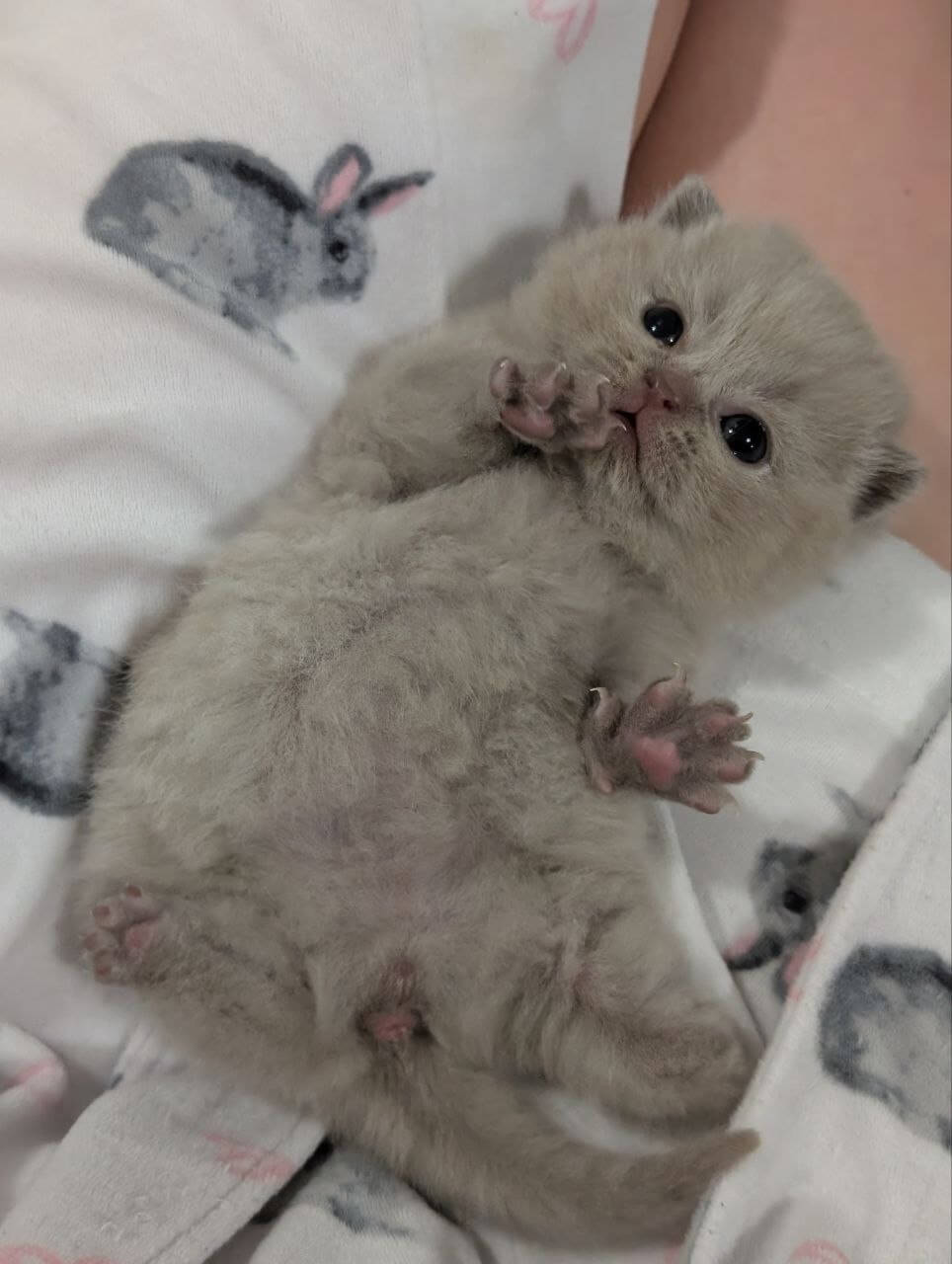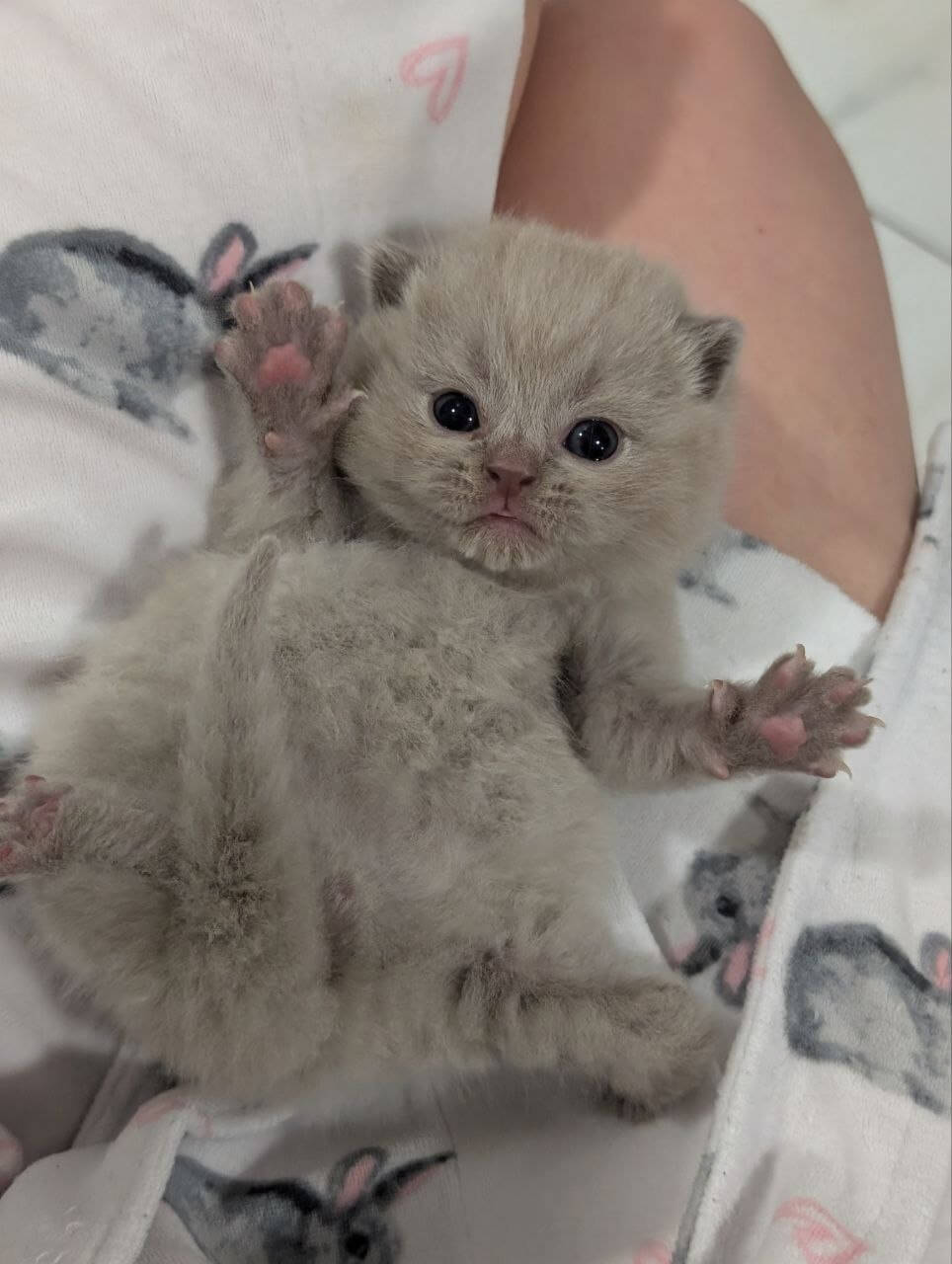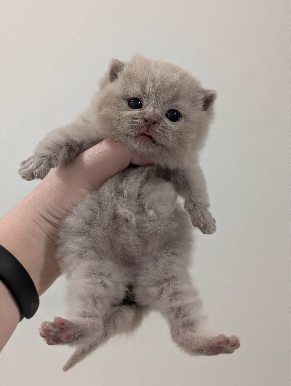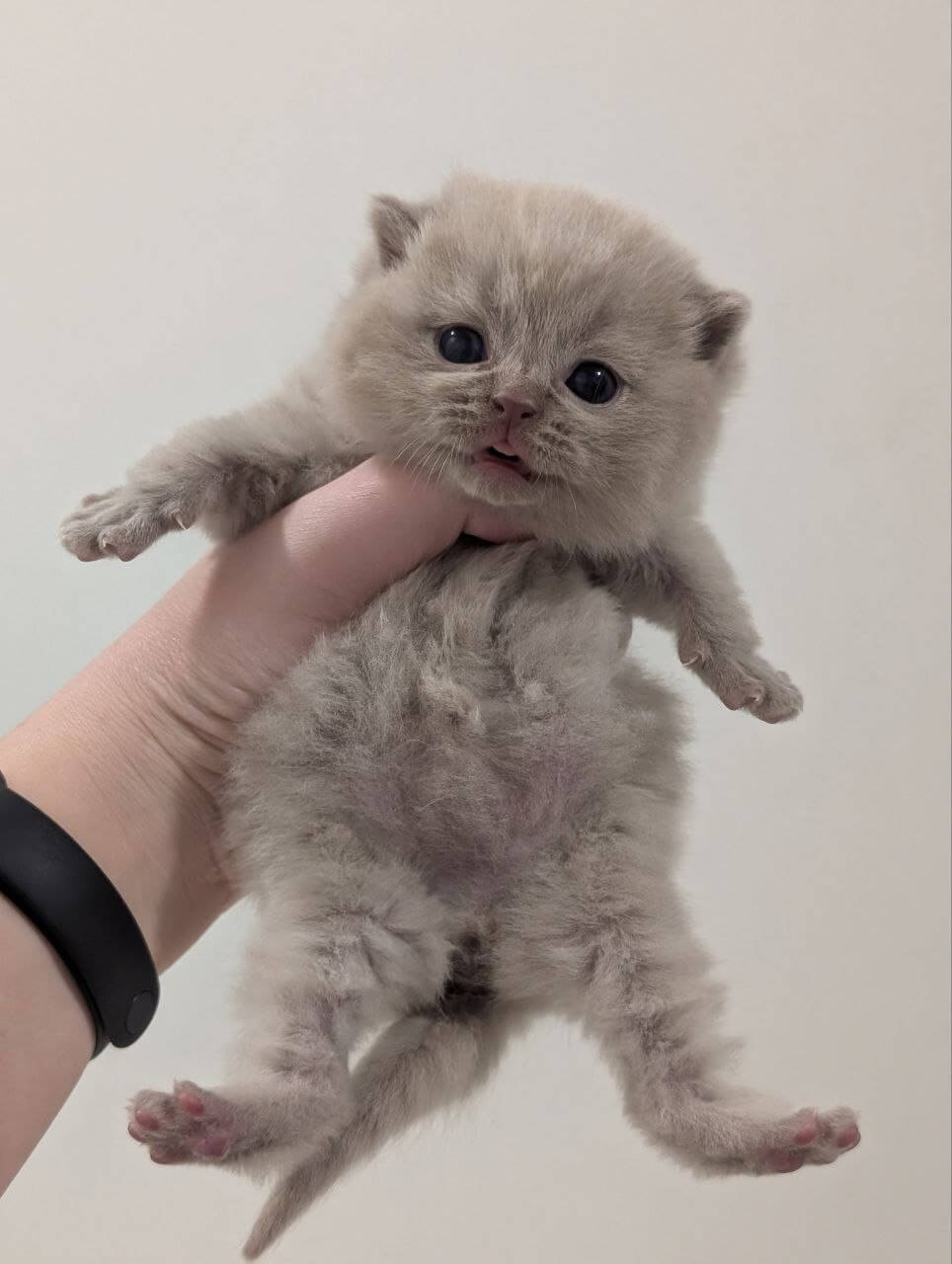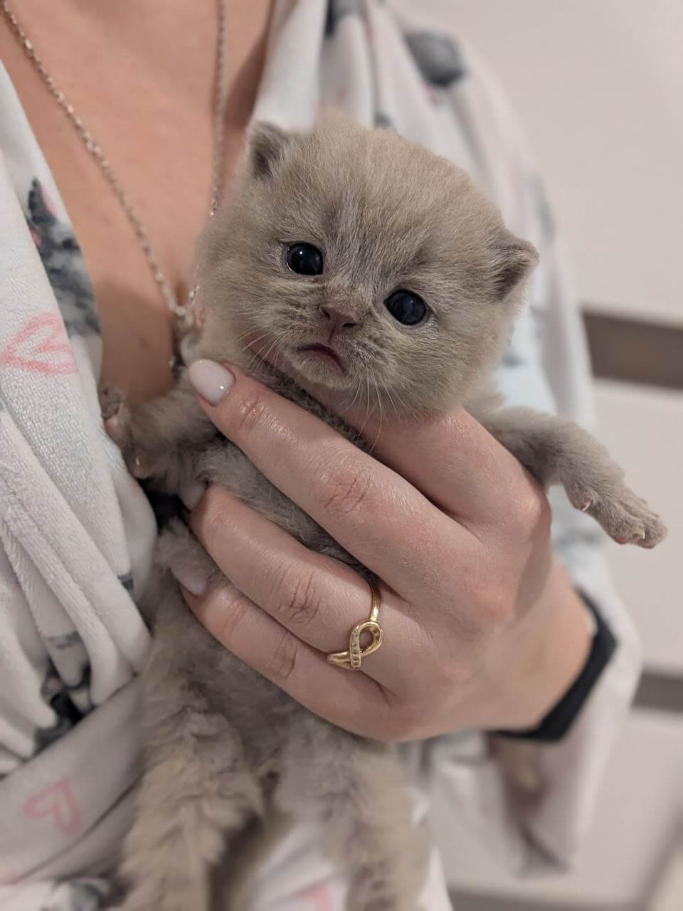 Zeus is a Lilac Scottish Straight kitten whose downy-soft coat feels like the freshest velvet. Let your fingers disappear into his silvery fur as his warm yellow eyes meet yours, offering a gentle, almost sunlit gaze. Each time you lift him, you sense a poised weight—reassuring, real, unmistakably Zeus, right there in your arms.