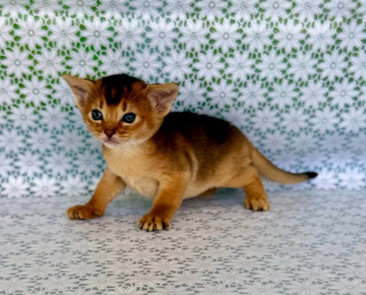 Warm your hands in the plush ruddy coat of Zhaklin, a show quality Ruddy Abyssinian kitten with the richest coppery highlights. When you meet her gaze, her striking yellow eyes catch the afternoon light, shining with a depth that only Abyssinians carry. Zhaklin’s petite form feels like silk wrapped around a lively spring—soft, compact, and endlessly huggable.